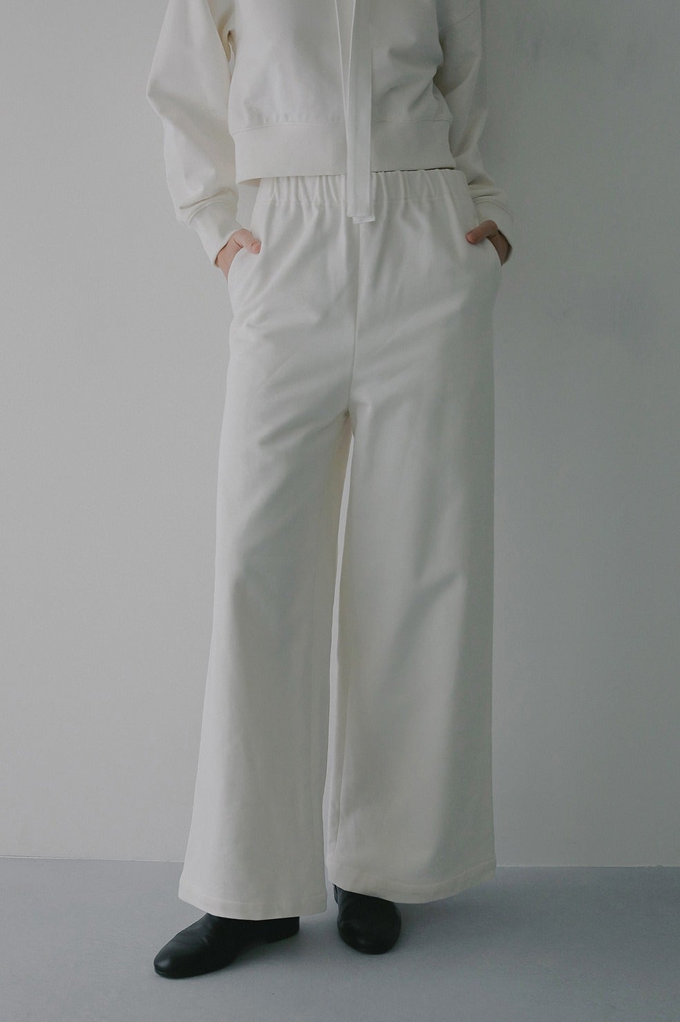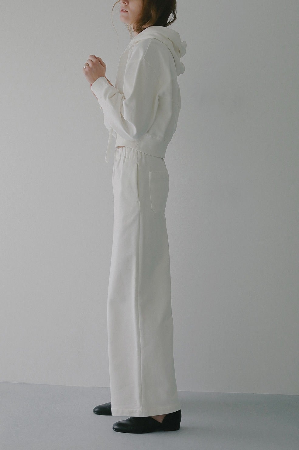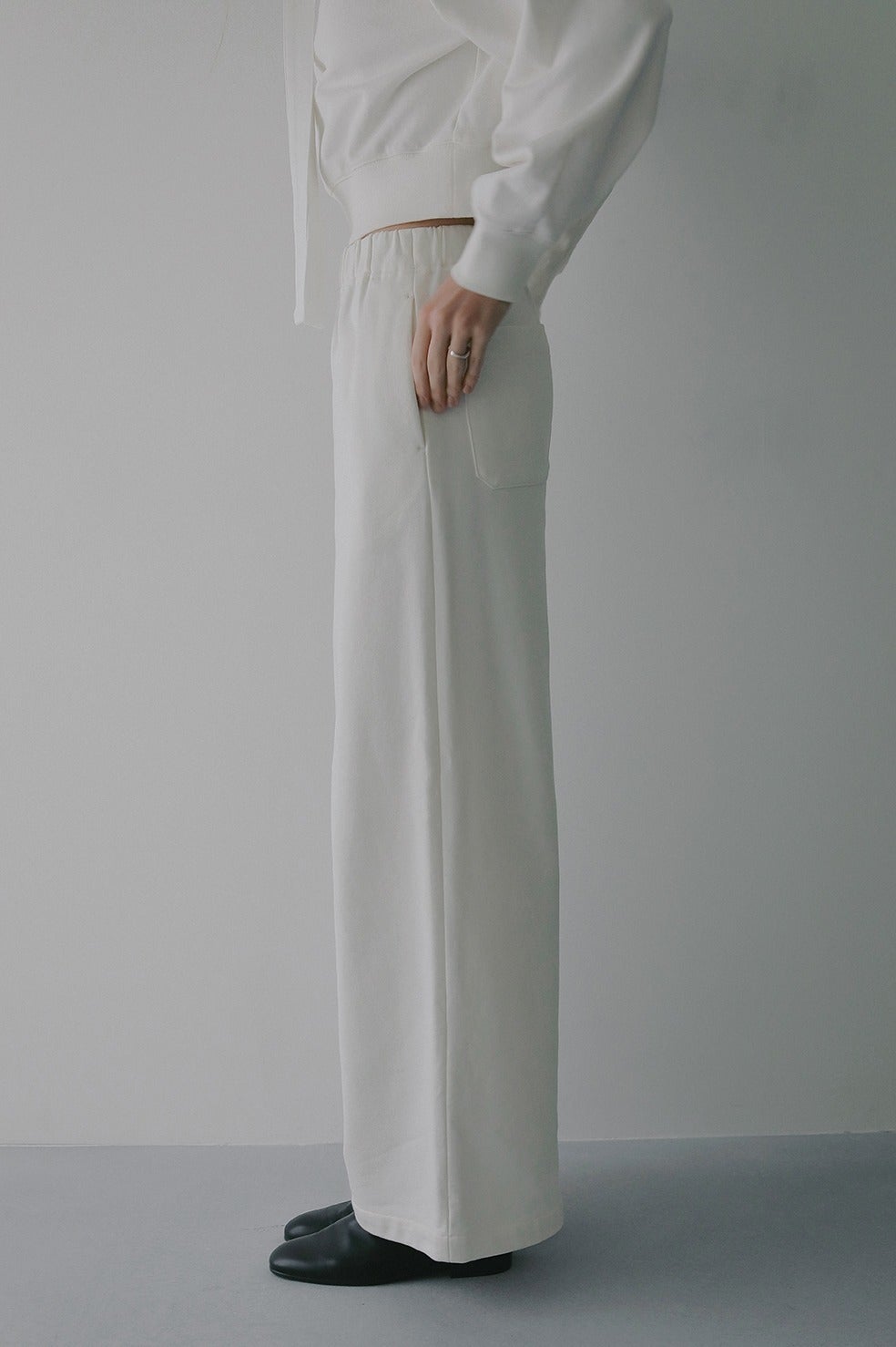 ハリがあり厚手のスウェット素材なので身体のラインを拾わないうえに、部屋着見えせずモードな印象で着ていただけます。