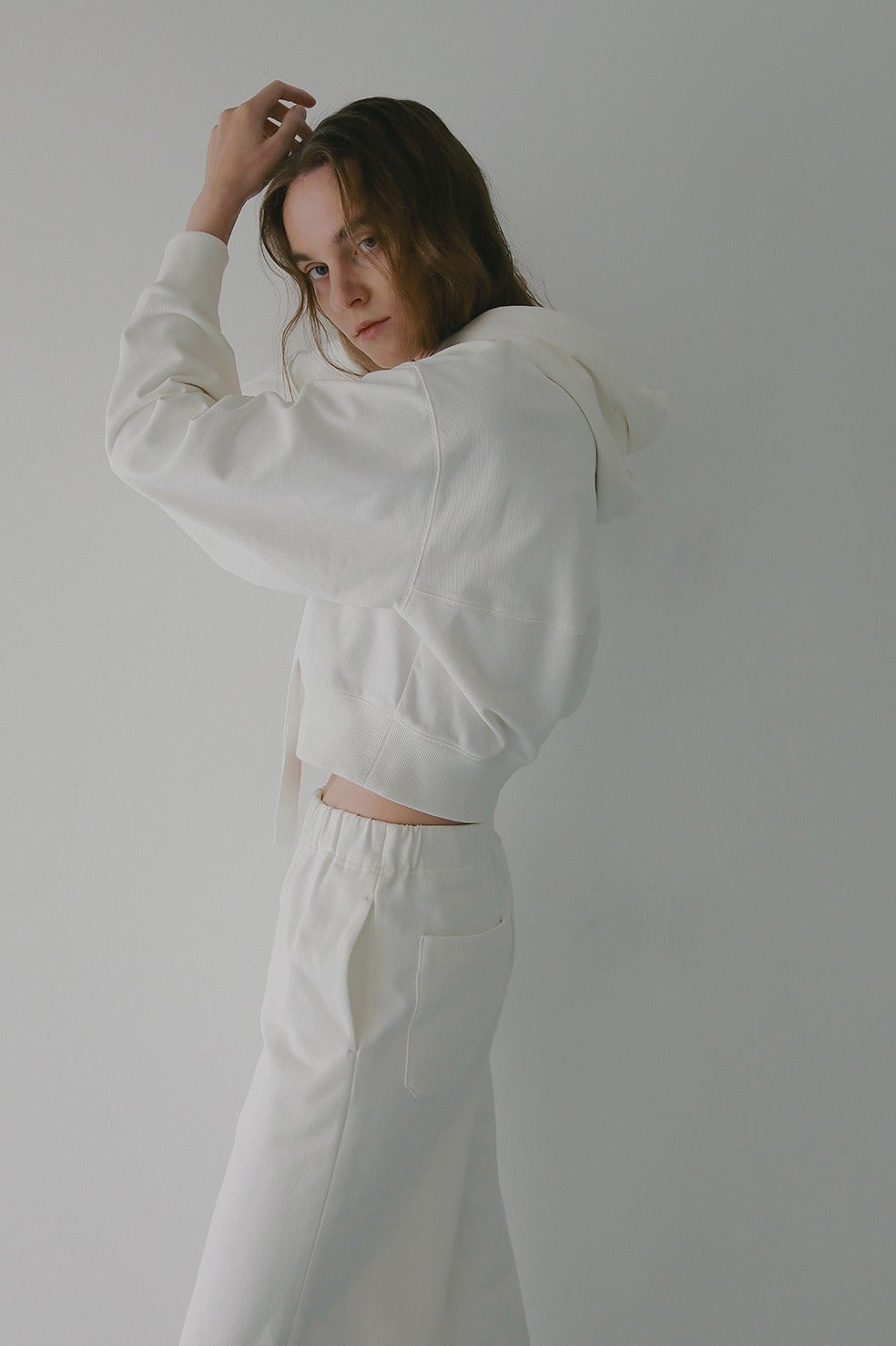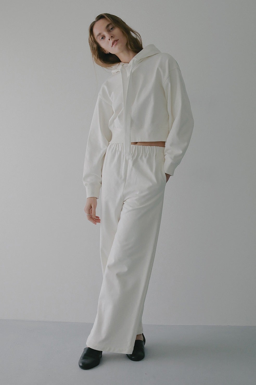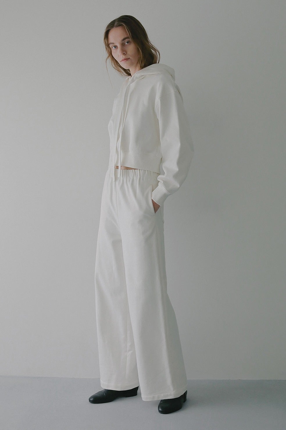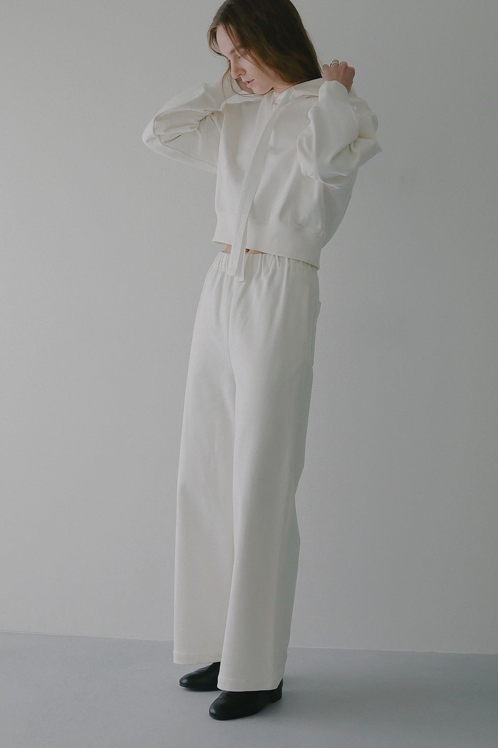 ハリがあり厚手のスウェット素材なので身体のラインを拾わないうえに、部屋着見えせずモードな印象で着ていただけます。