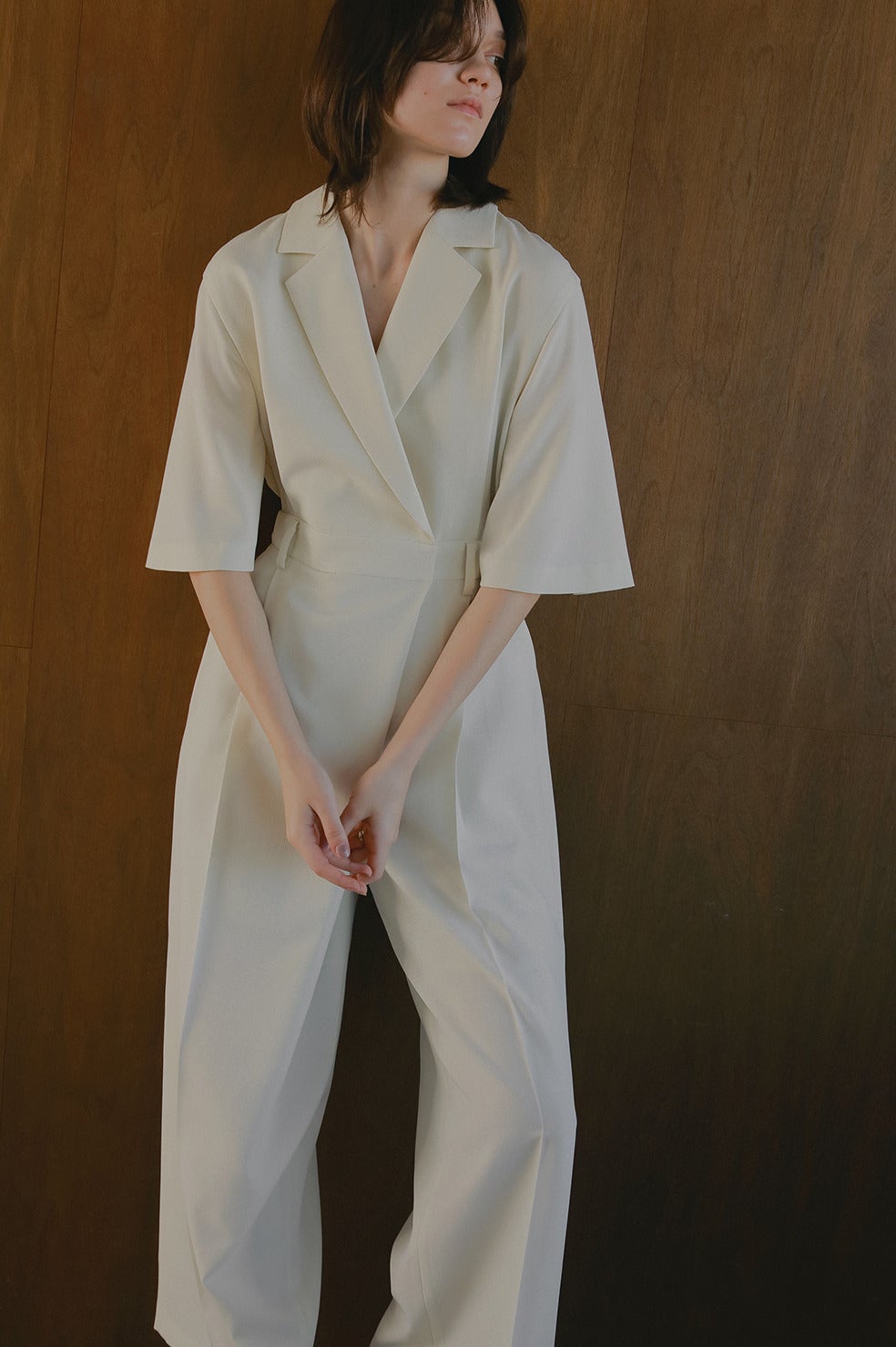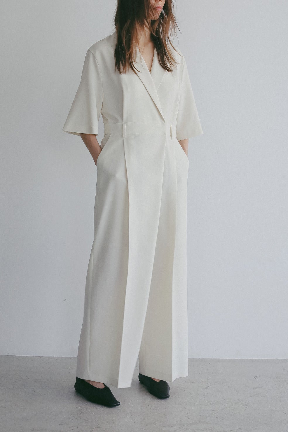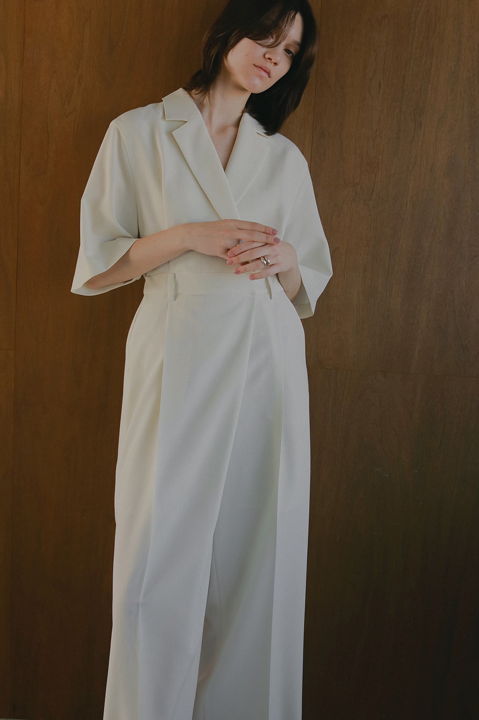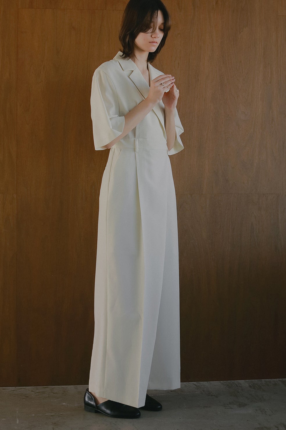 テーラードカラーのマニッシュムード漂うオールインワン。