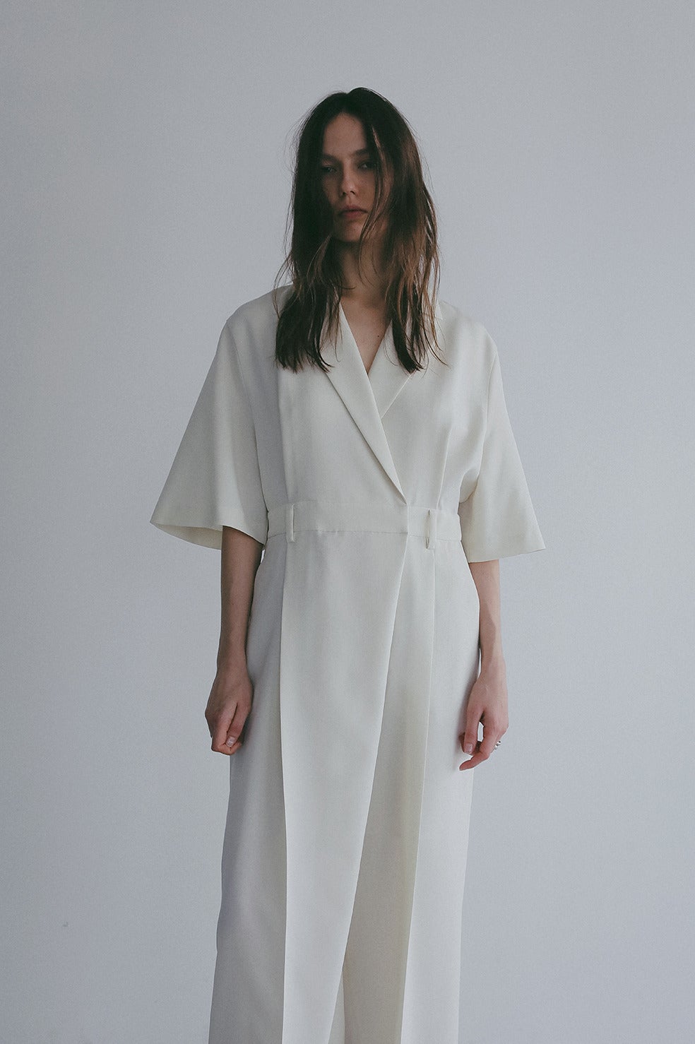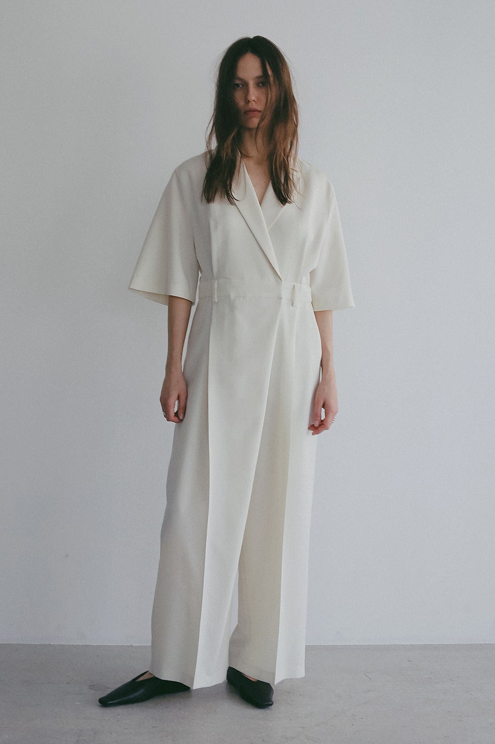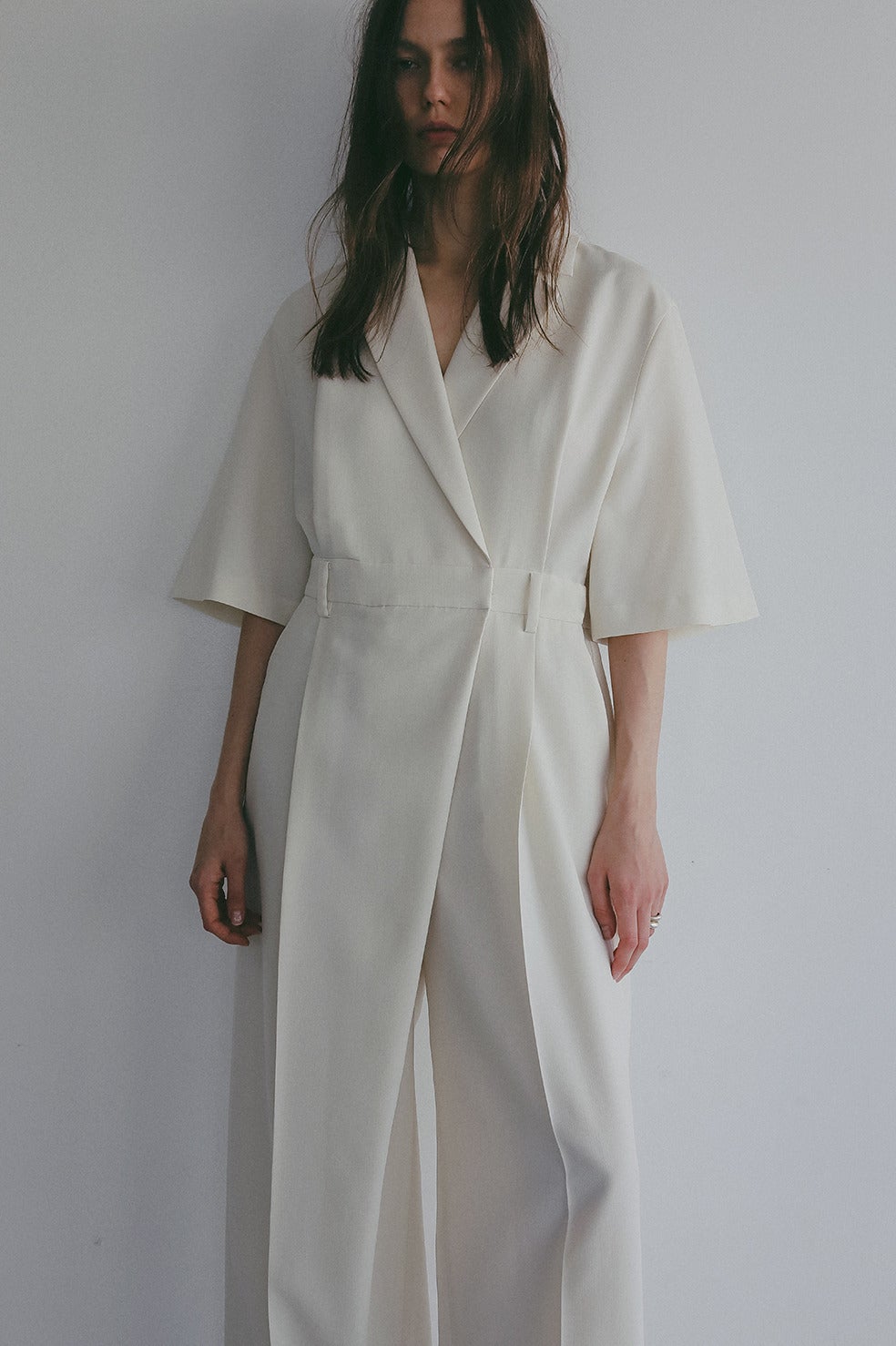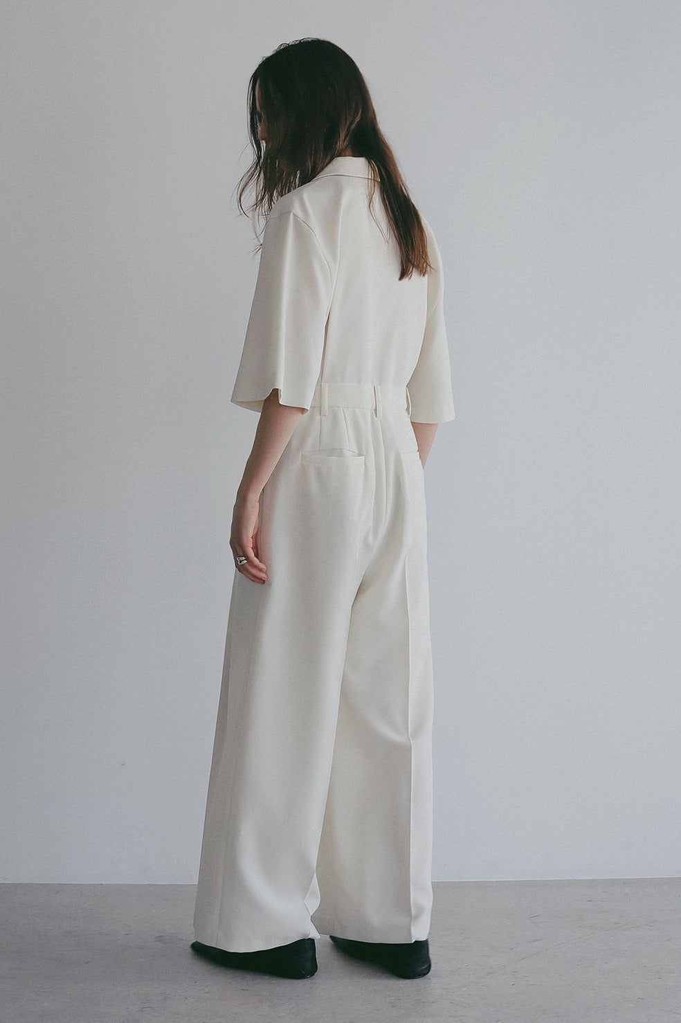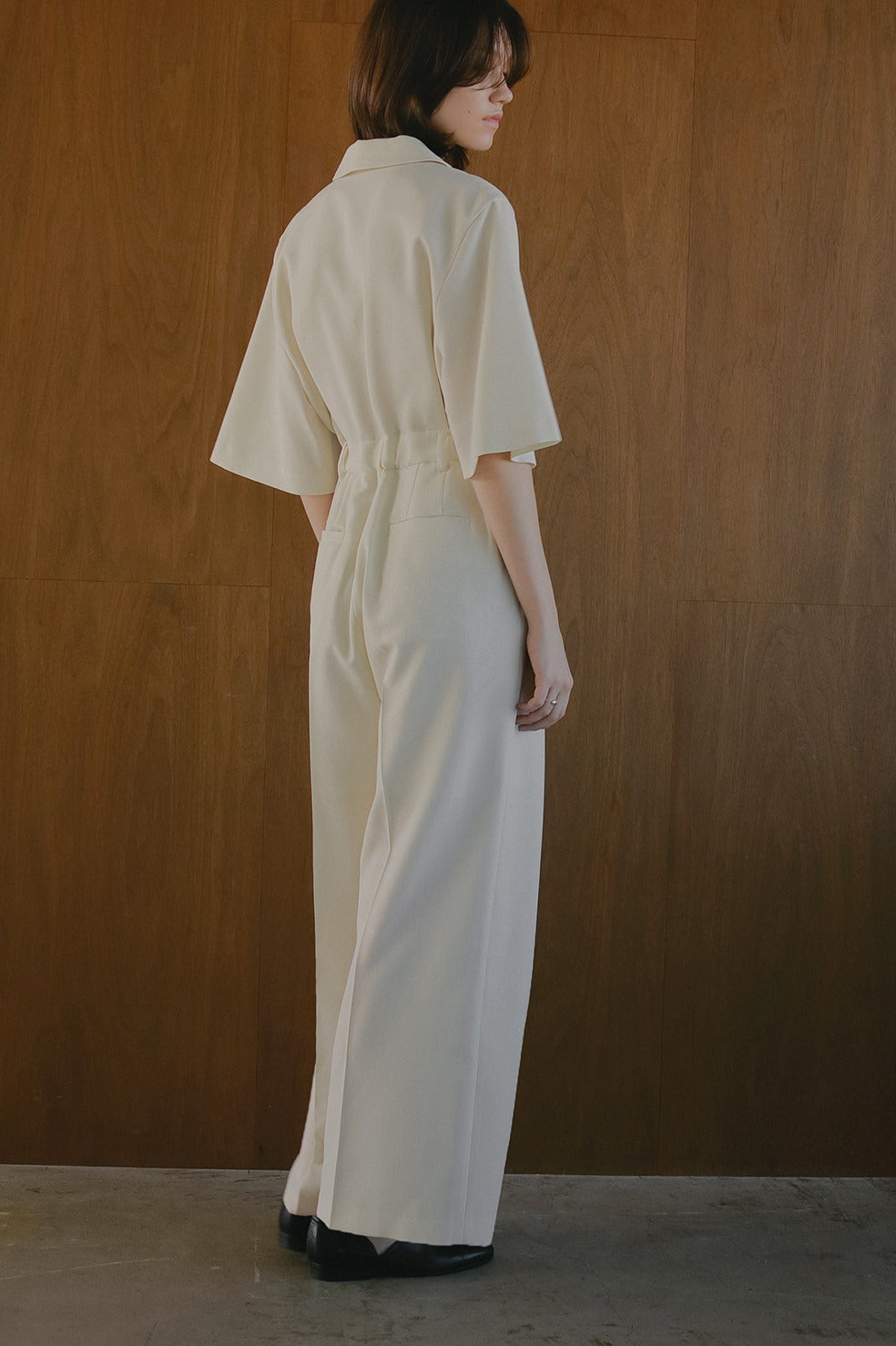 テーラードカラーのマニッシュムード漂うオールインワン。