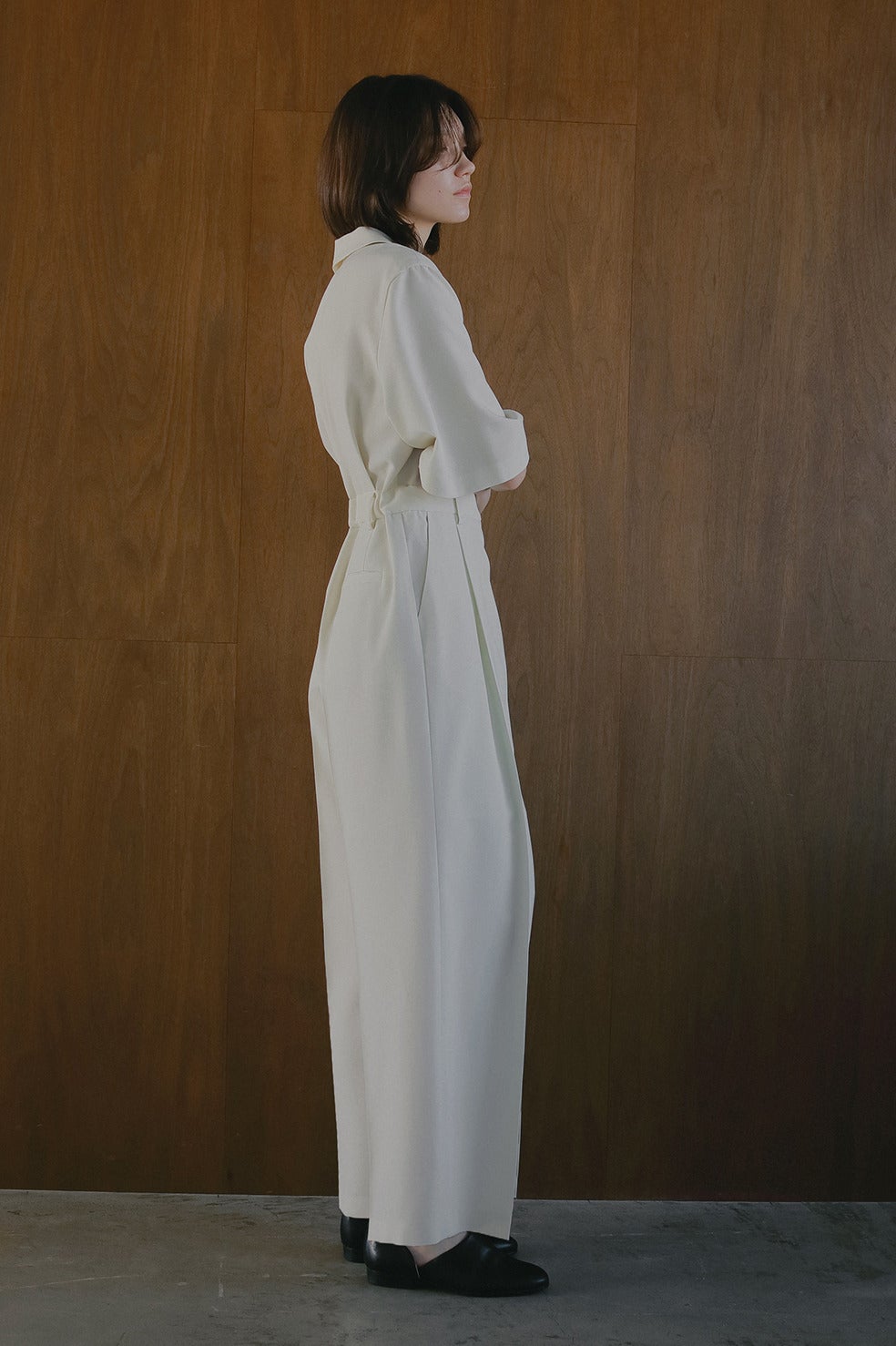 センタープレスとウエストタックが生み出す立体感ですっきりとした美シルエットに。