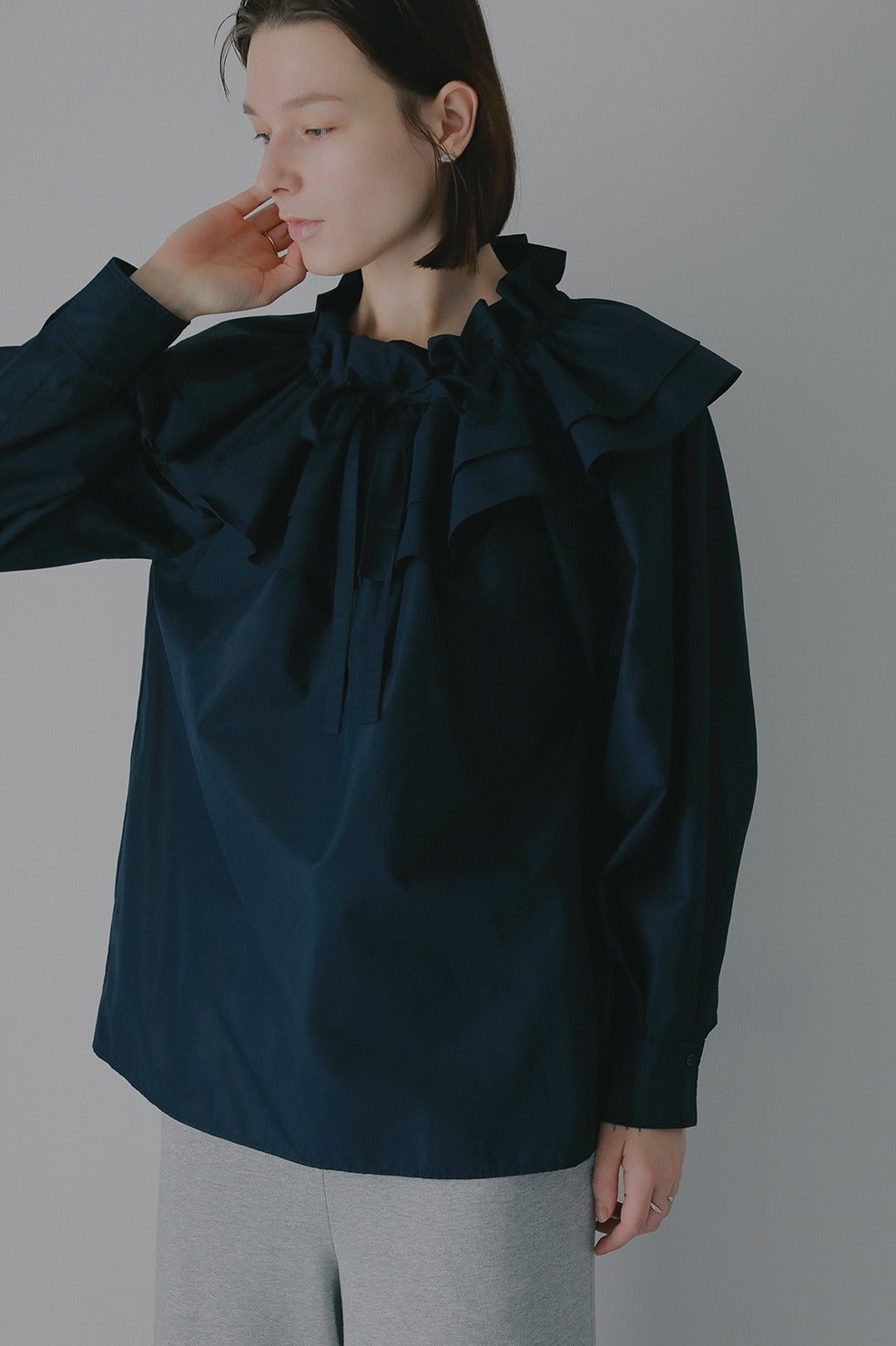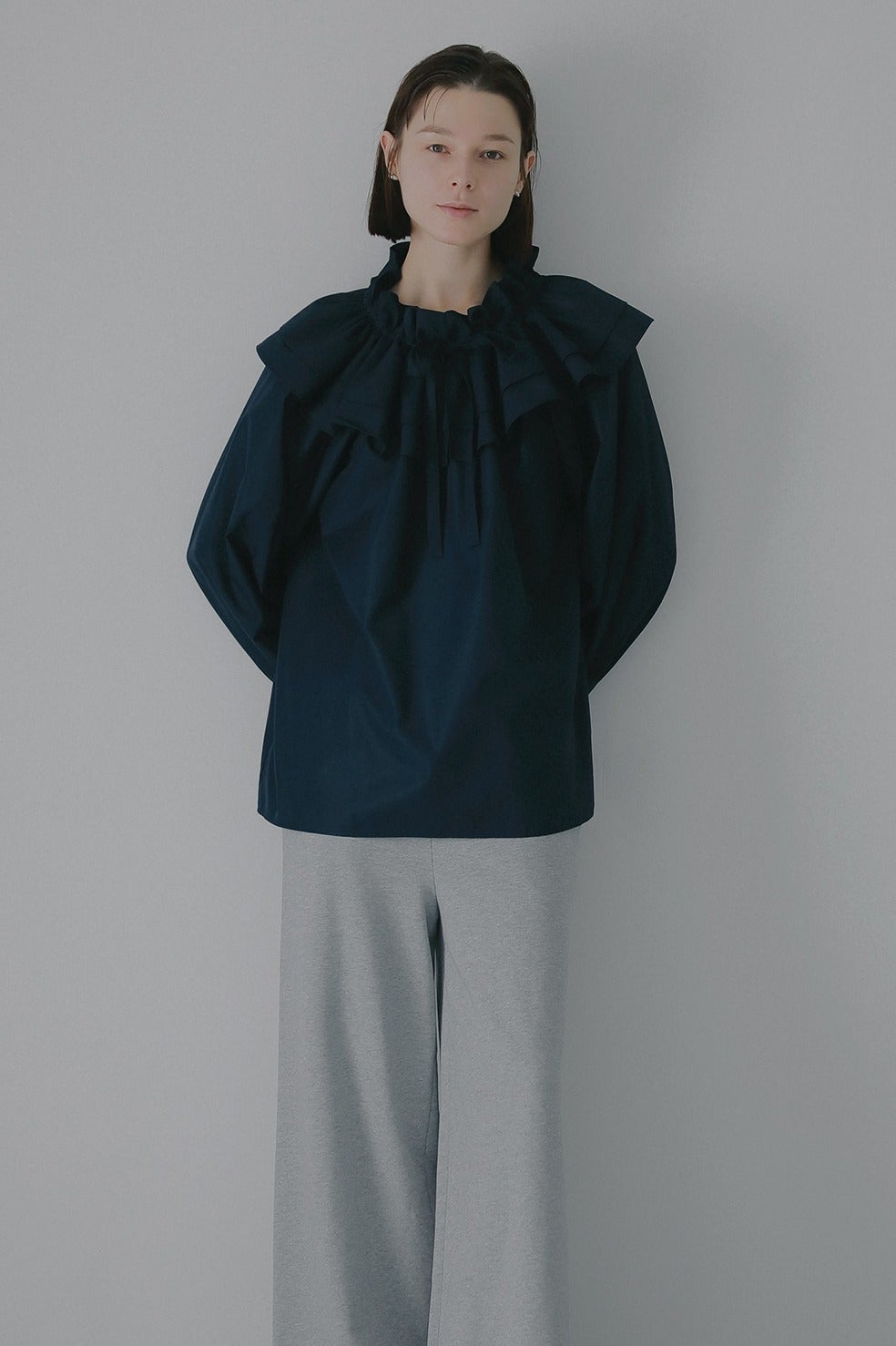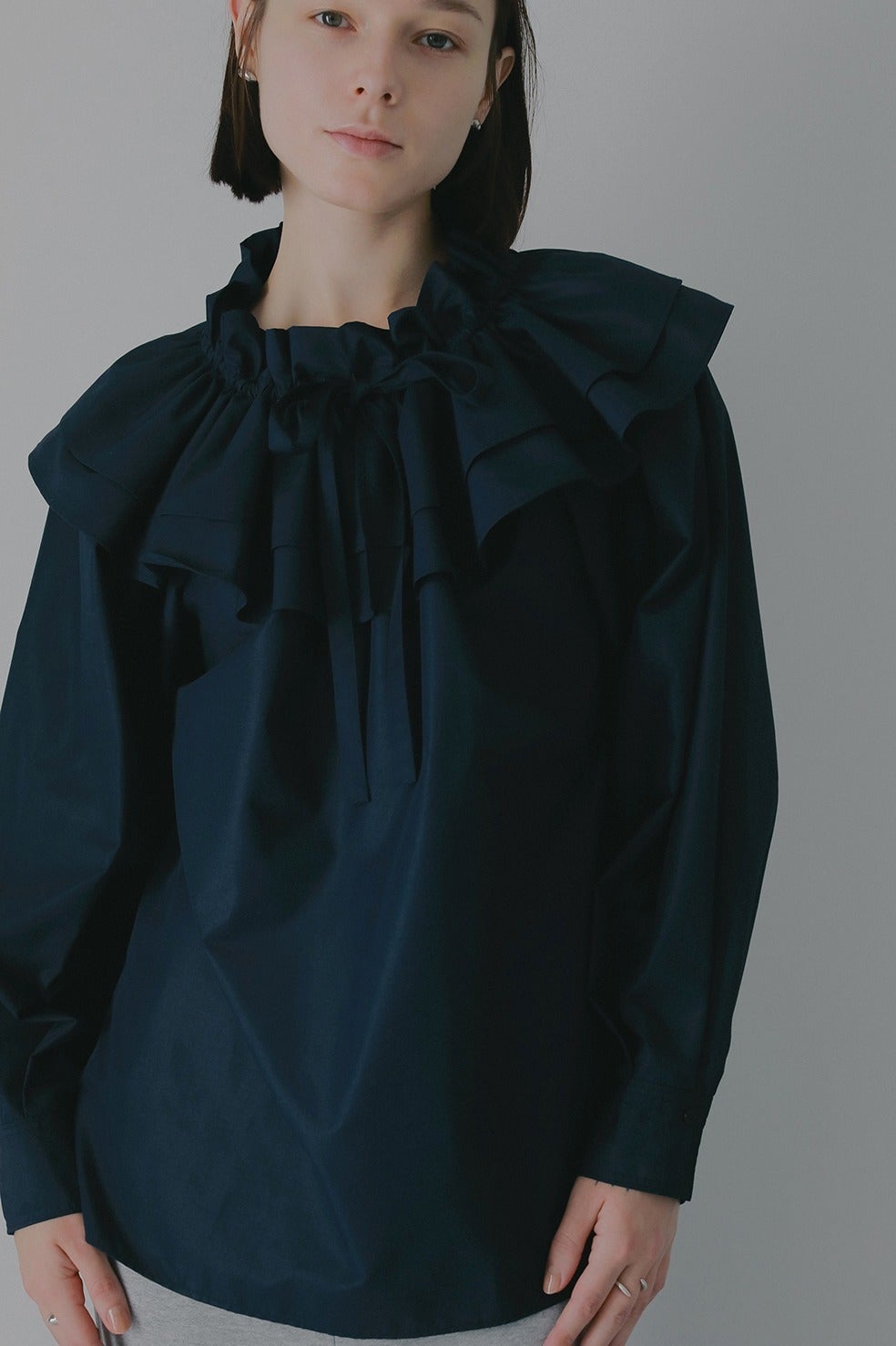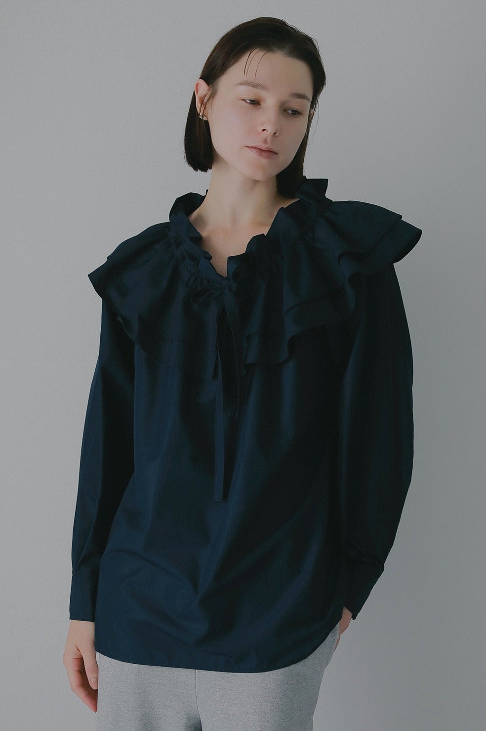 ボリュームのあるフリル襟が特徴的なプルオーバーブラウス。