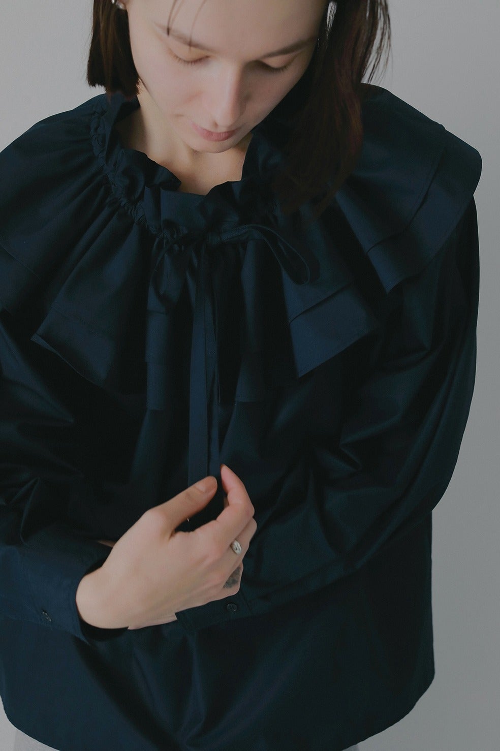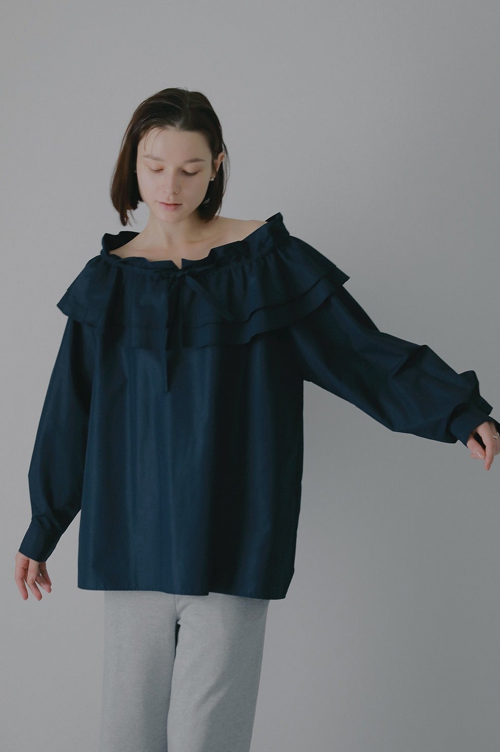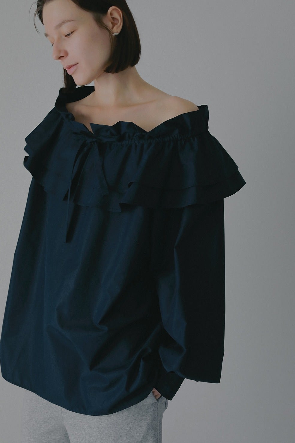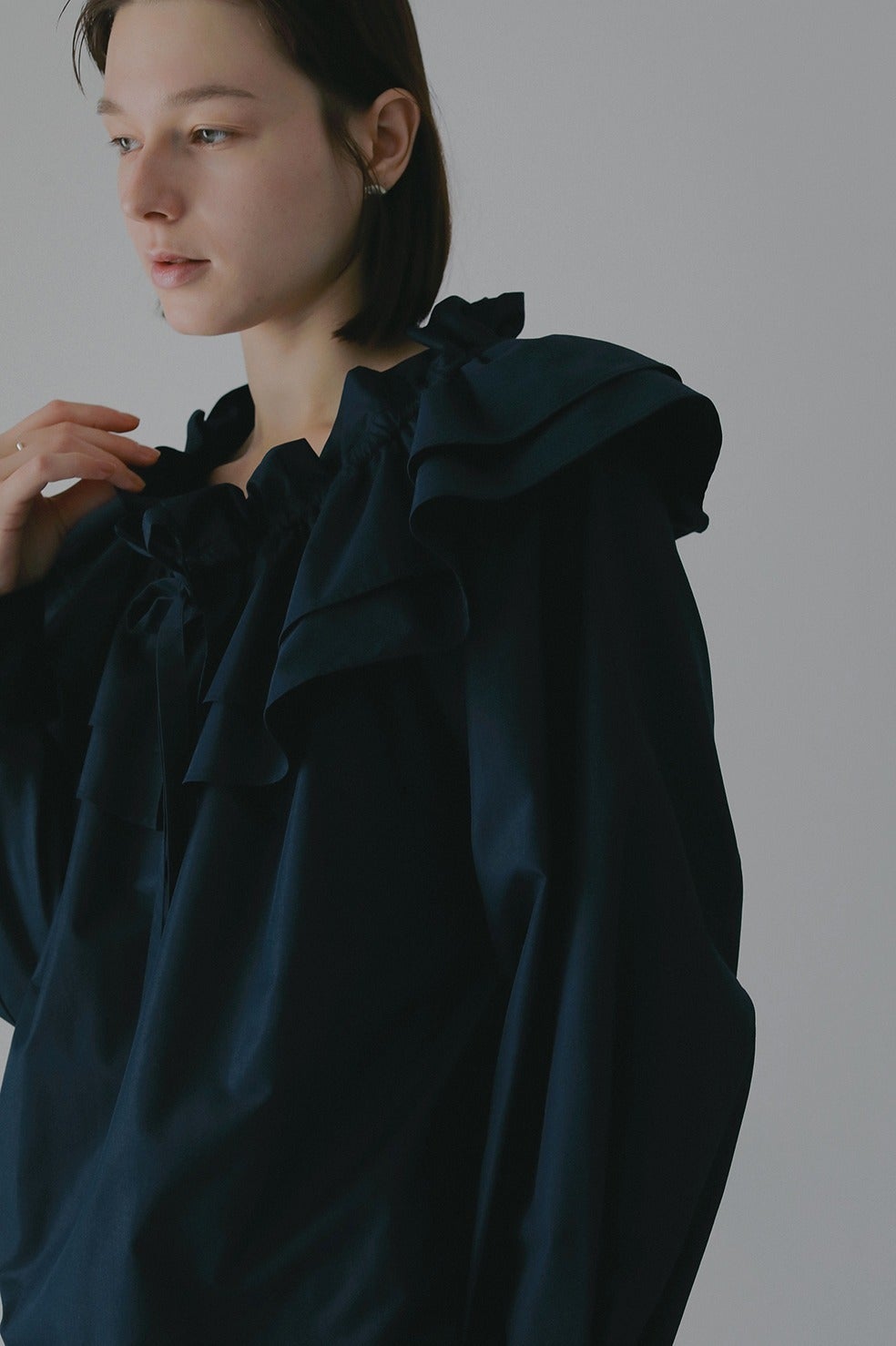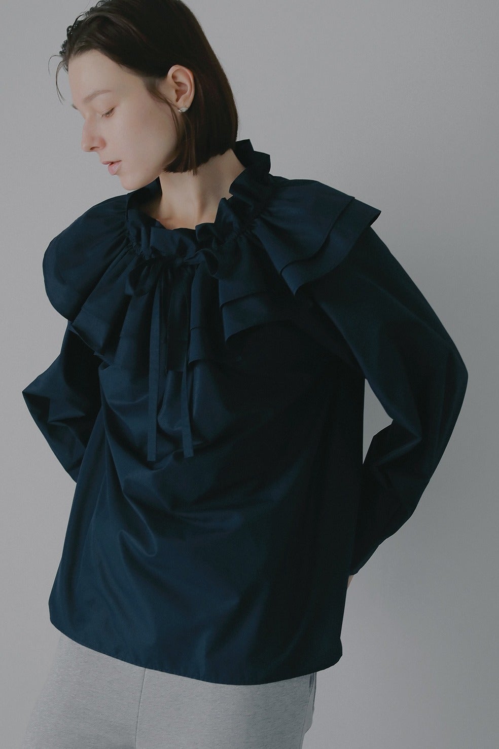 ボリュームのあるフリル襟が特徴的なプルオーバーブラウス。