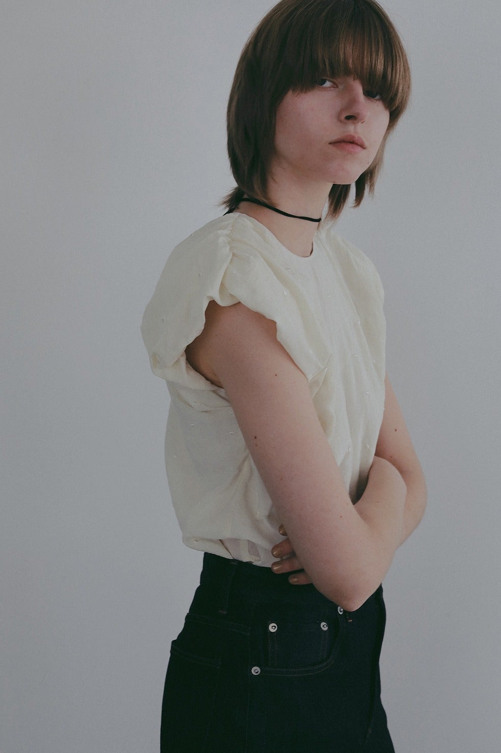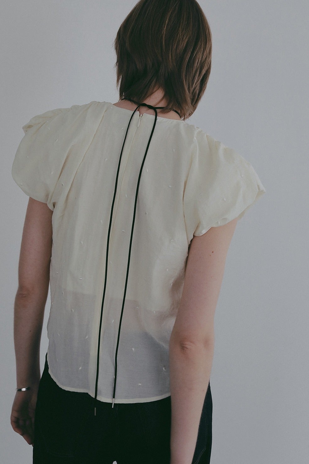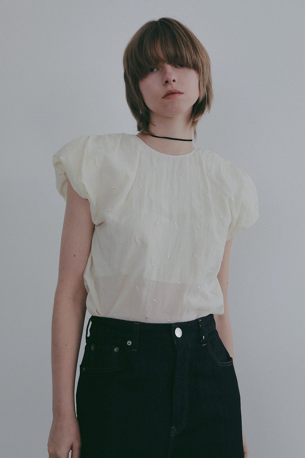 肩まわりにギャザーを寄せ、自然な動きとボリュームを持たせたデザイン。