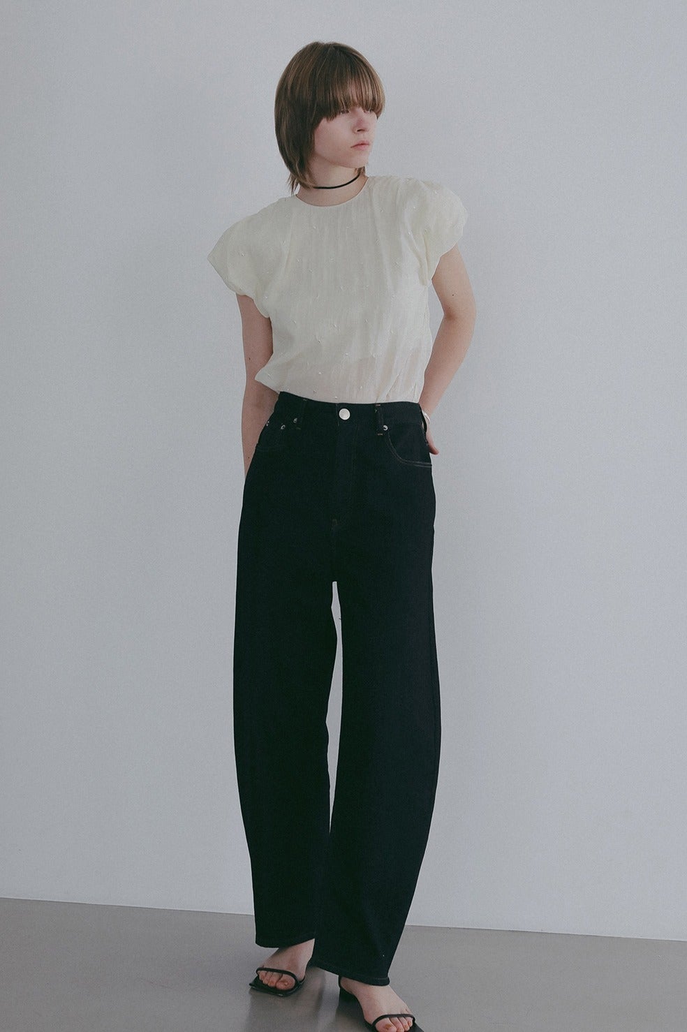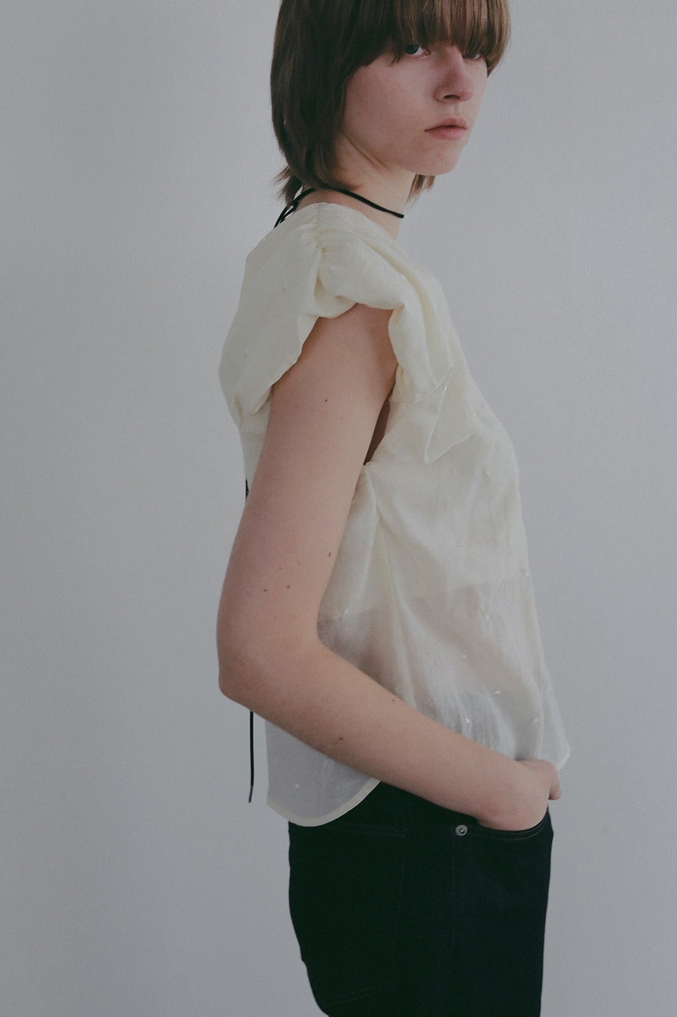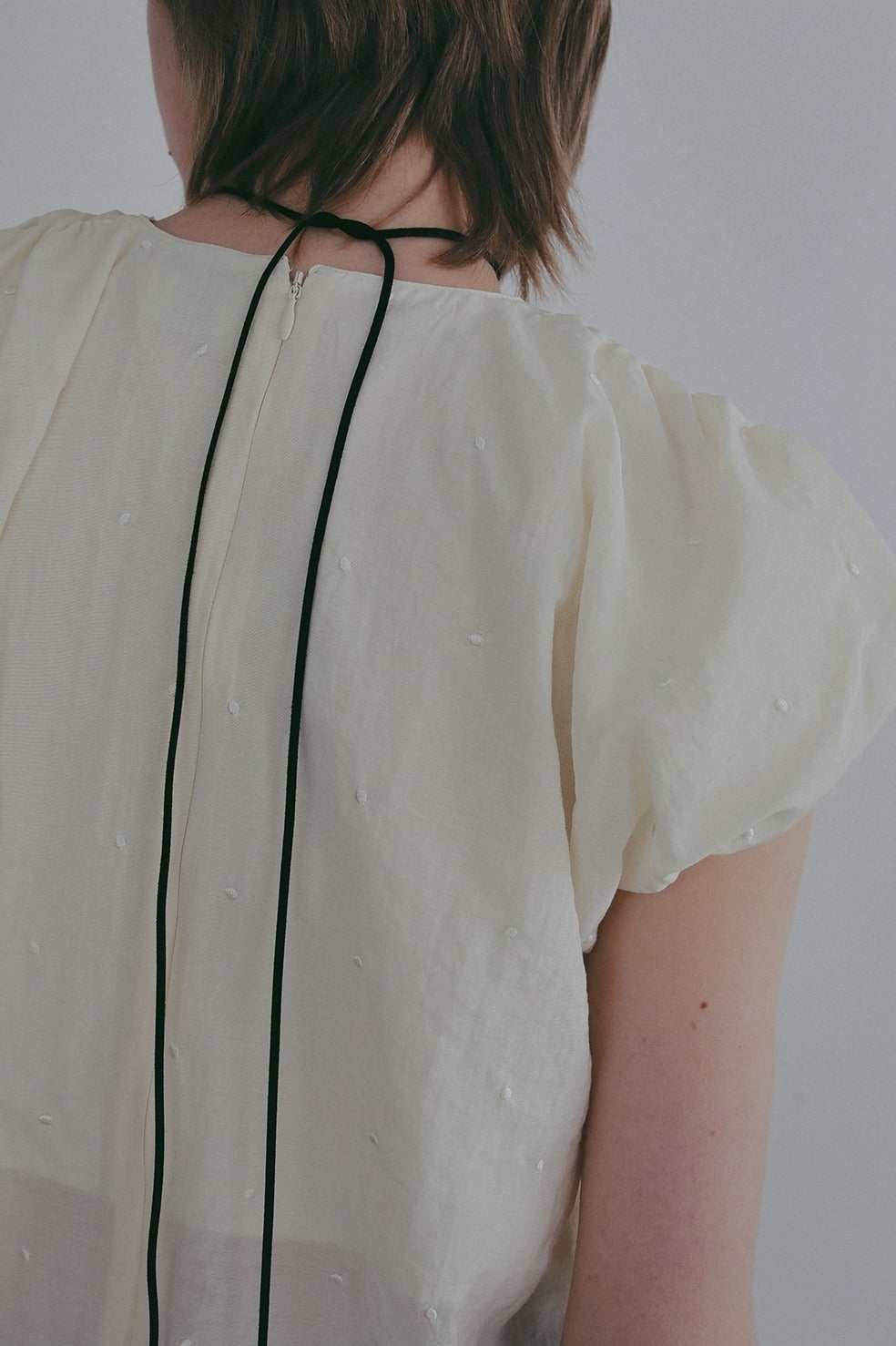 肩まわりにギャザーを寄せ、自然な動きとボリュームを持たせたデザイン。