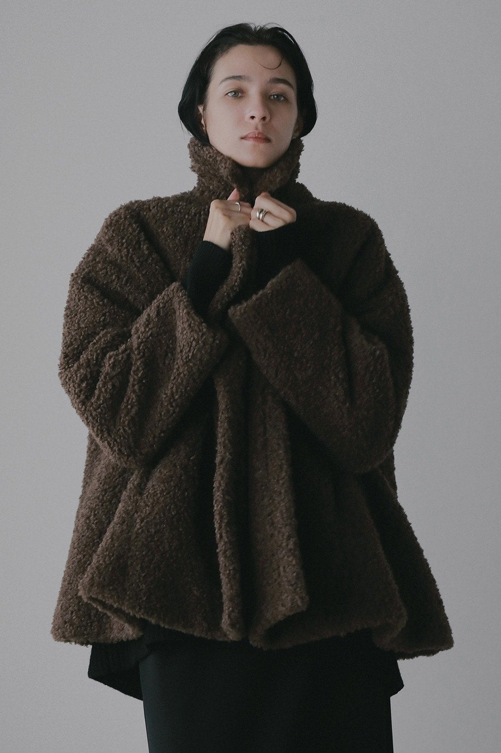フレアシルエットがポンチョのような見映えでバランス良く着ていただけます。