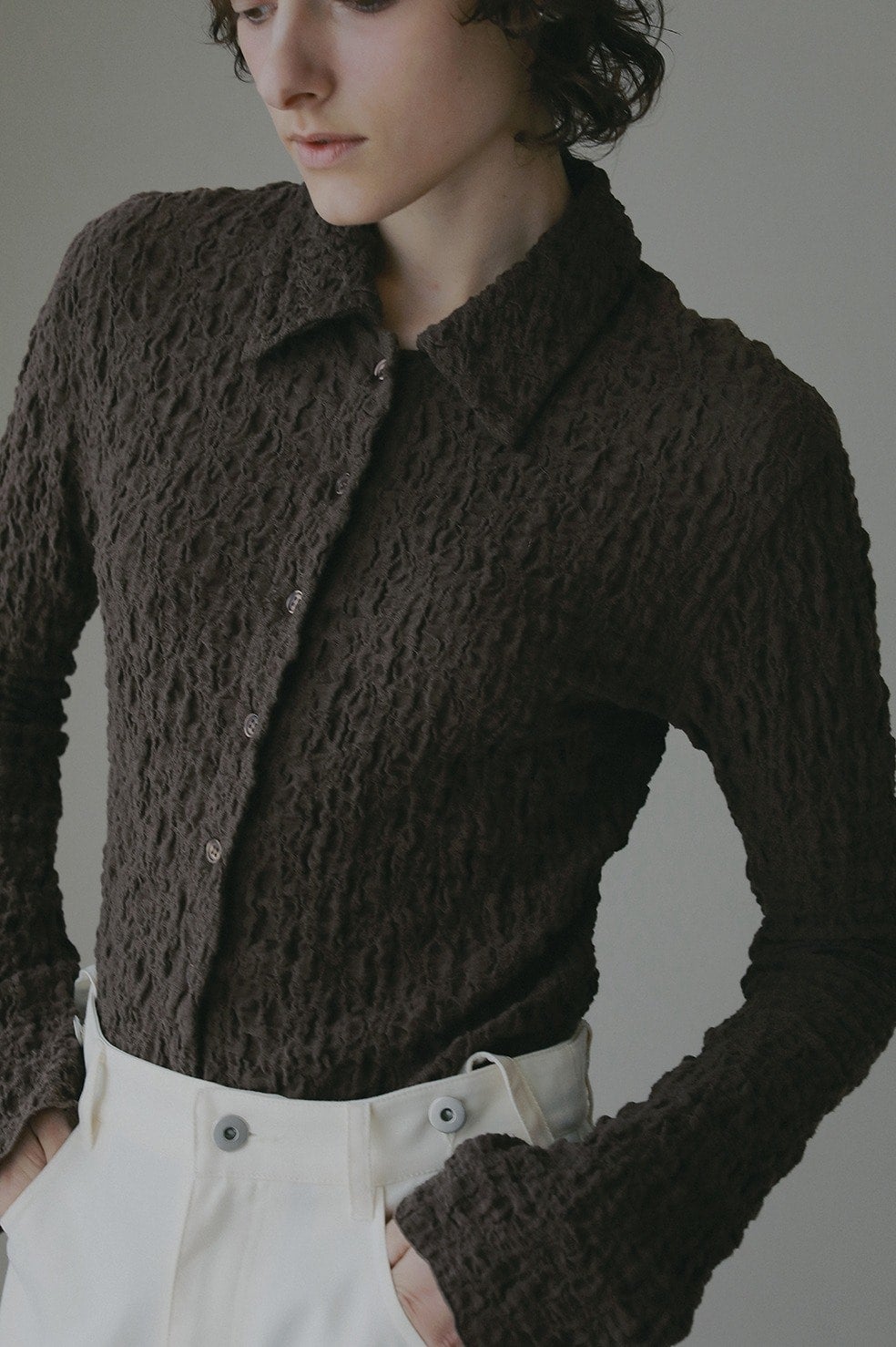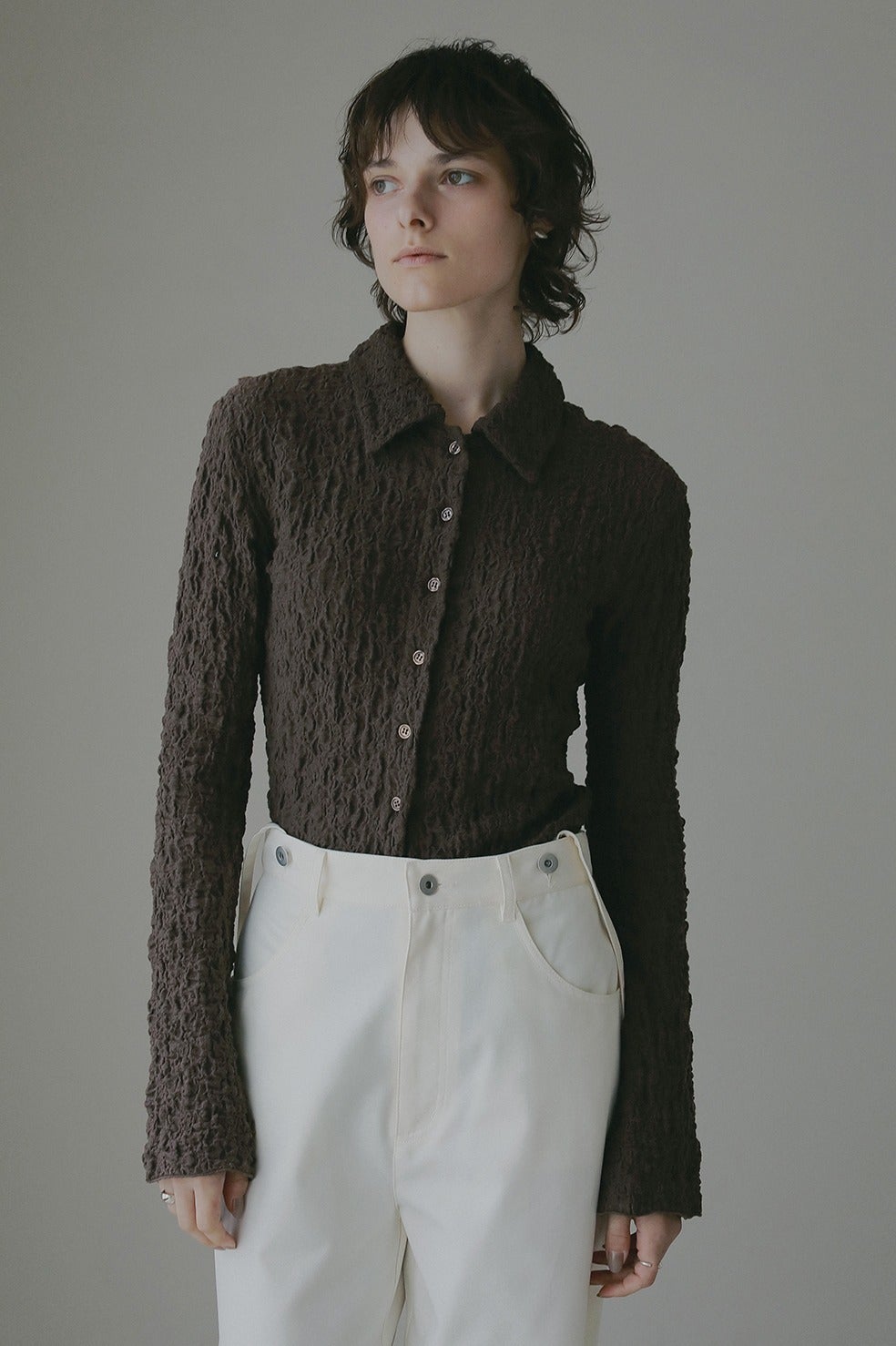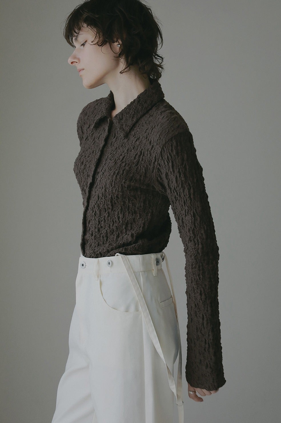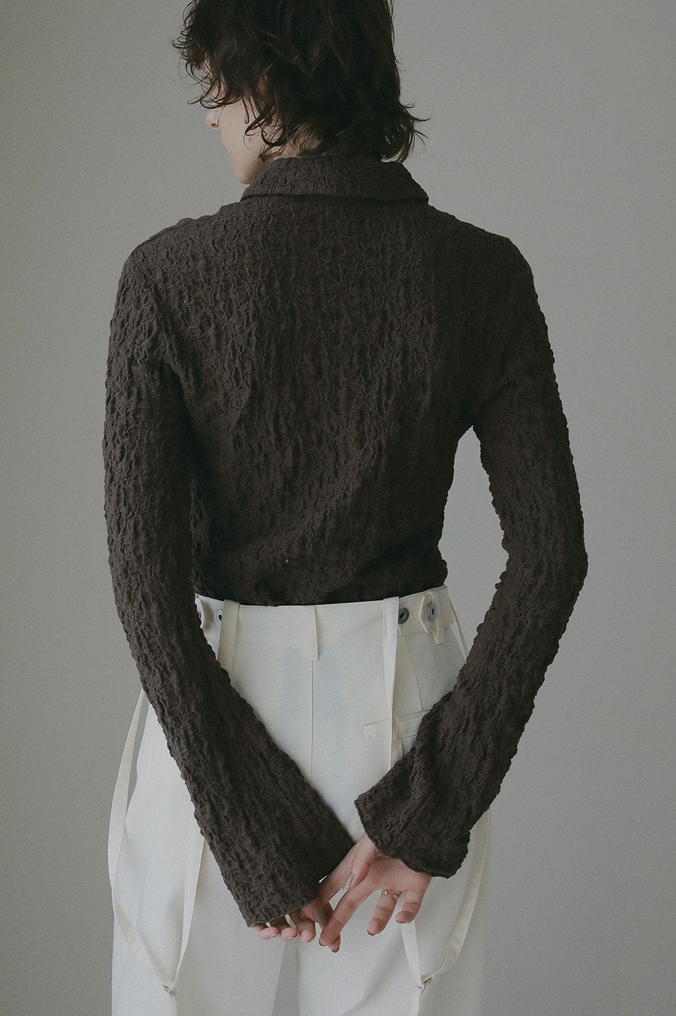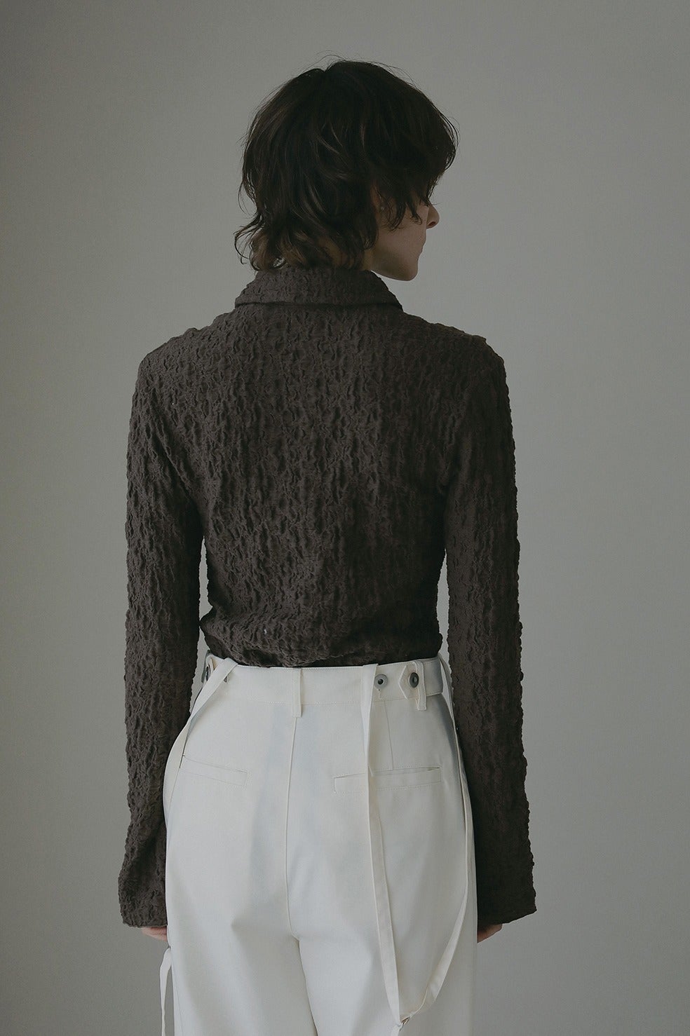 凹凸感のあるカットソー素材を使用したトップス。