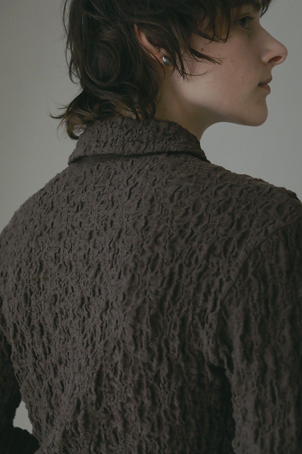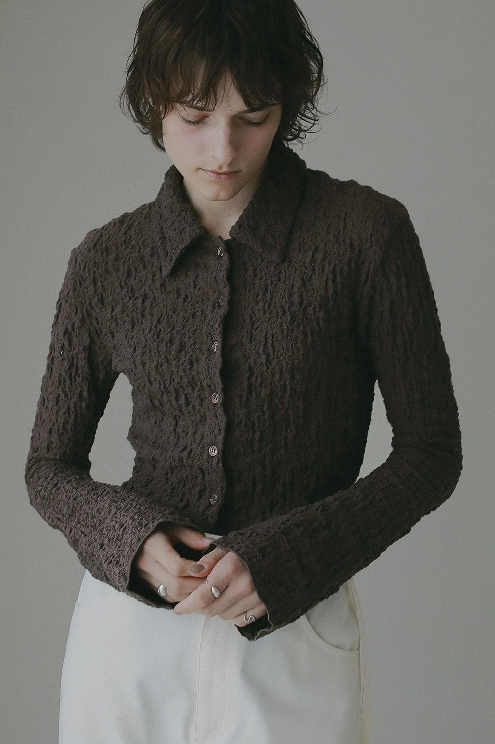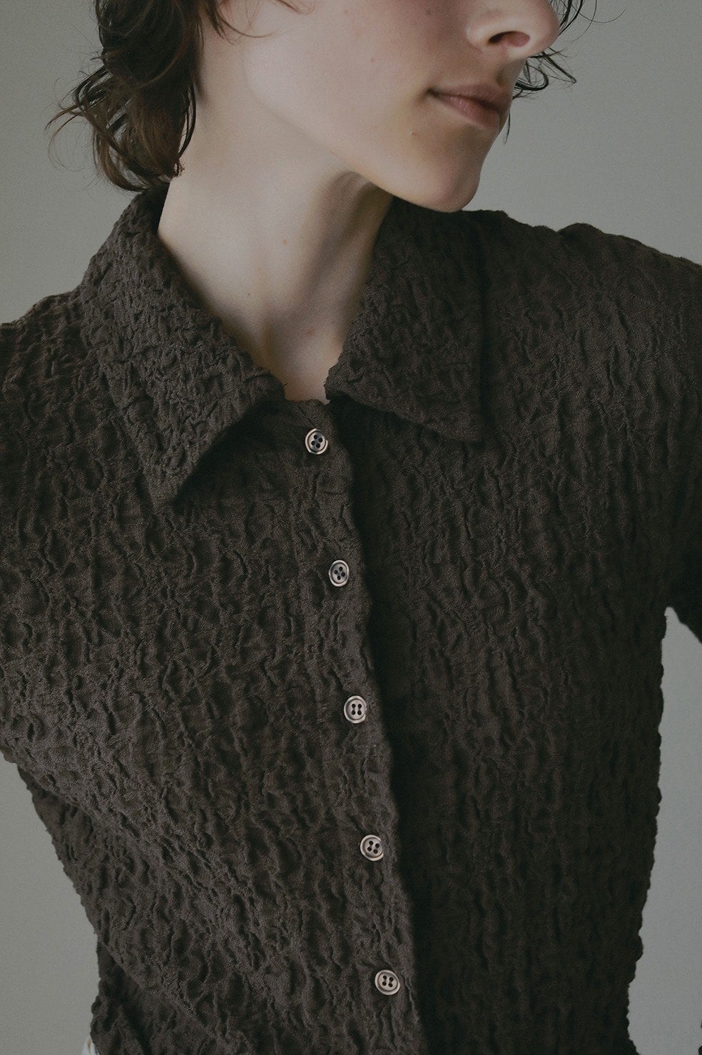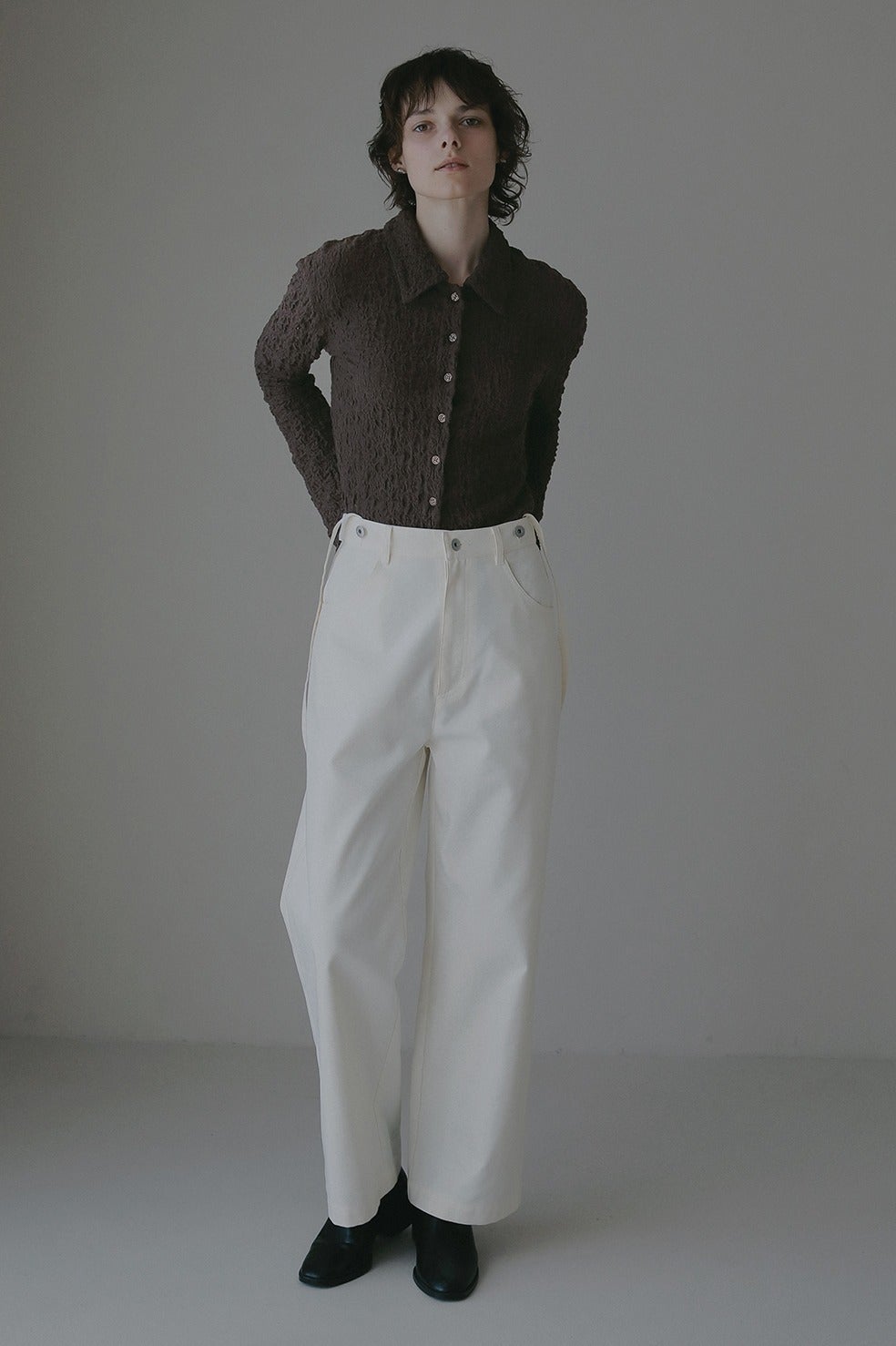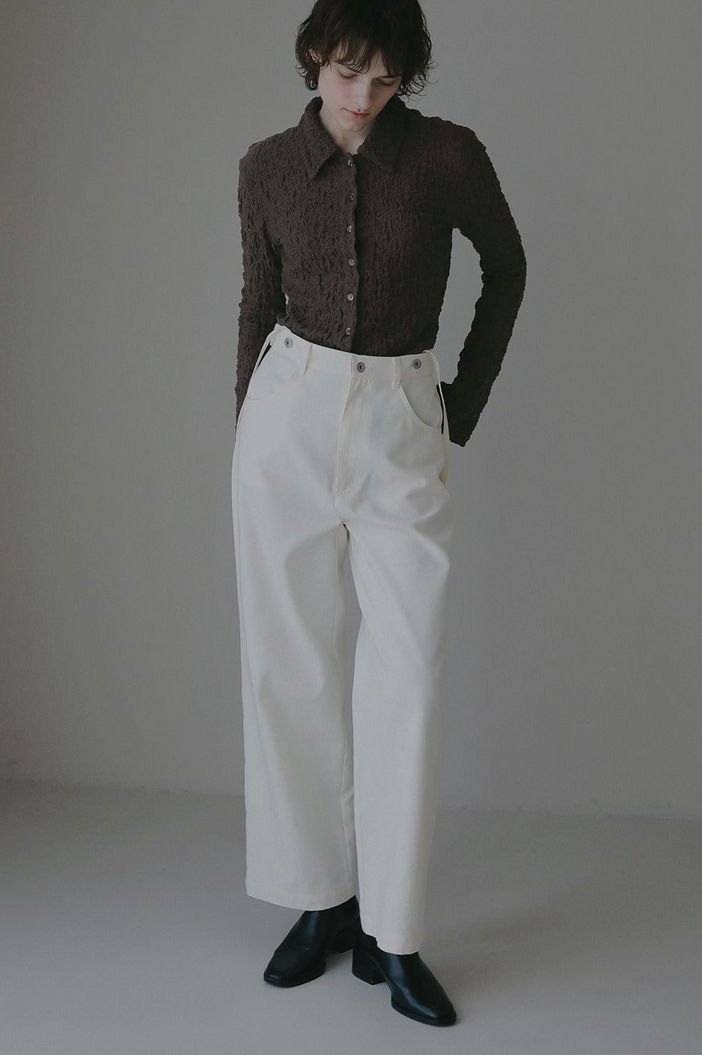 凹凸感のあるカットソー素材を使用したトップス。