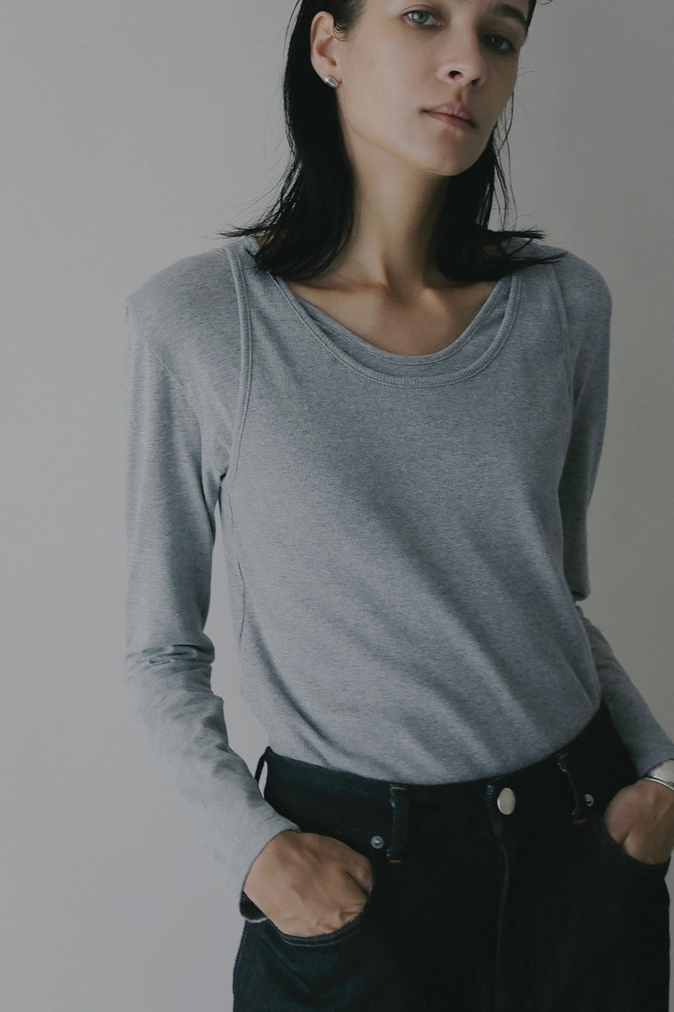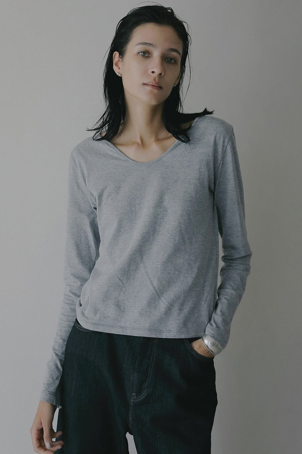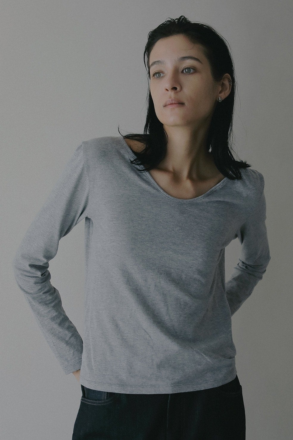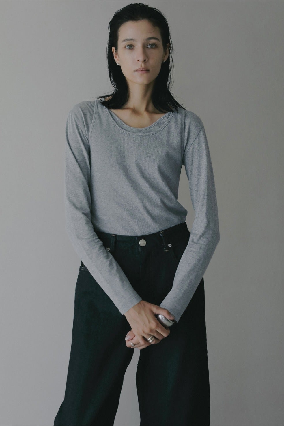 それぞれ生地を変えており、異なる表情感の違いも楽しめます。ロングスリーブは襟ぐりのカーブデザインがポイントに。