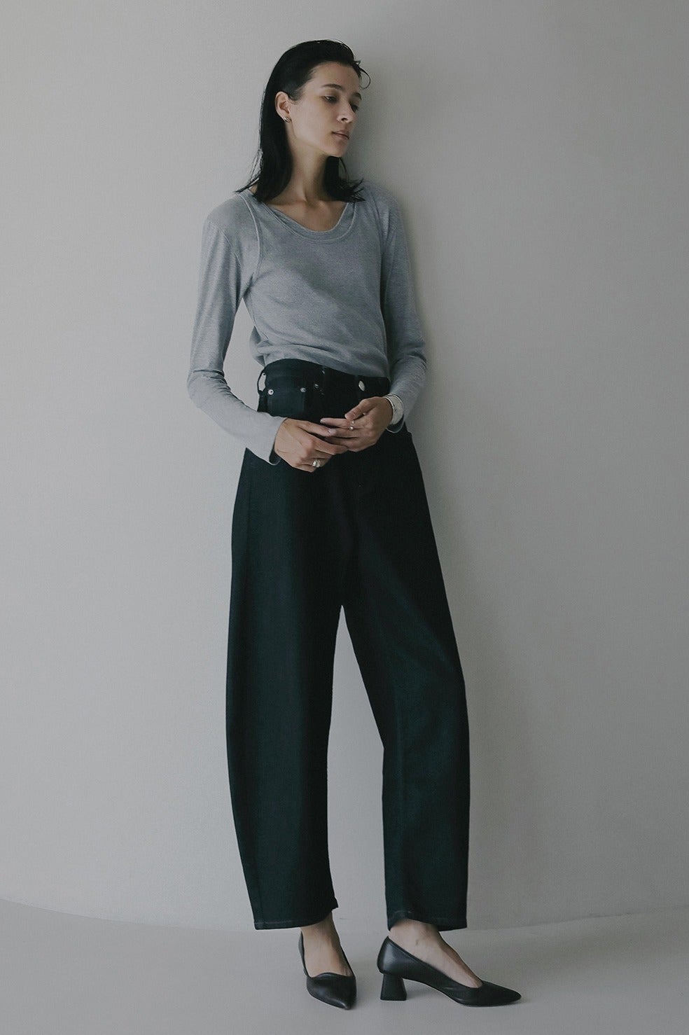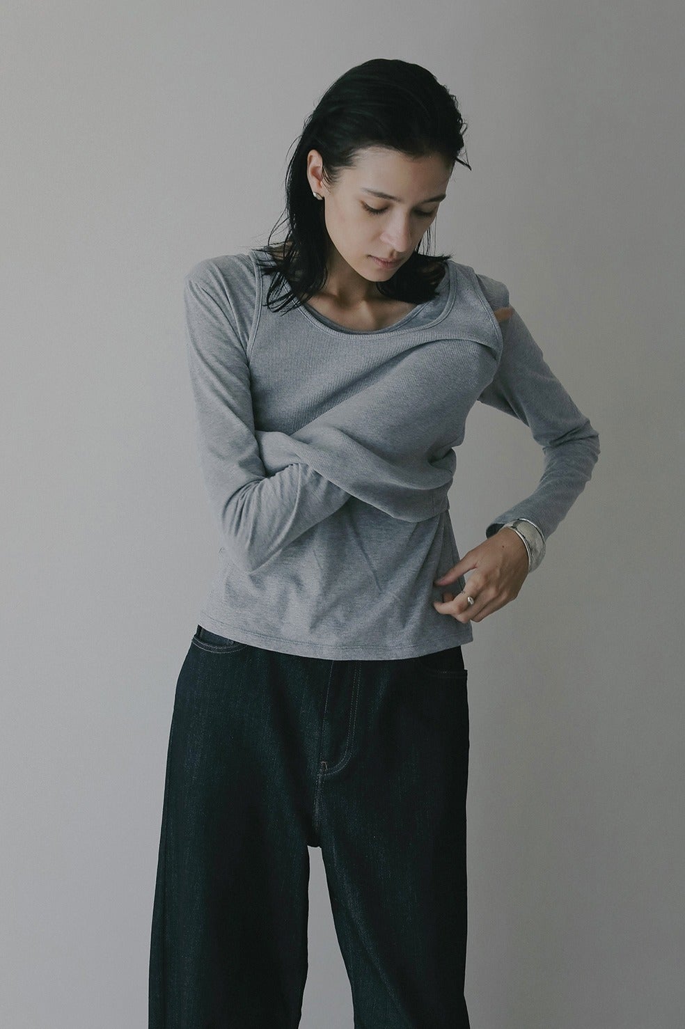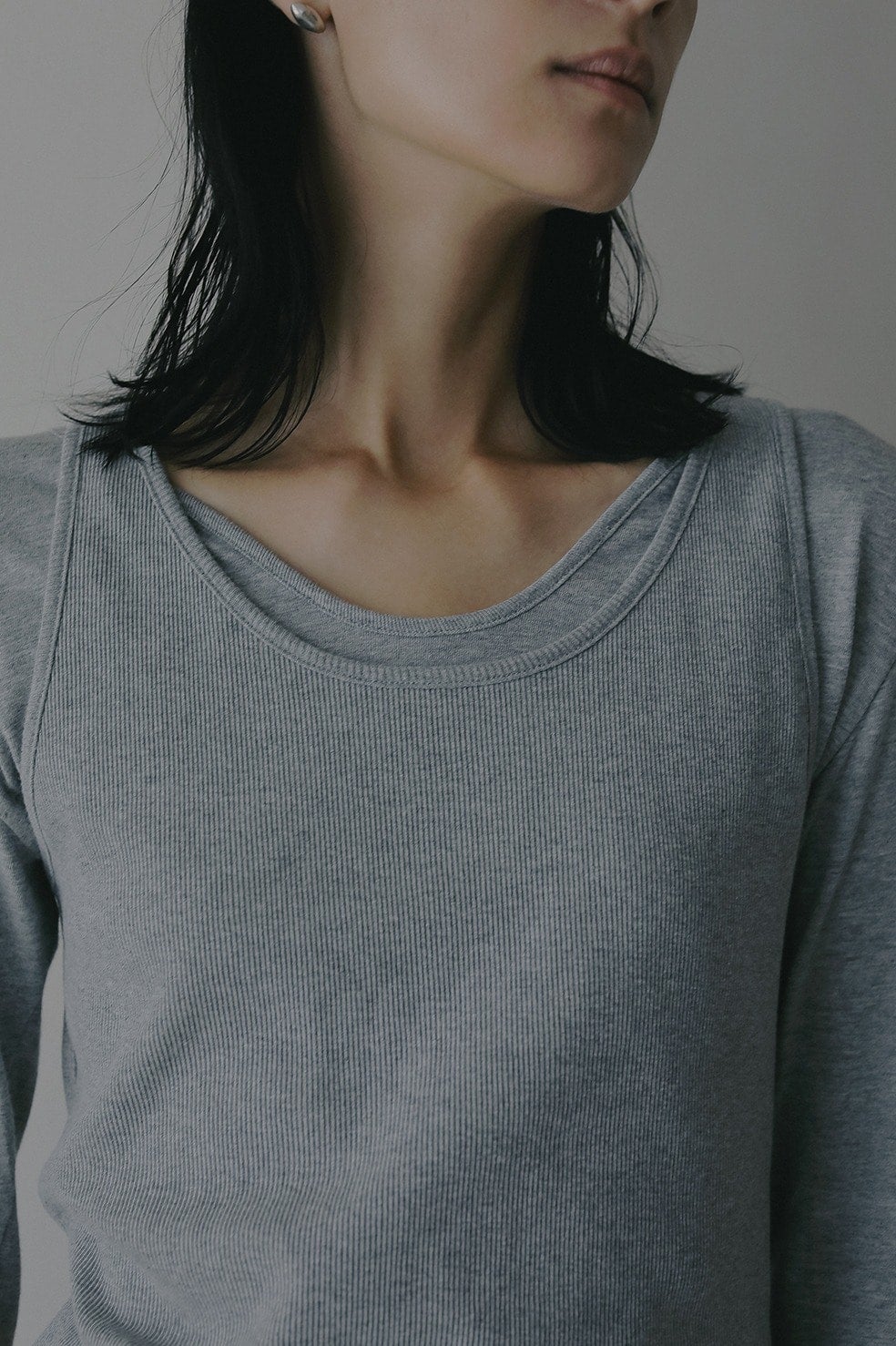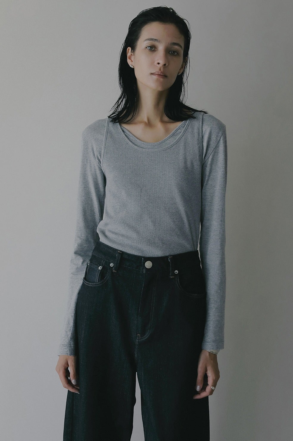 それぞれ生地を変えており、異なる表情感の違いも楽しめます。ロングスリーブは襟ぐりのカーブデザインがポイントに。