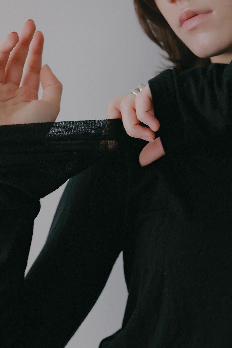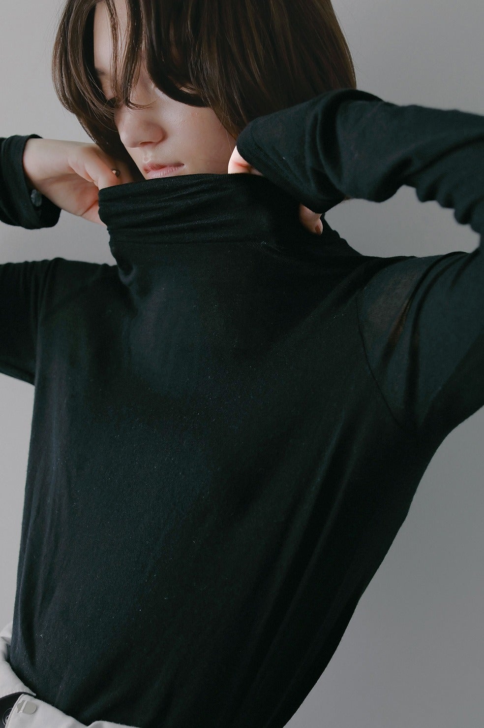 カシミヤとシルクを贅沢にブレンドした、極上の肌触りの上質な素材感のハイネックカットソー。