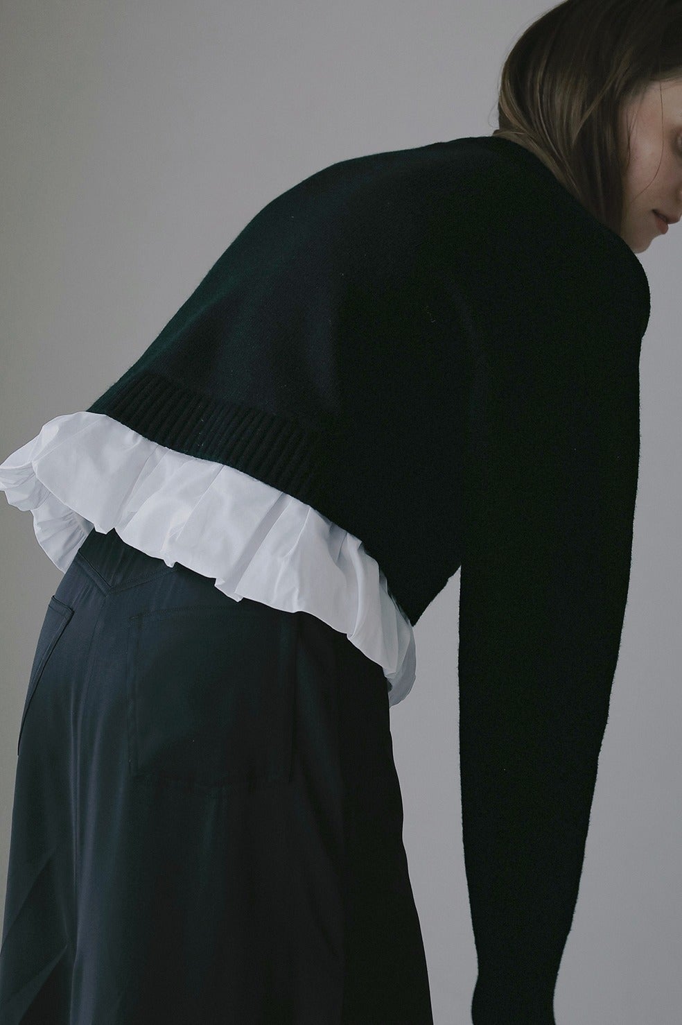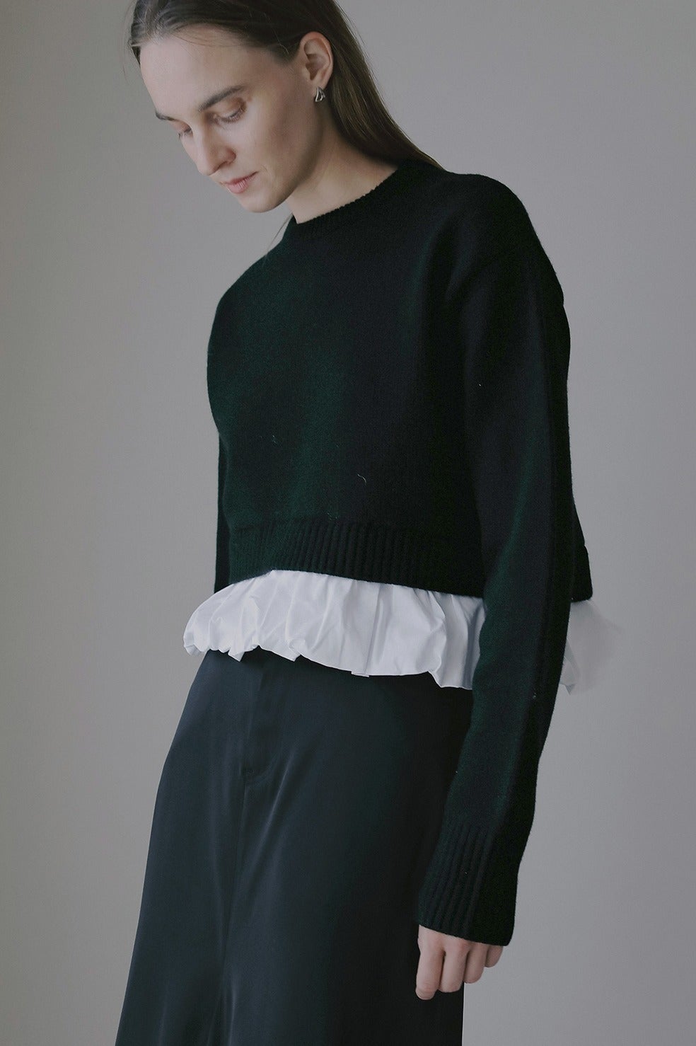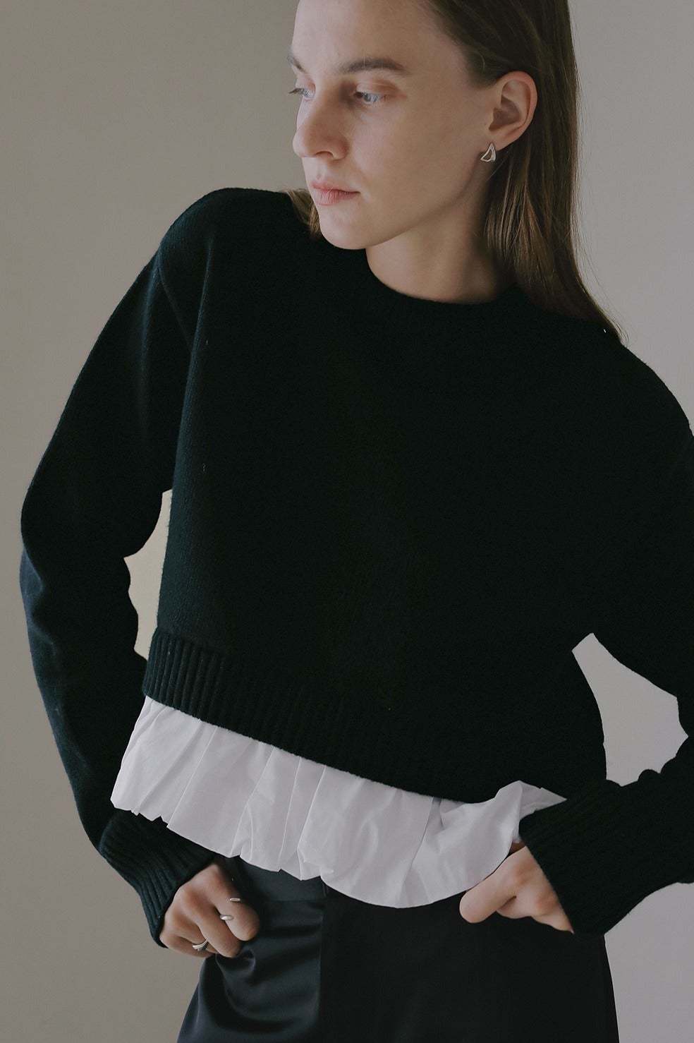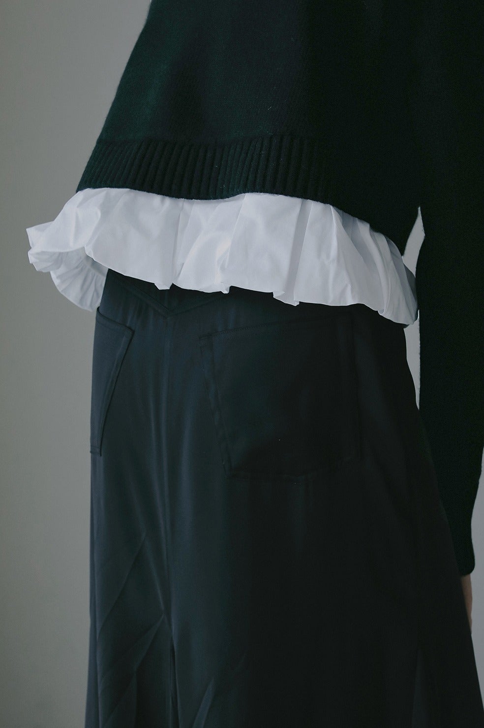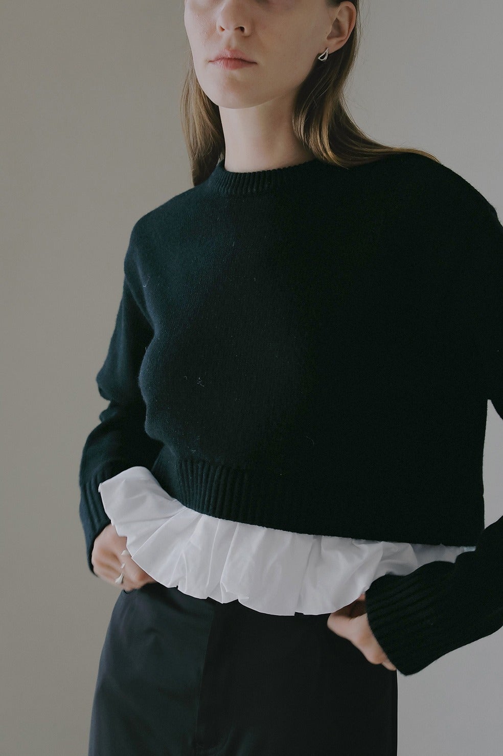 裾にふんわりと広がるタイプライター素材のバルーンヘムをあしらったレイヤード見えするニット。