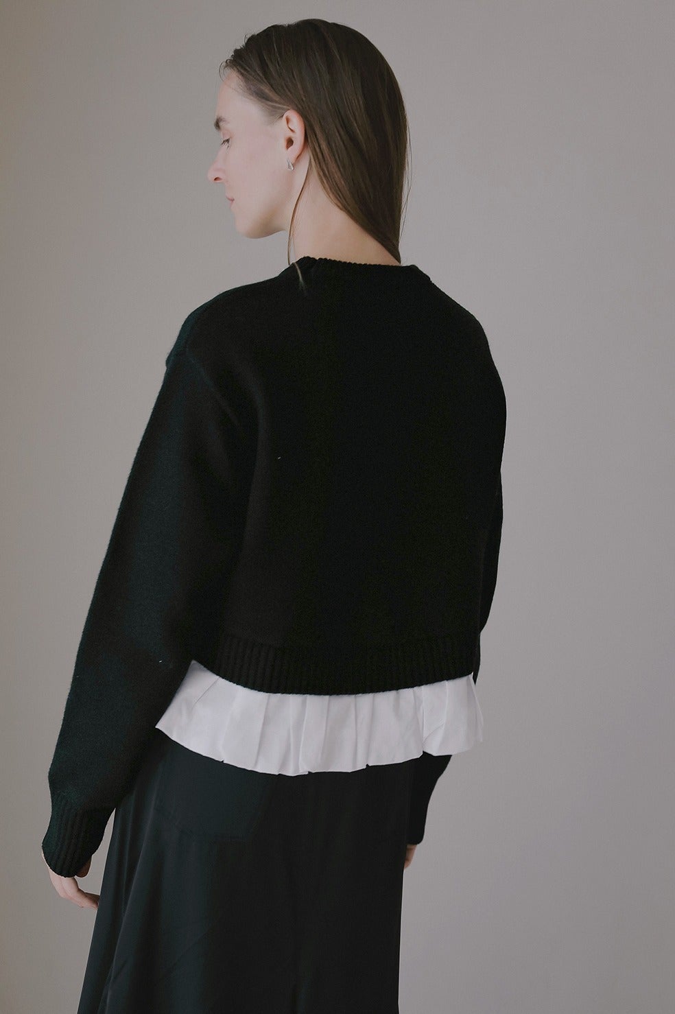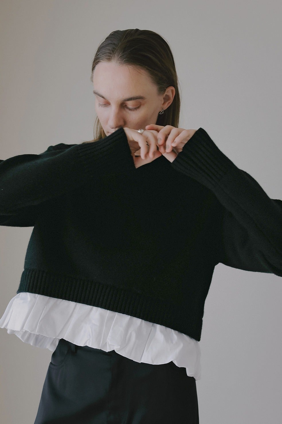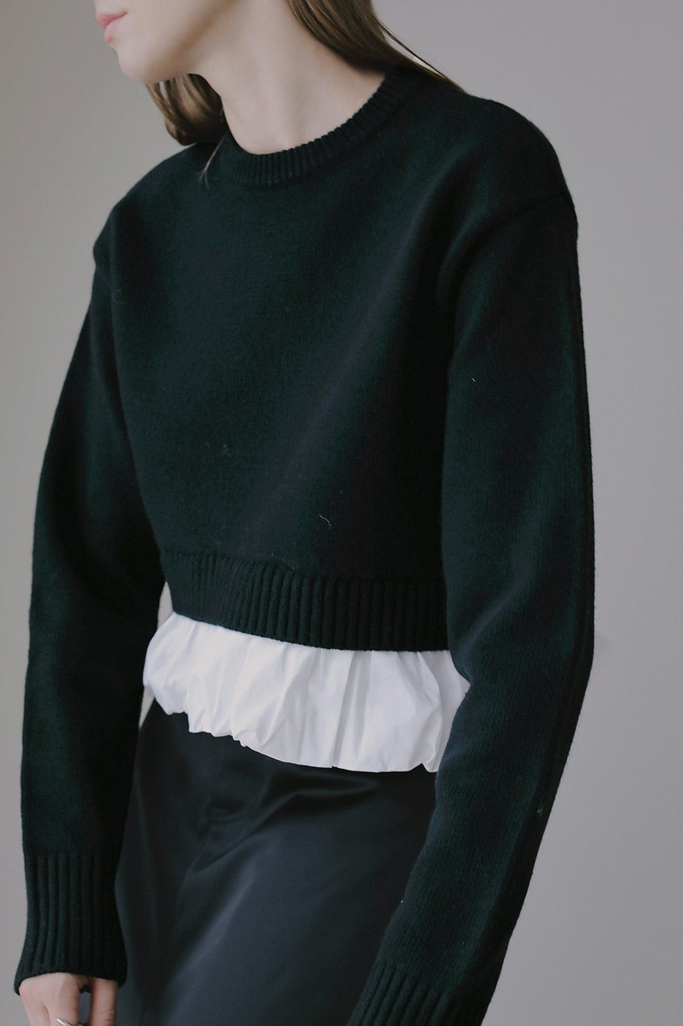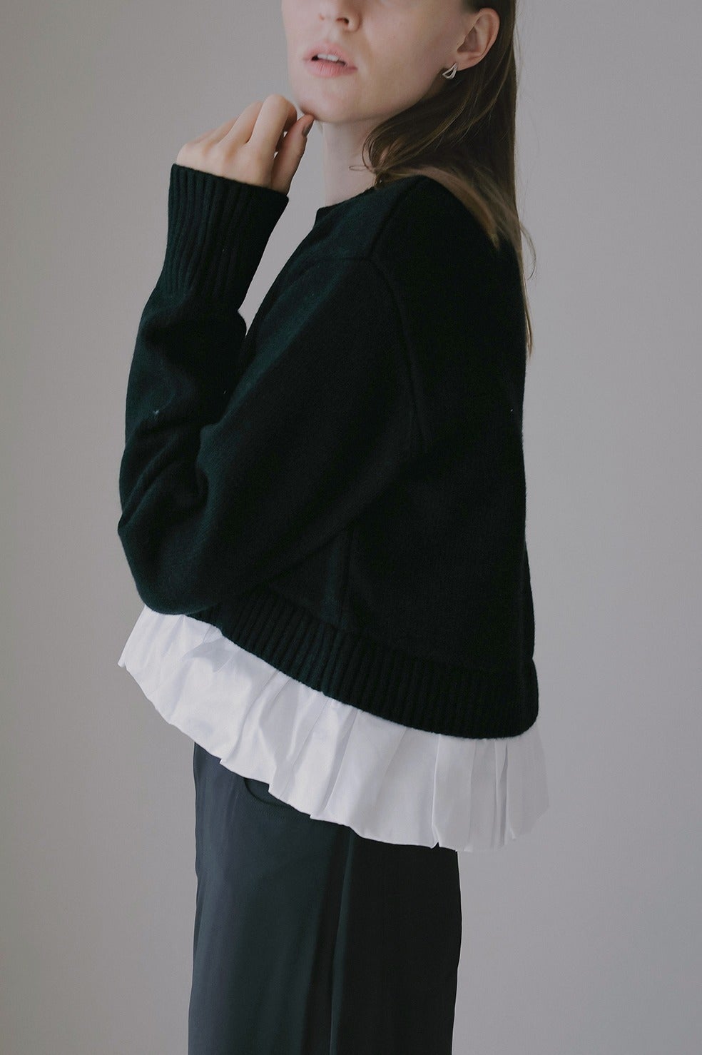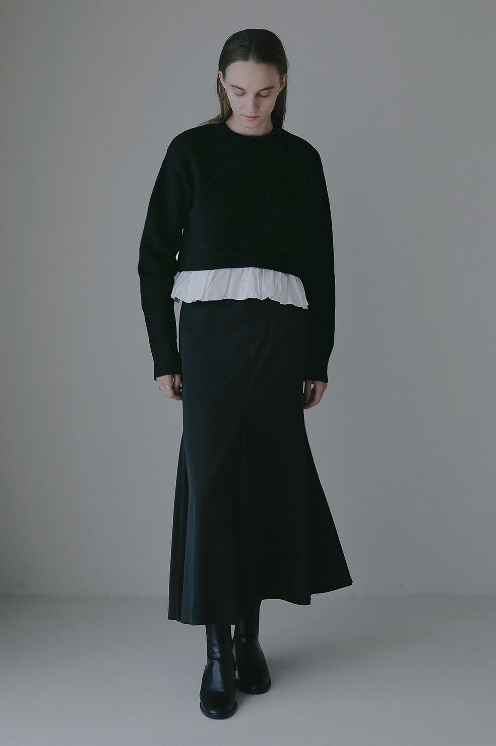 裾にふんわりと広がるタイプライター素材のバルーンヘムをあしらったレイヤード見えするニット。