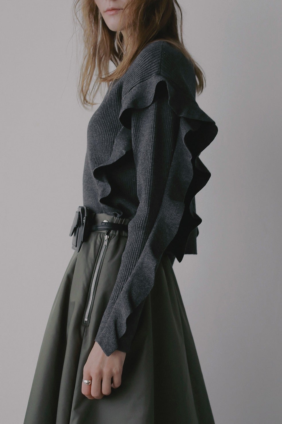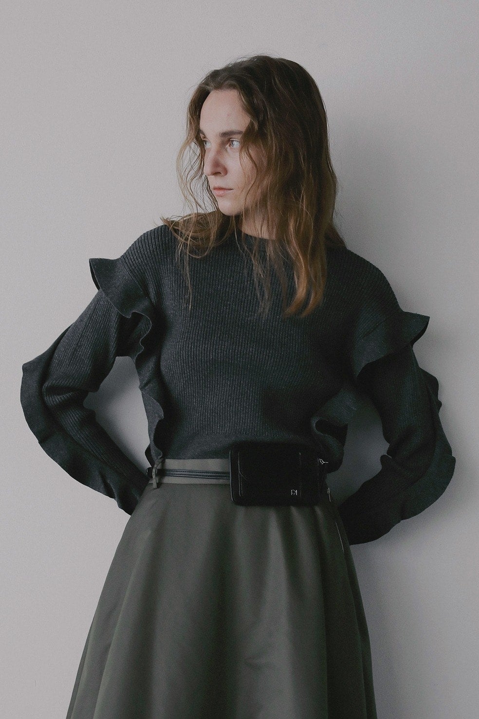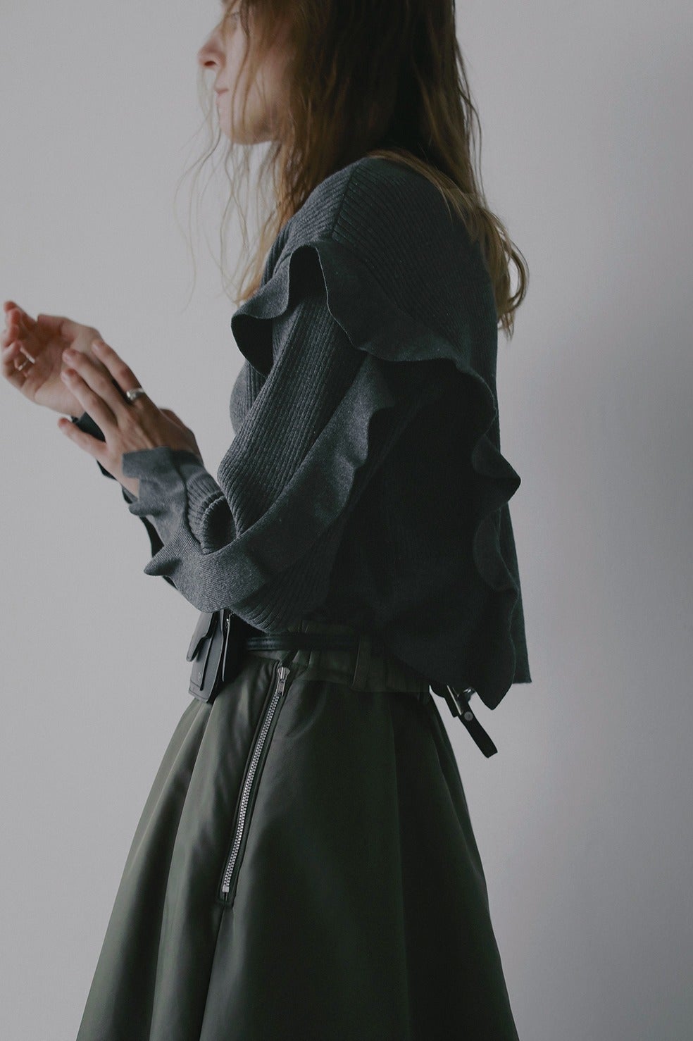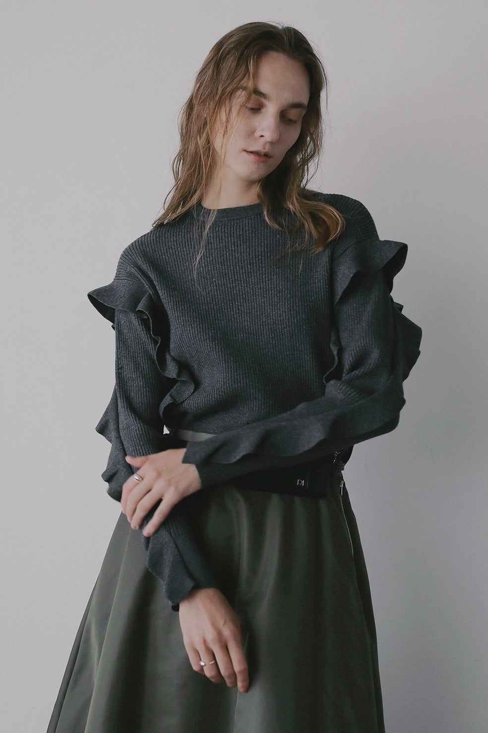 袖とドロップショルダーの切り替え位置からサイドにかけてのフリルデザインが華やかなニット。