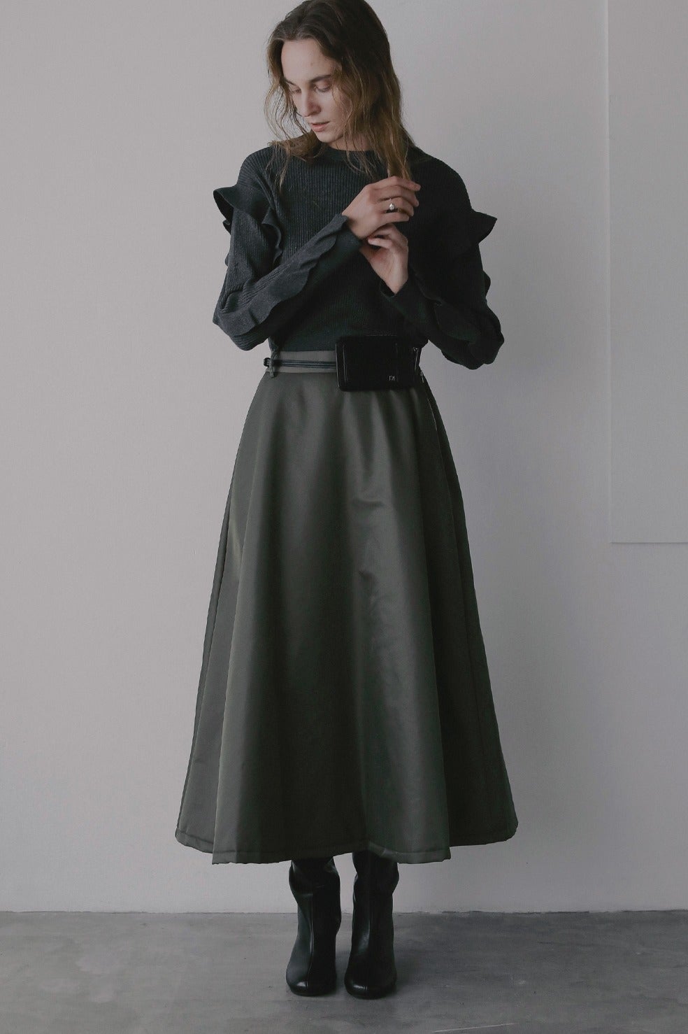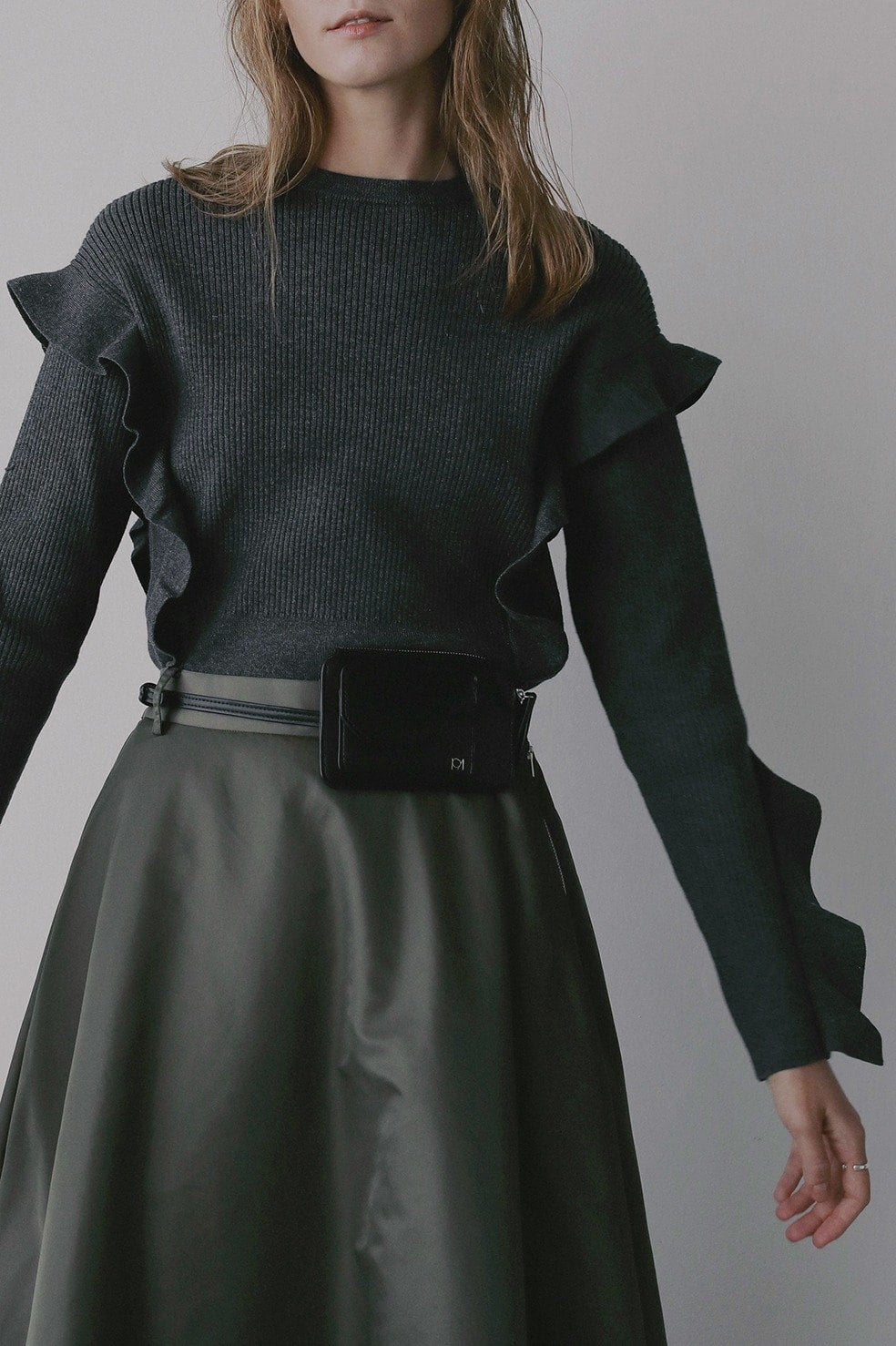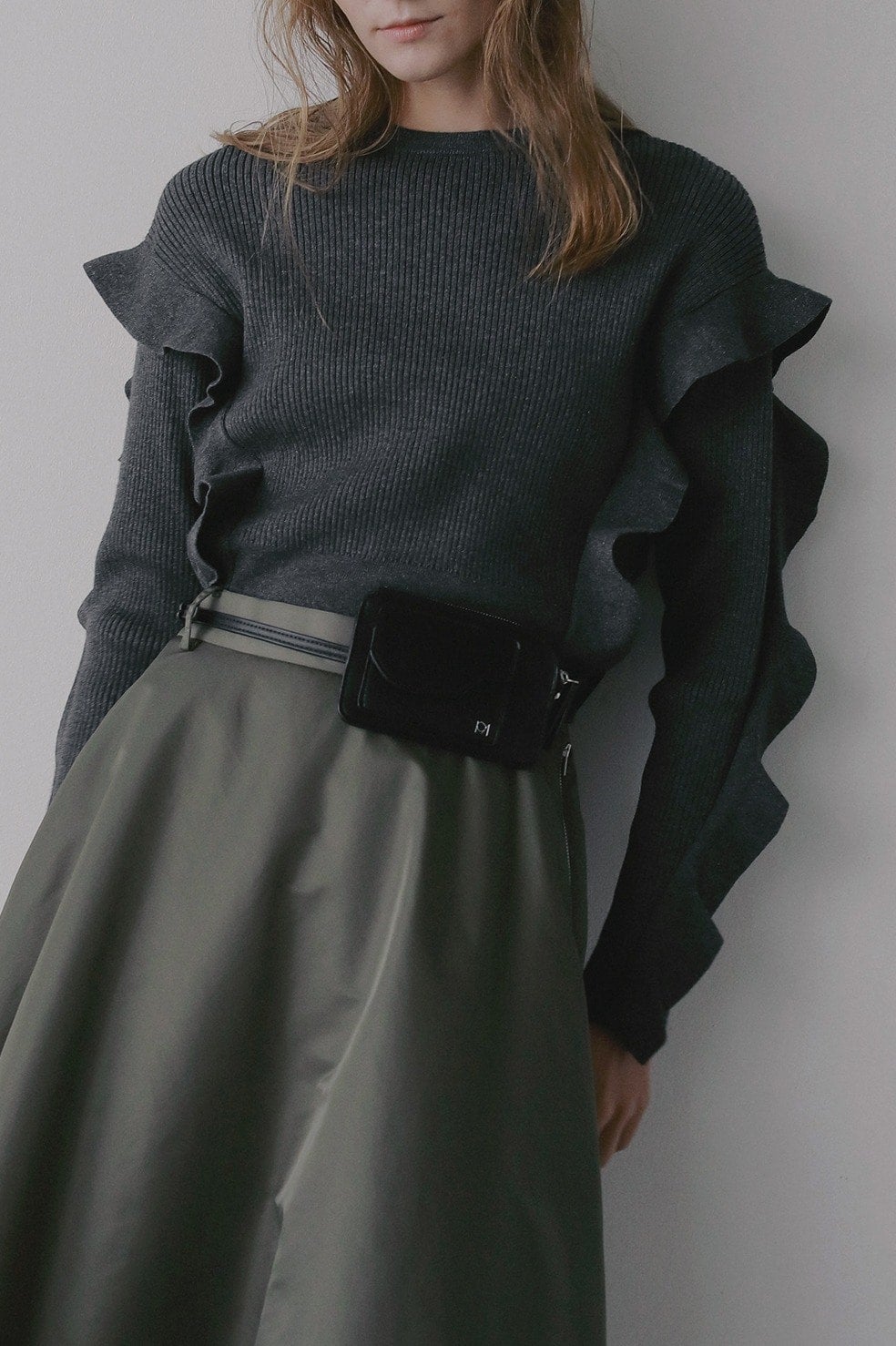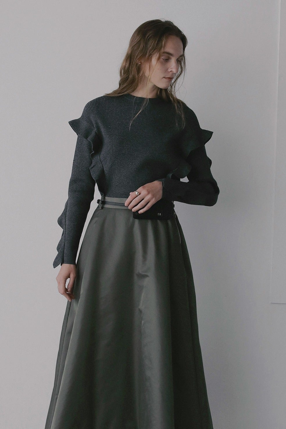 袖とドロップショルダーの切り替え位置からサイドにかけてのフリルデザインが華やかなニット。