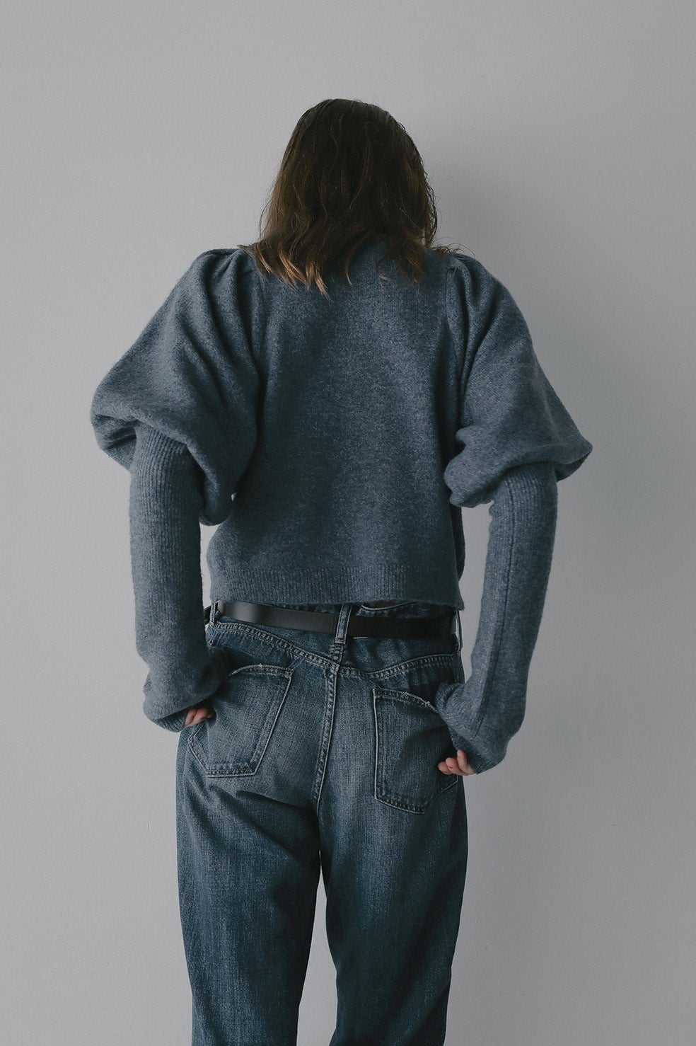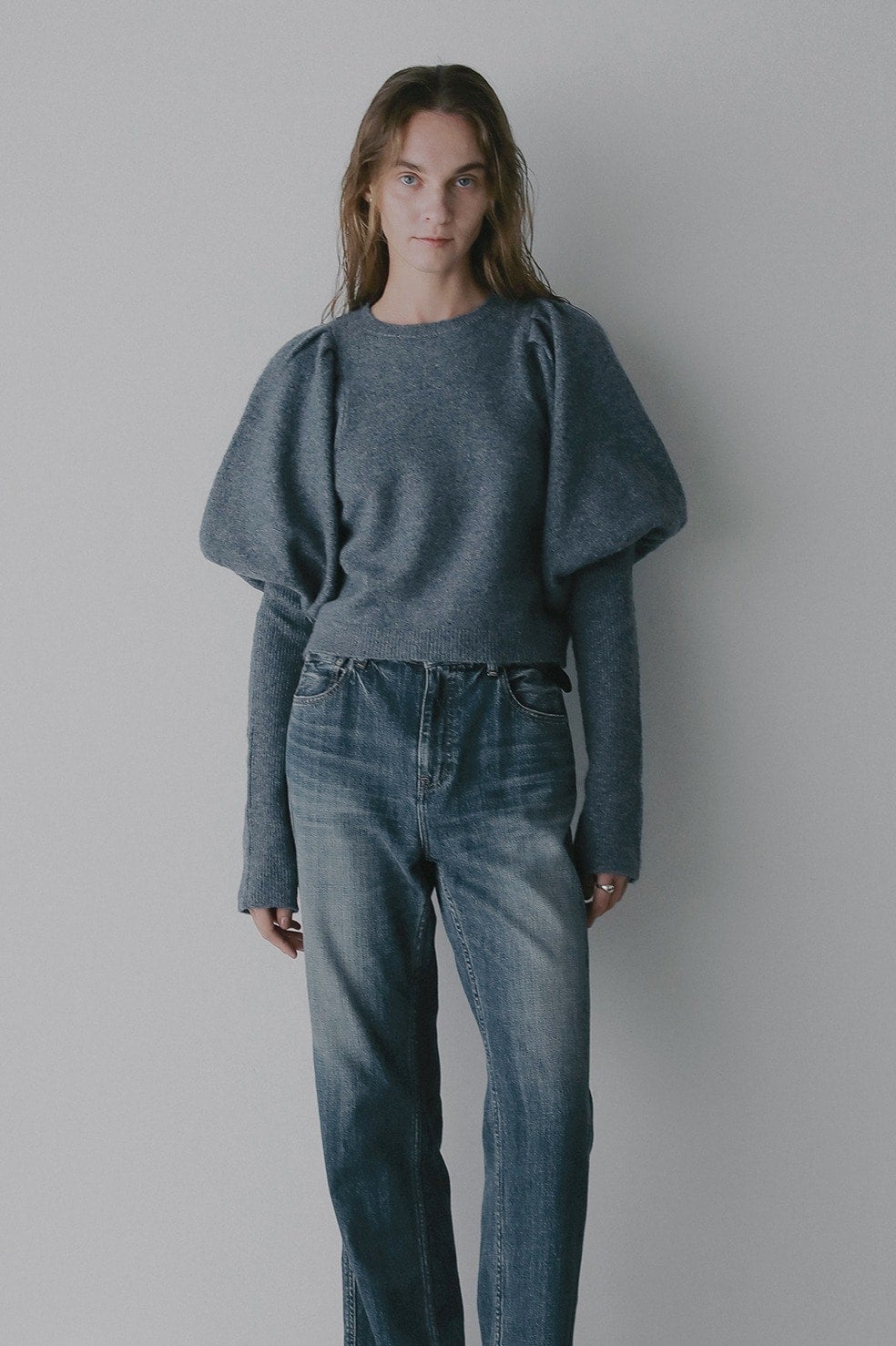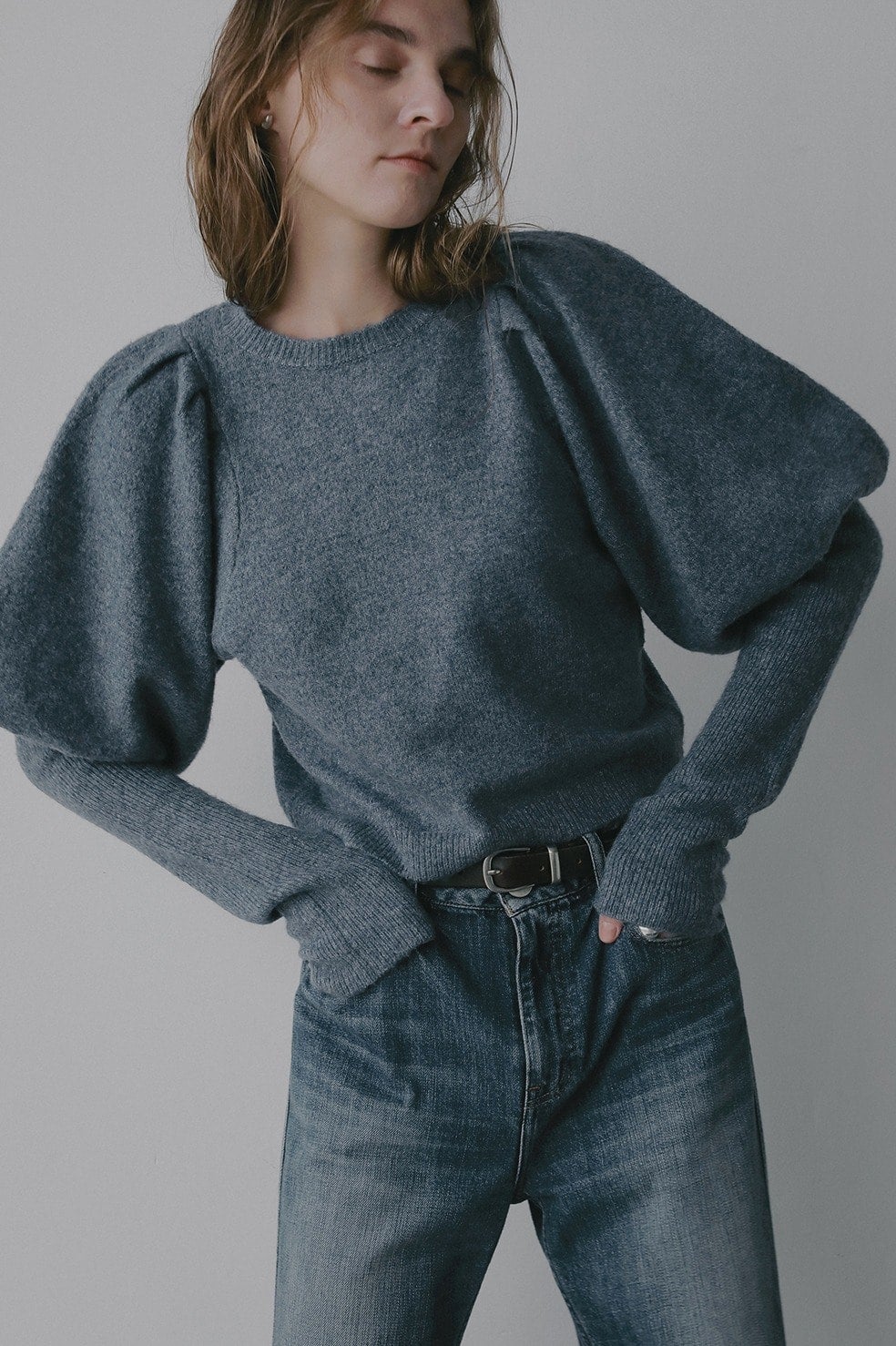 肘上までのパフスリーブが特徴的なニットプルオーバー。