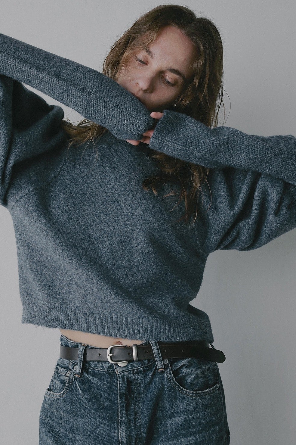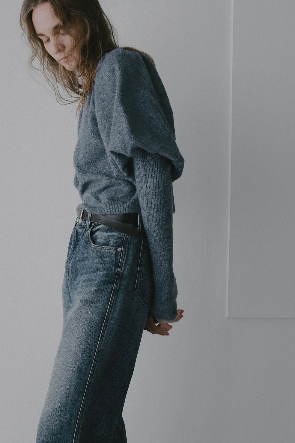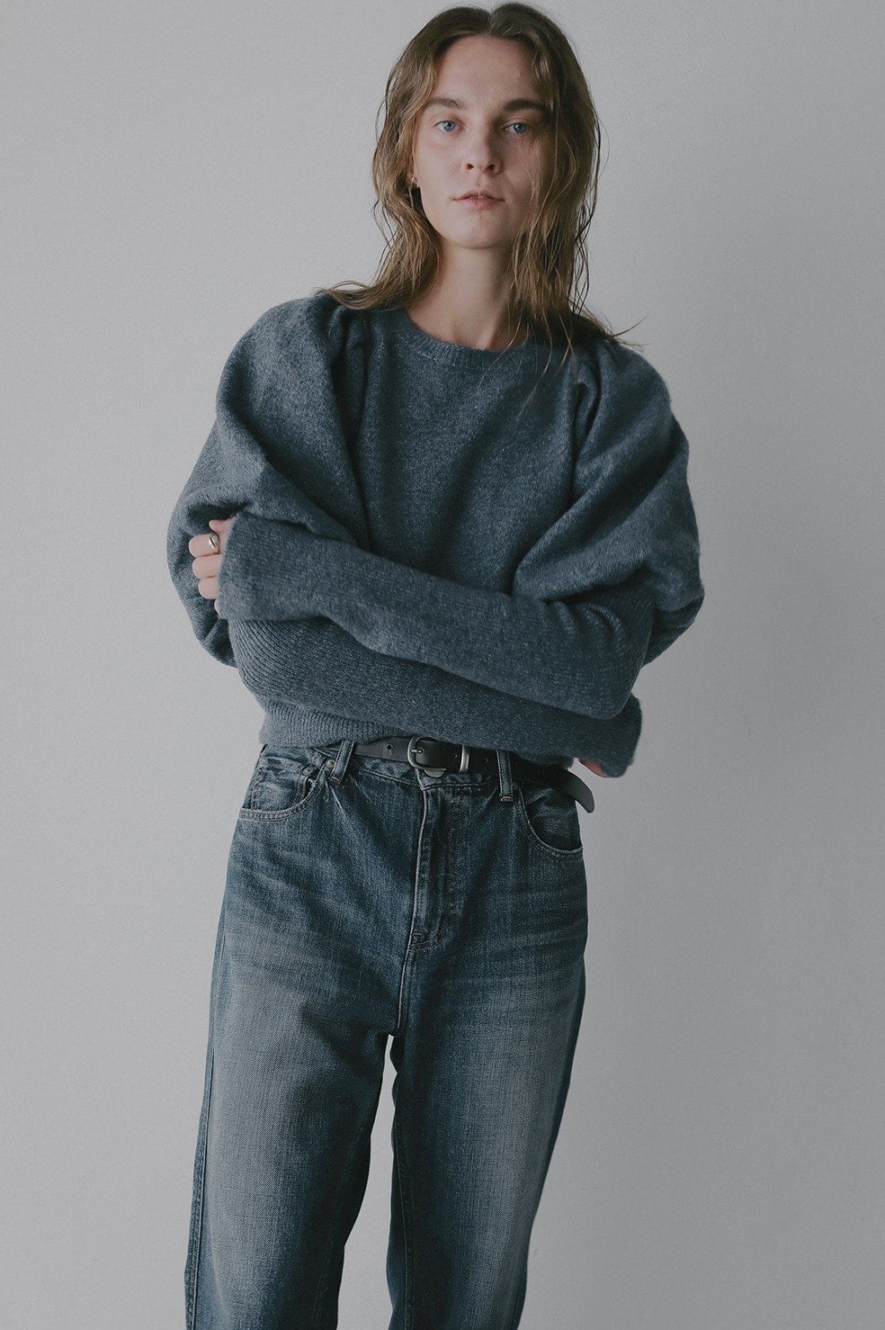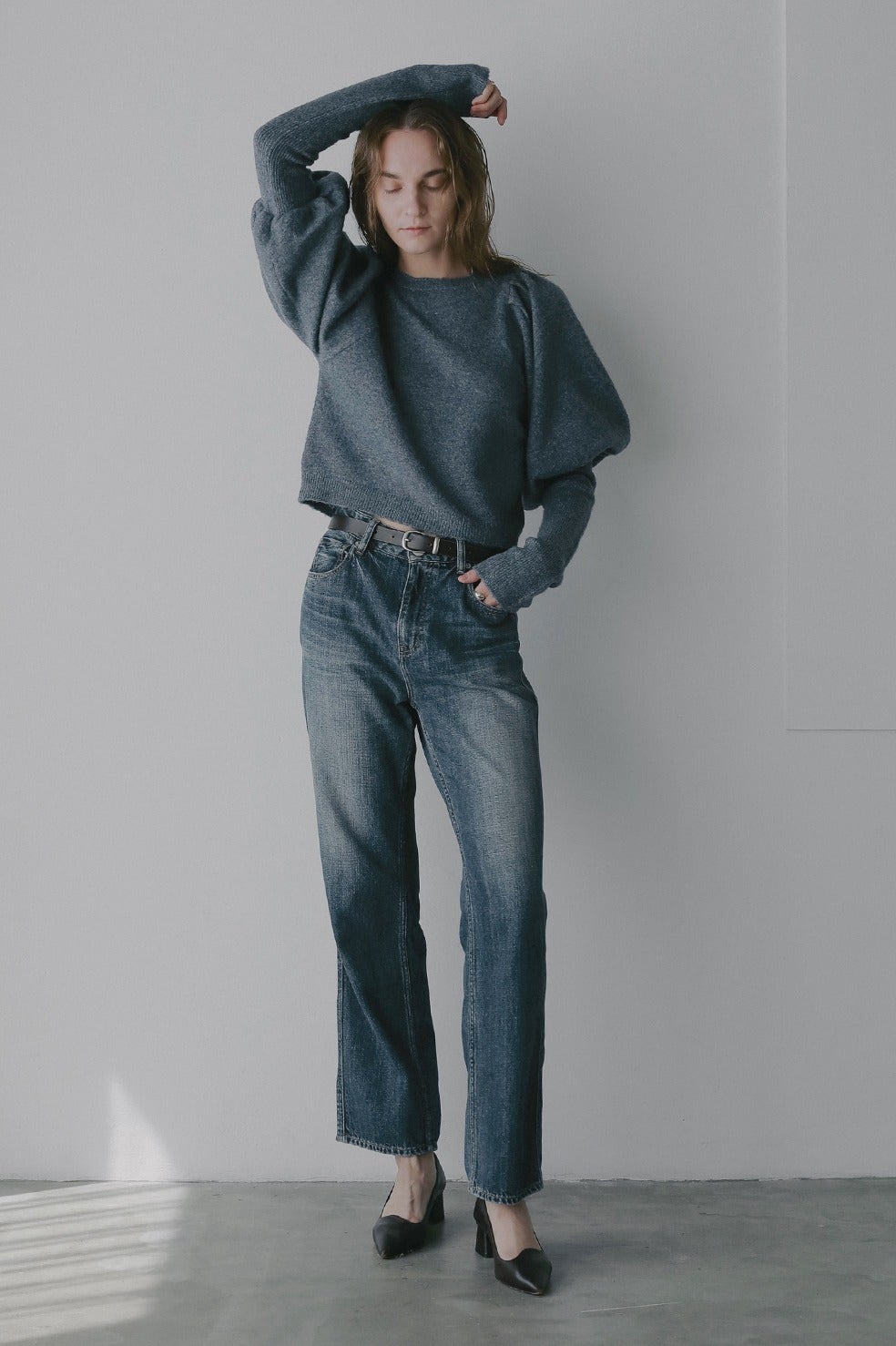 肘上までのパフスリーブが特徴的なニットプルオーバー。