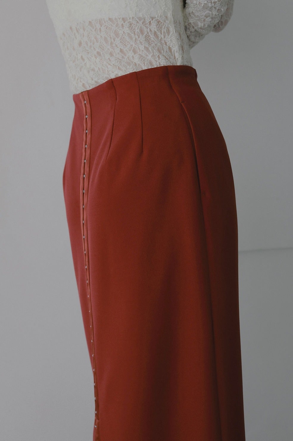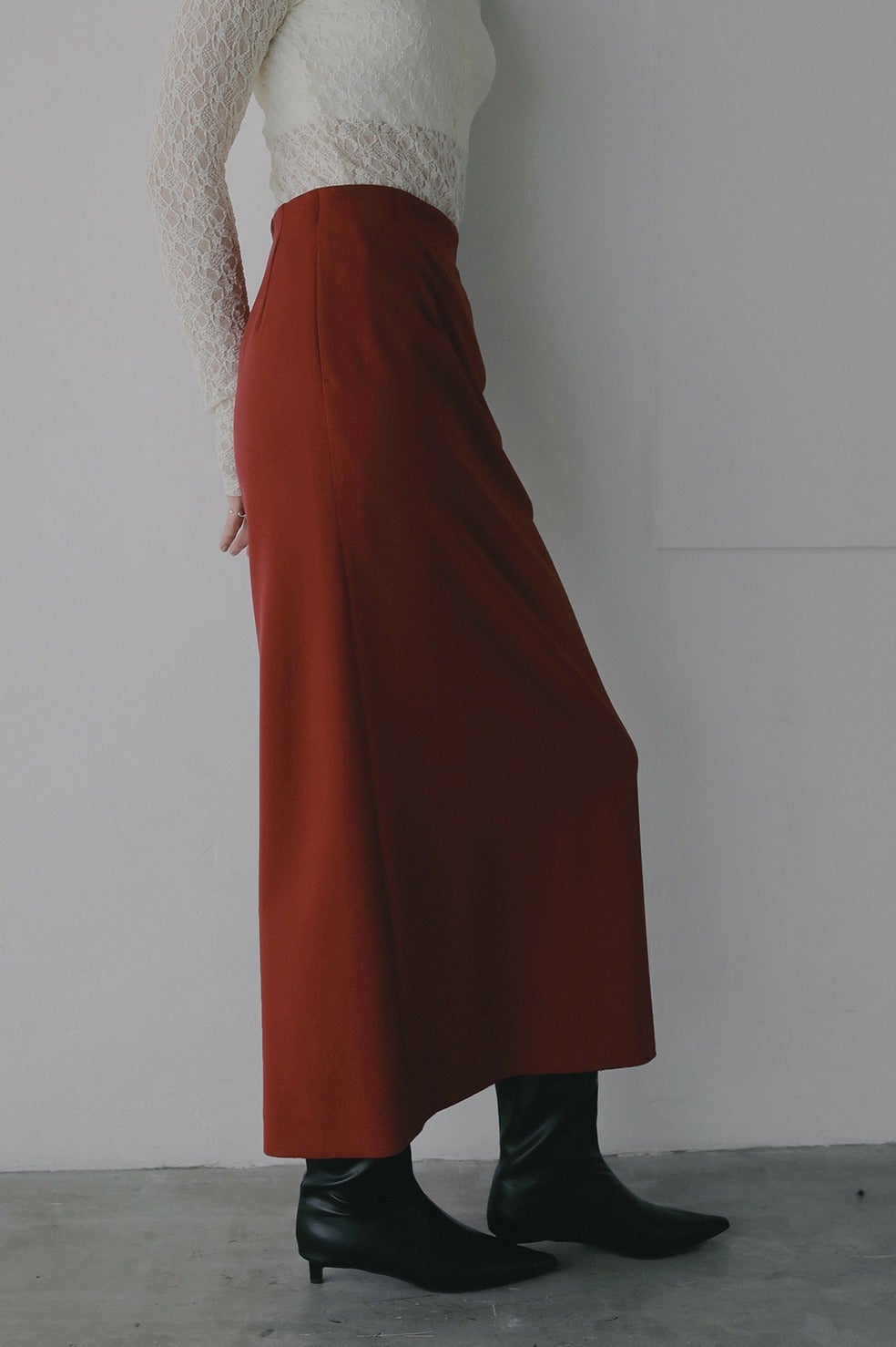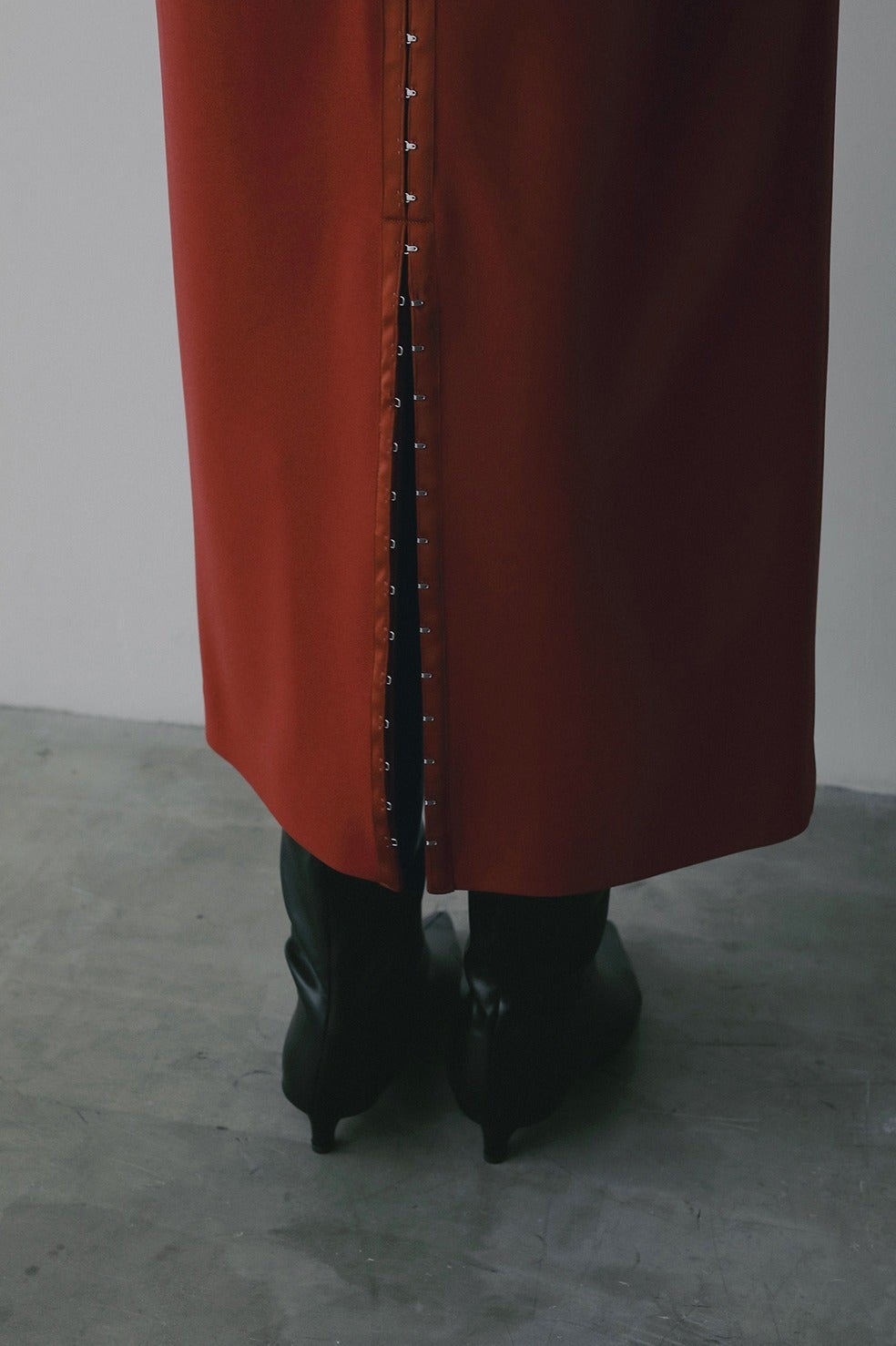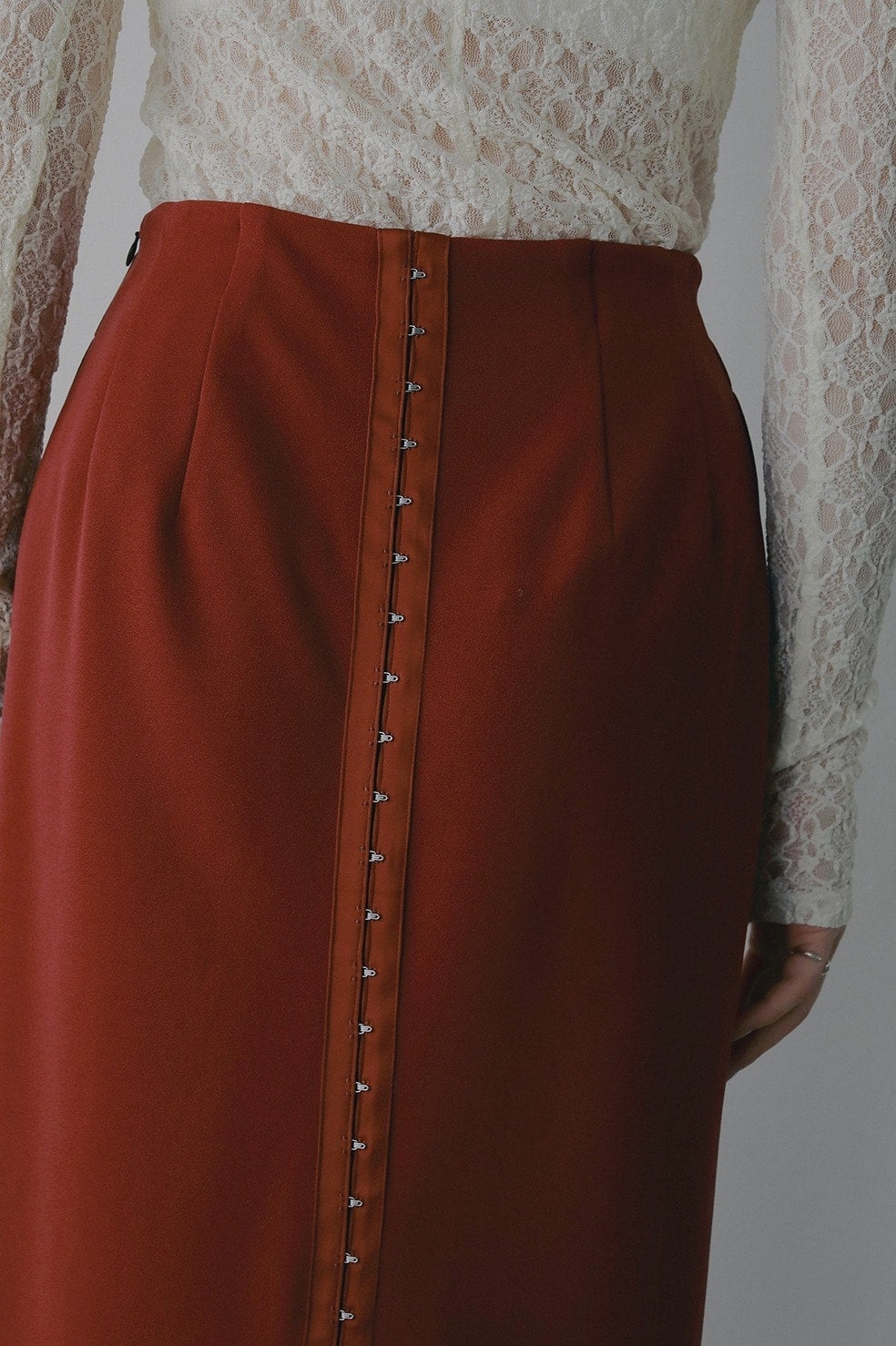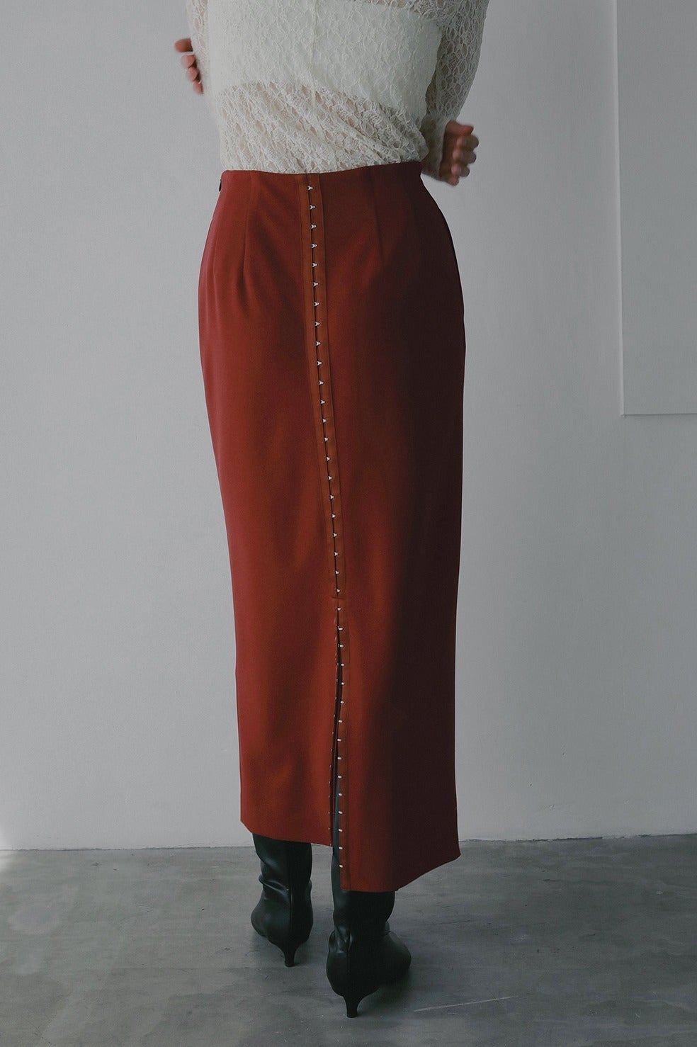 ストレートのシンプルなデザインながらもバックのホックデザインが効いたスカート。