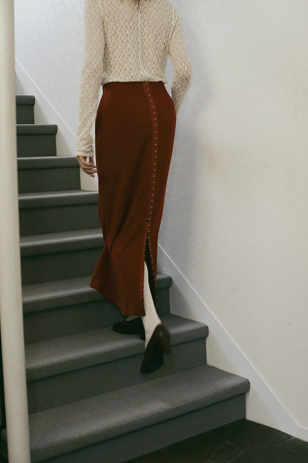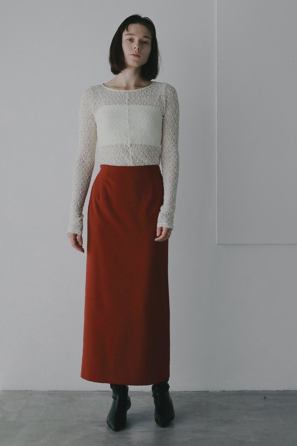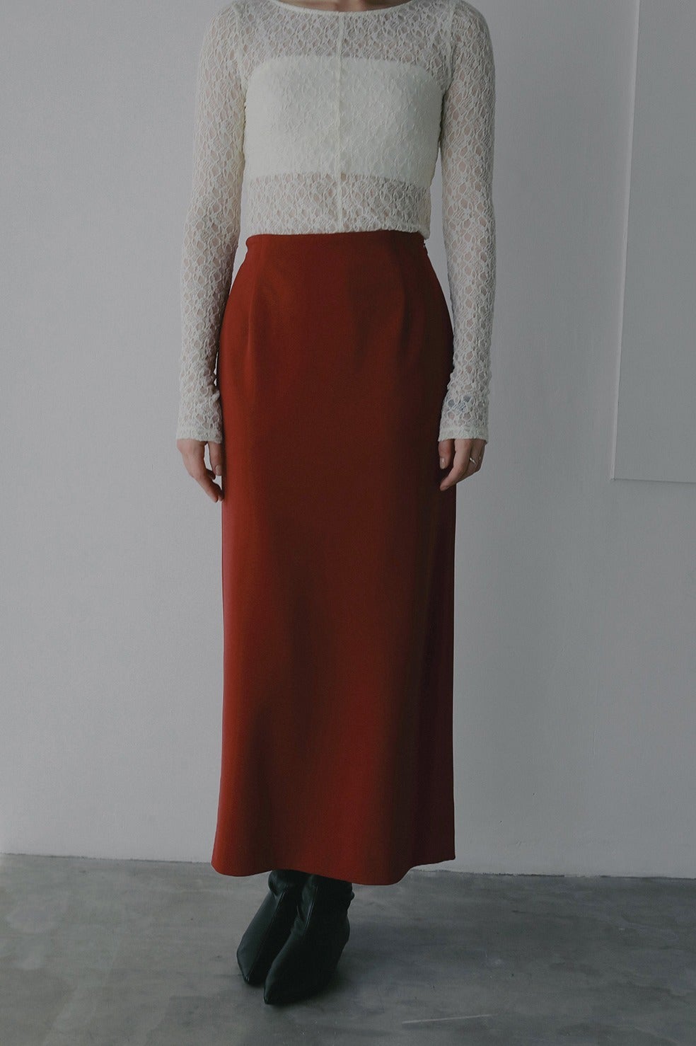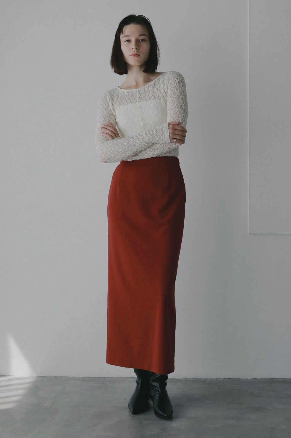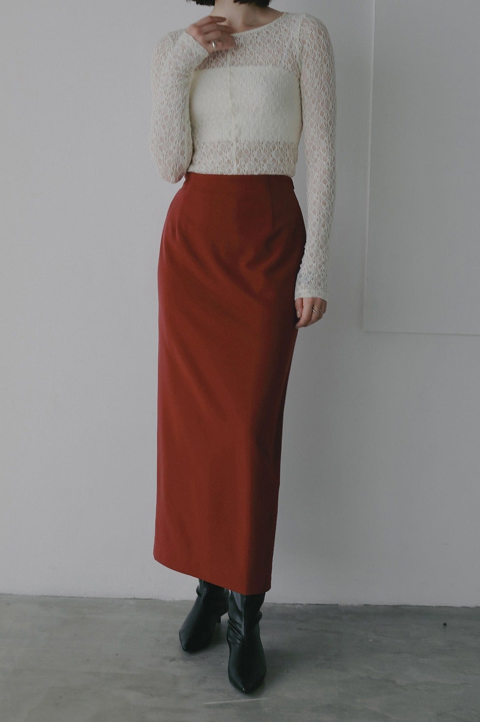ストレートのシンプルなデザインながらもバックのホックデザインが効いたスカート。