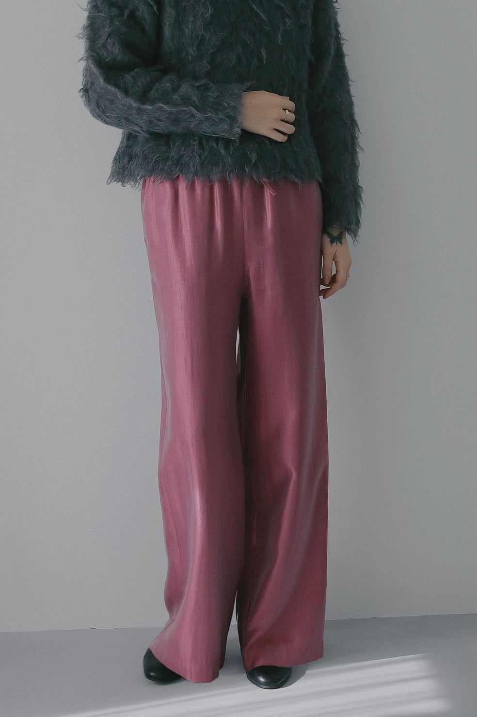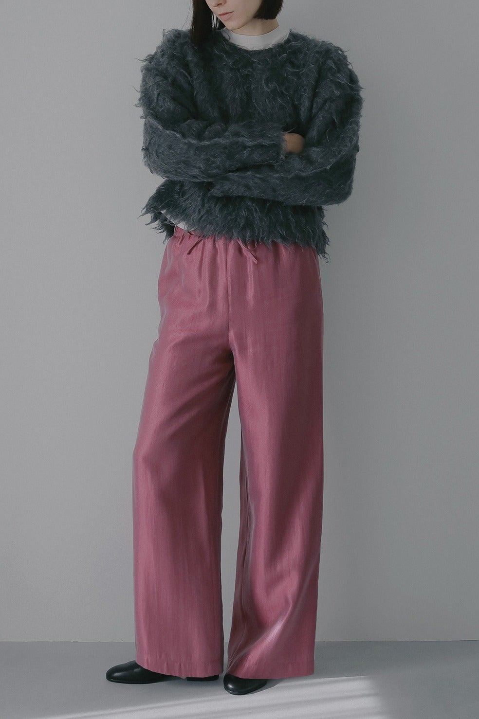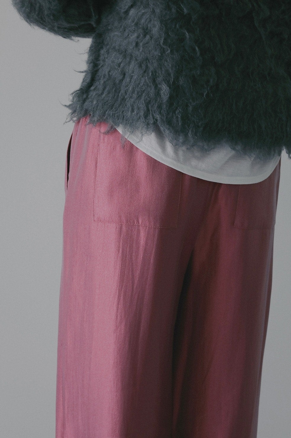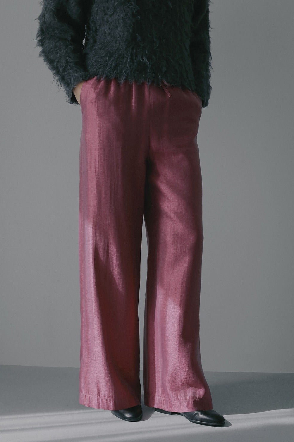 太めのシルエットにウエストのドローストリングでリラックス感がありつつ、光沢感のある素材を使用することでカジュアルになりすぎないパンツに仕上げました。