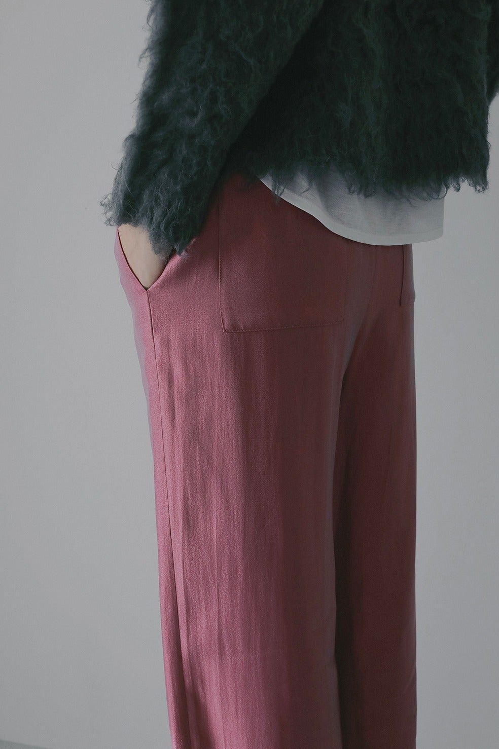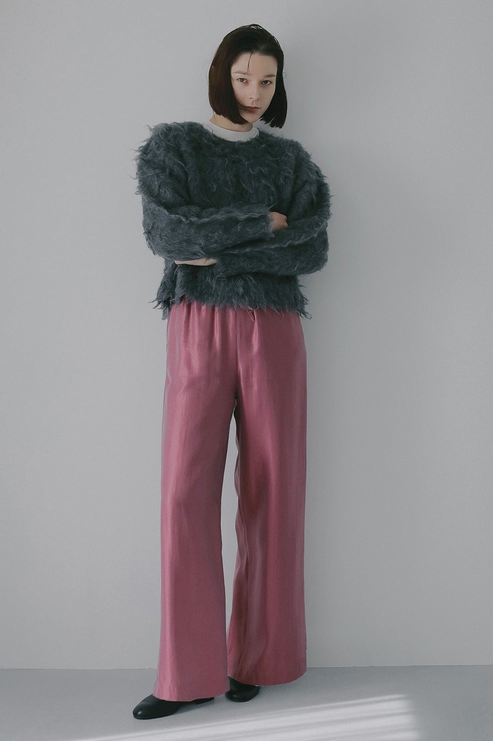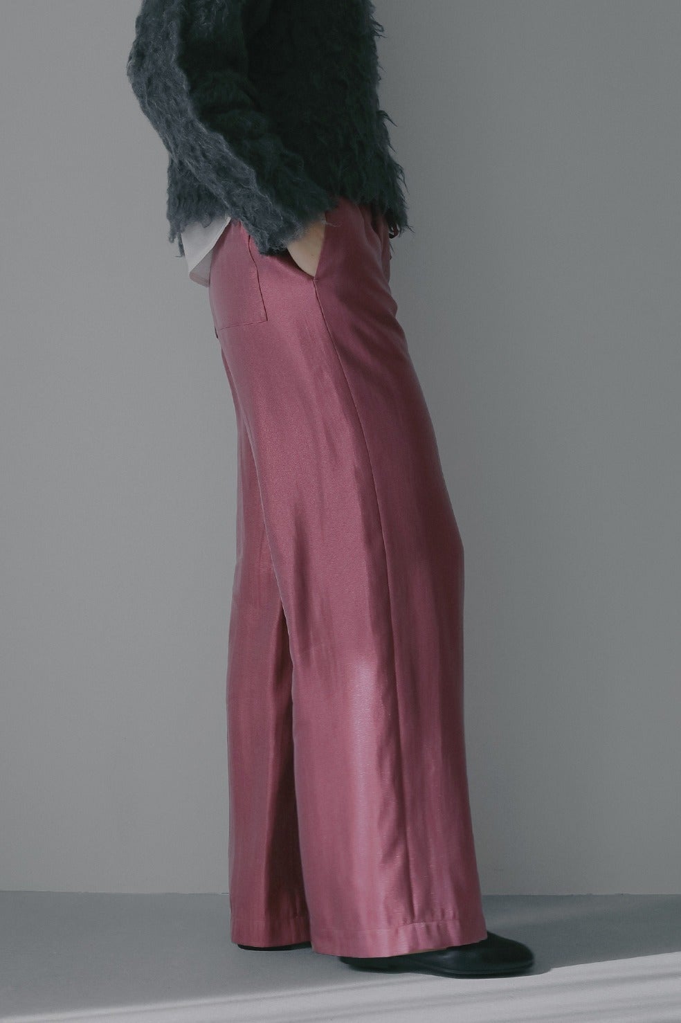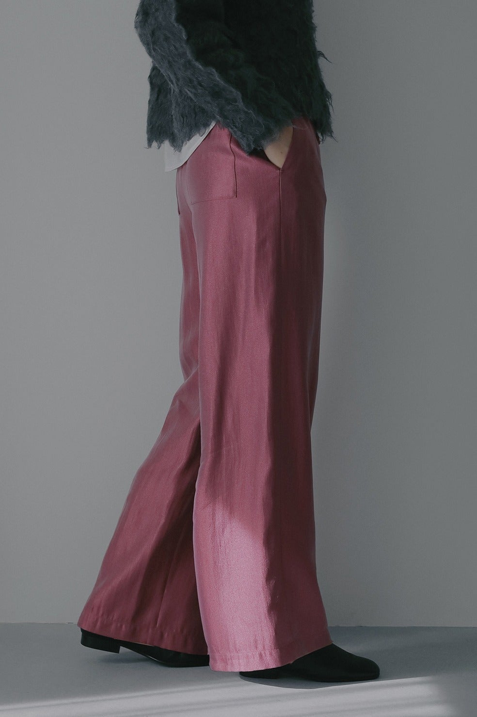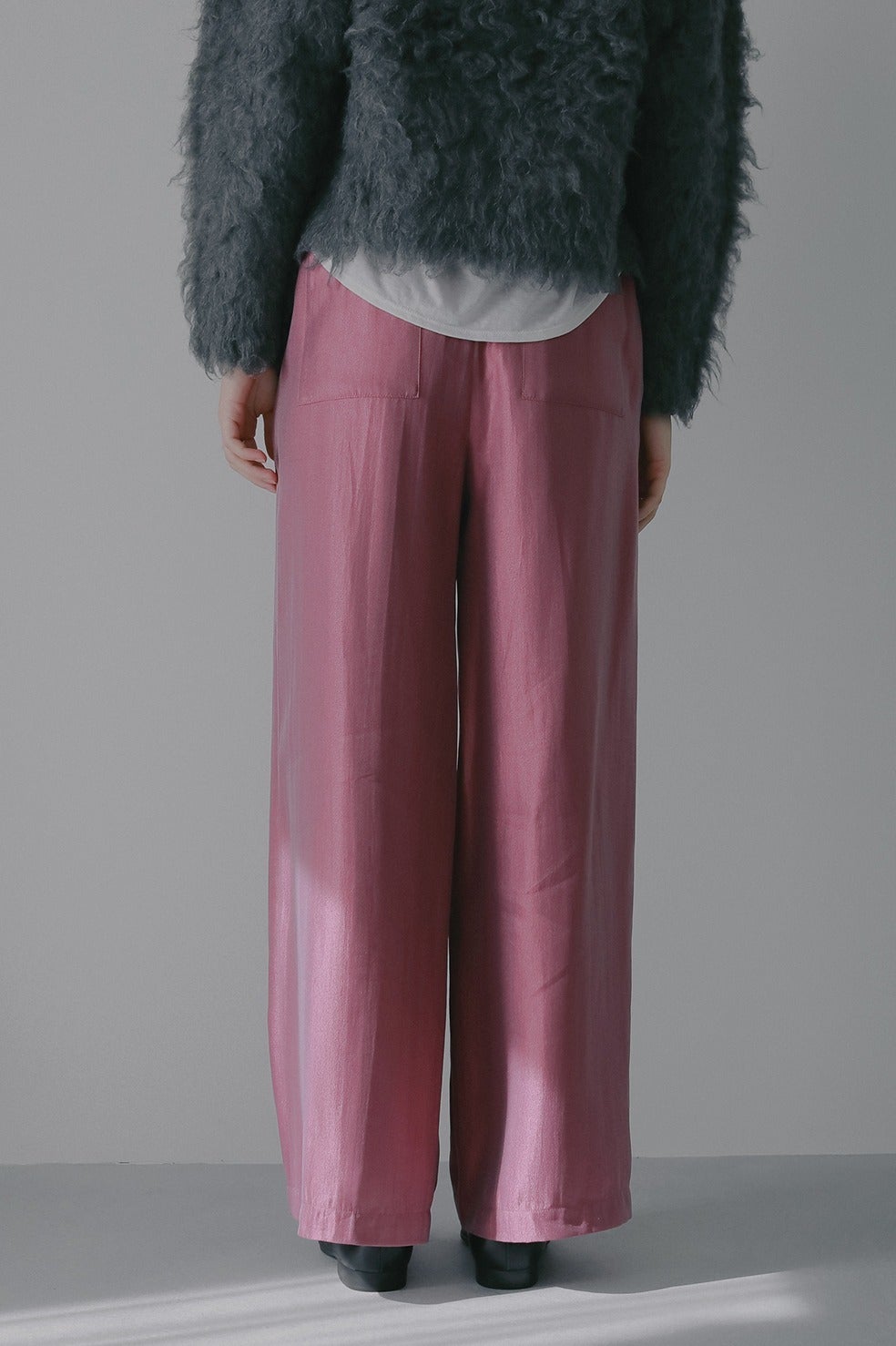太めのシルエットにウエストのドローストリングでリラックス感がありつつ、光沢感のある素材を使用することでカジュアルになりすぎないパンツに仕上げました。