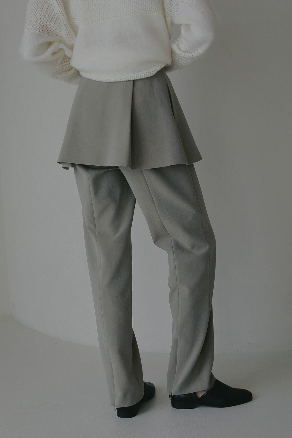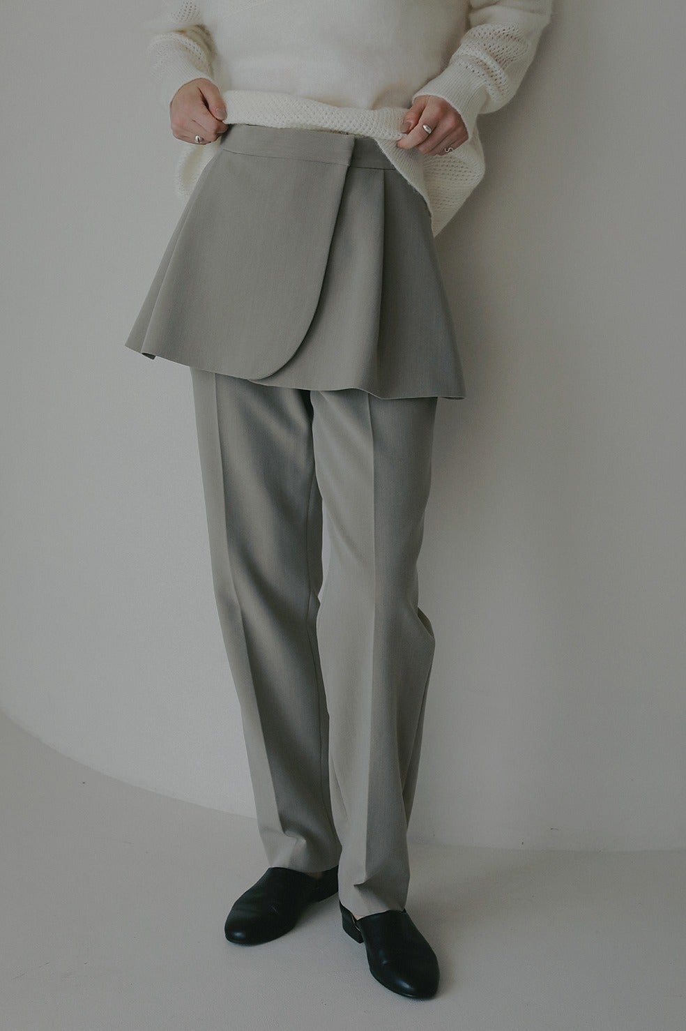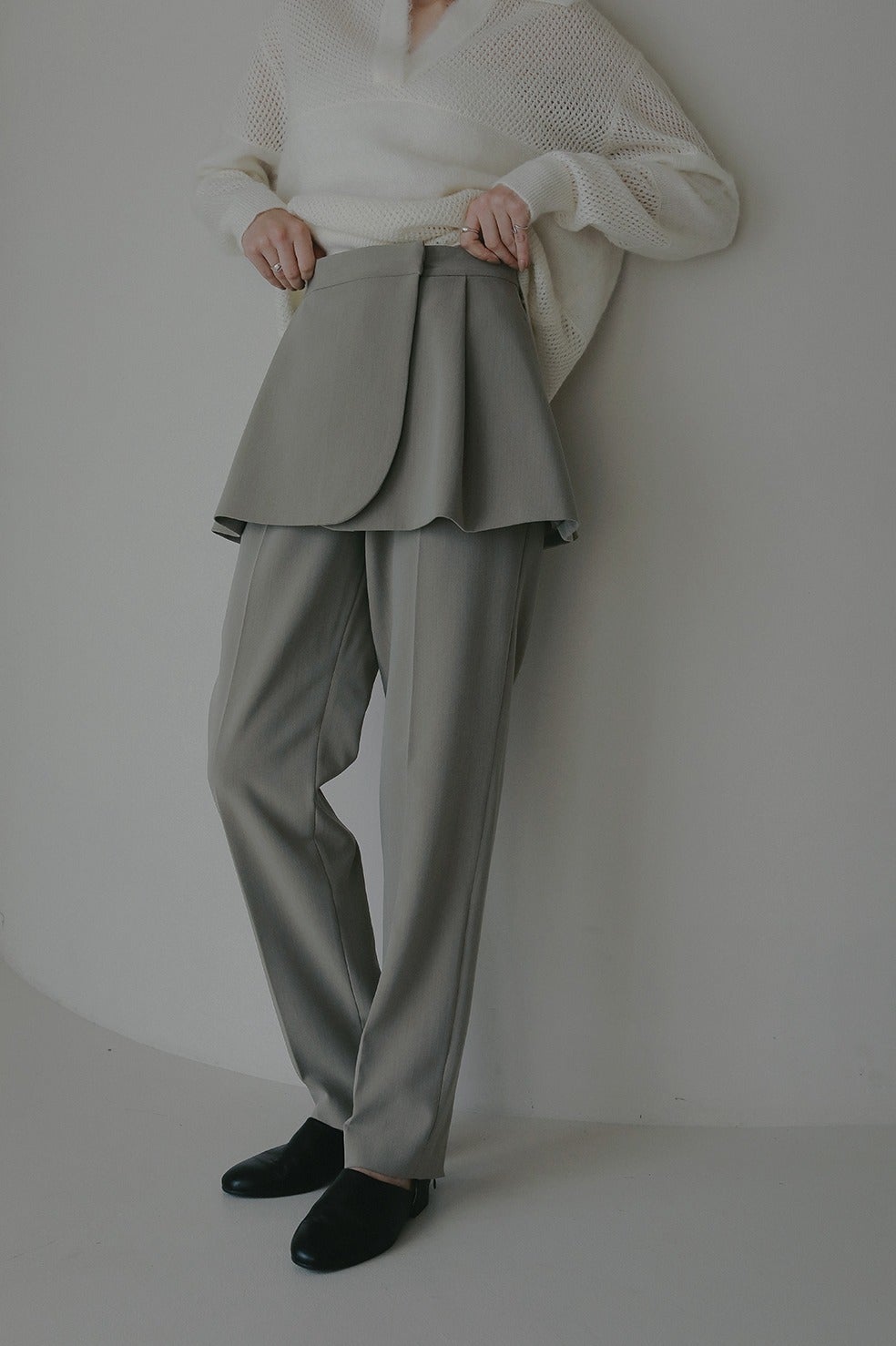 ミニスカートがセットとなったレイヤードスタイルを楽しめるパンツ。