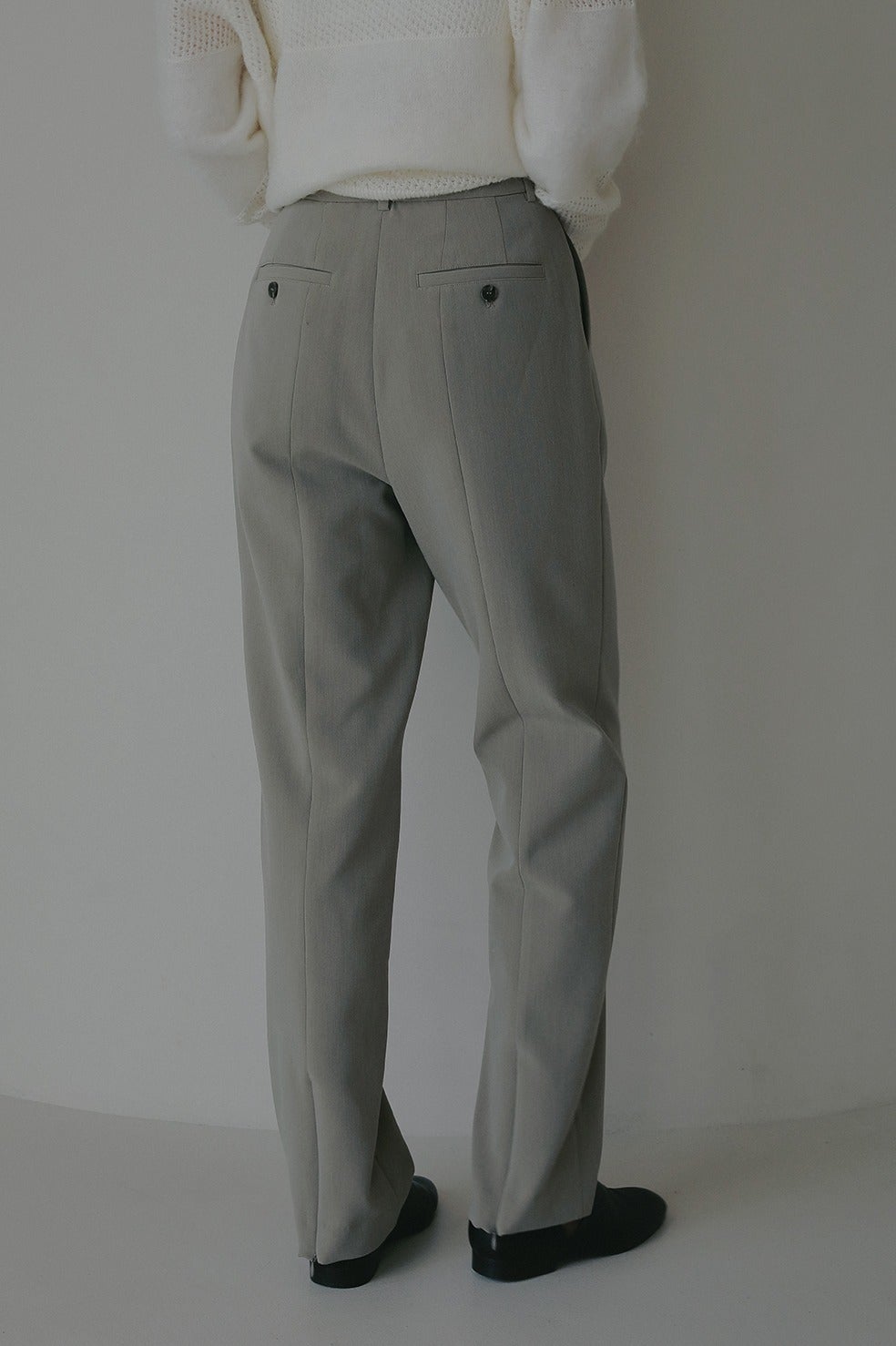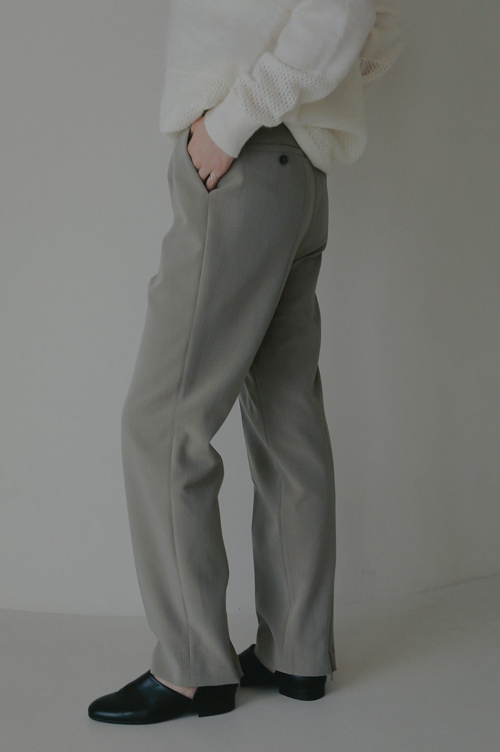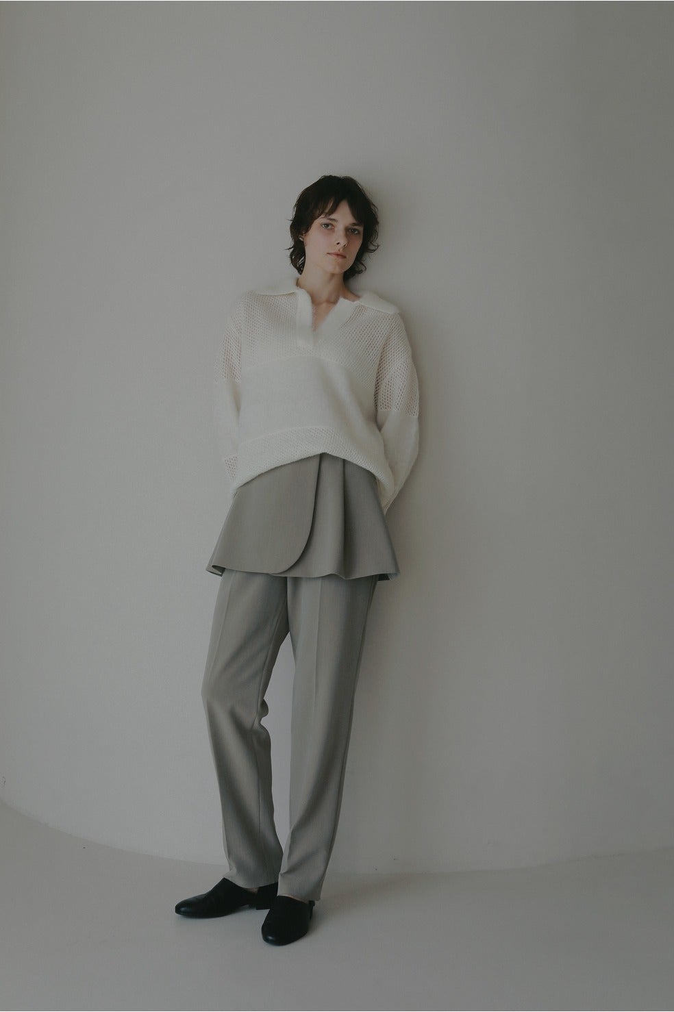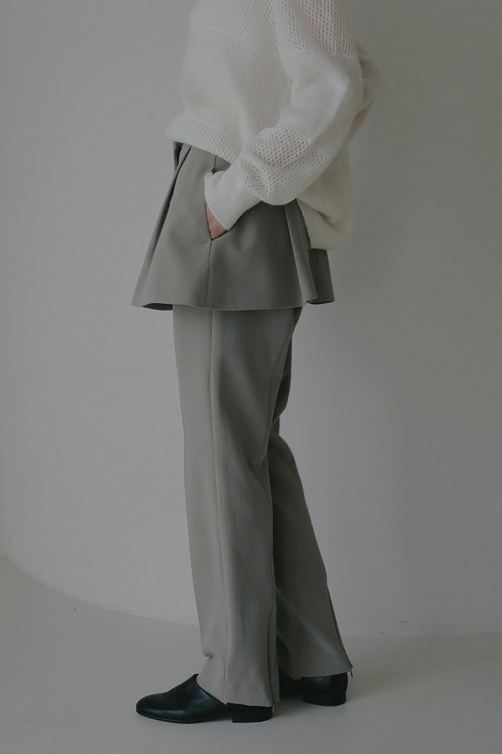 パンツは後ろウエストに調整できるゴムが付いており、裾のファスナーを開けるとスリットデザインになりテーパードからフレアシルエットに変えられる2WAY仕様。