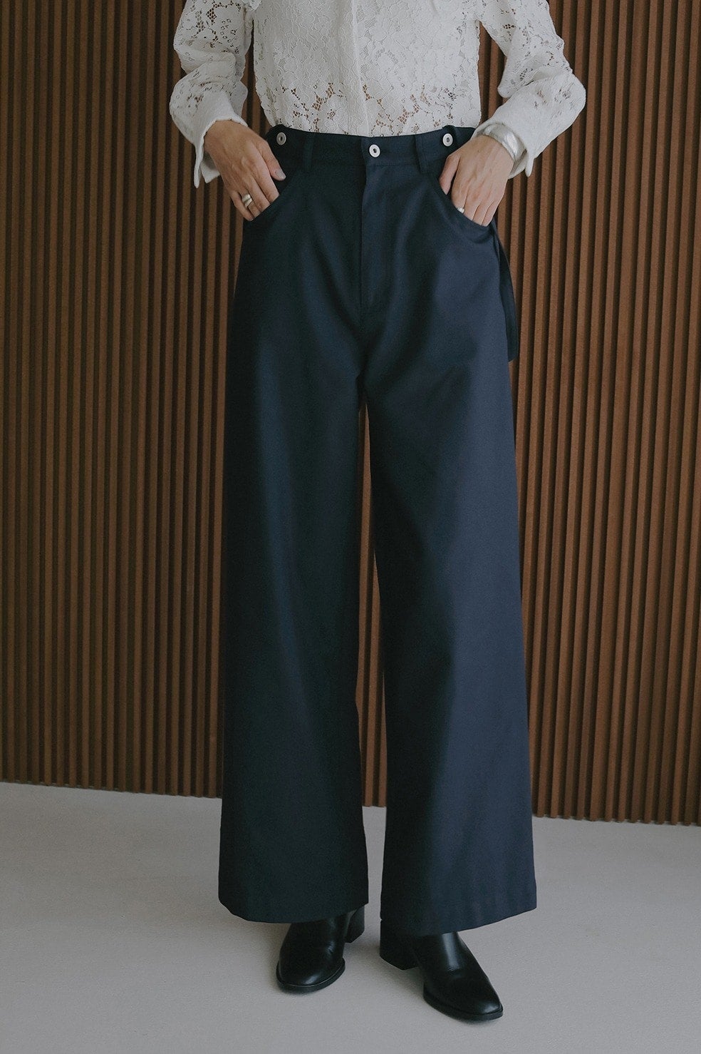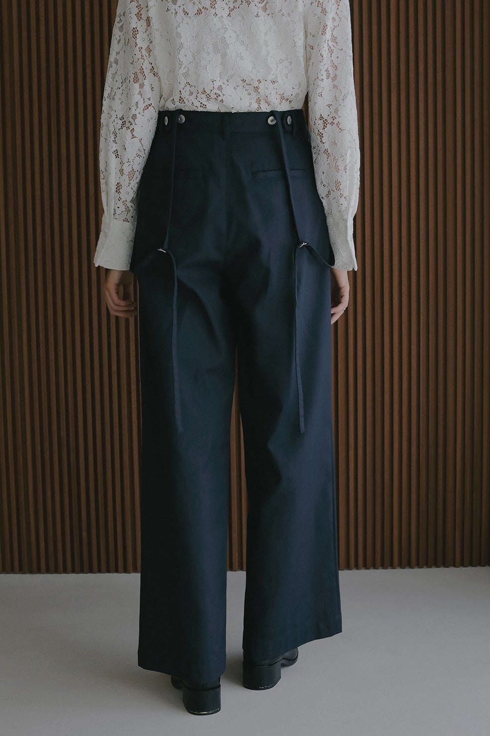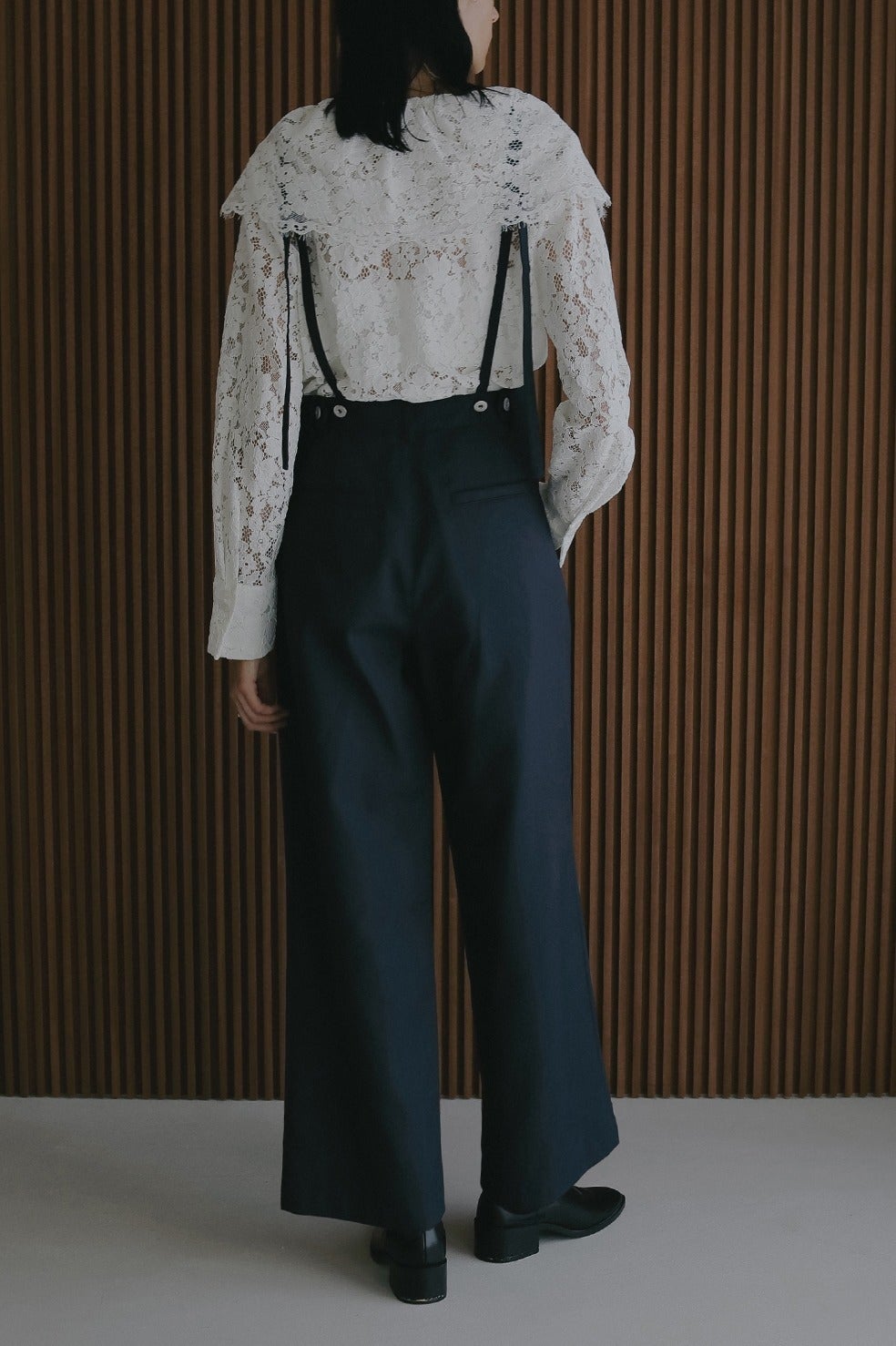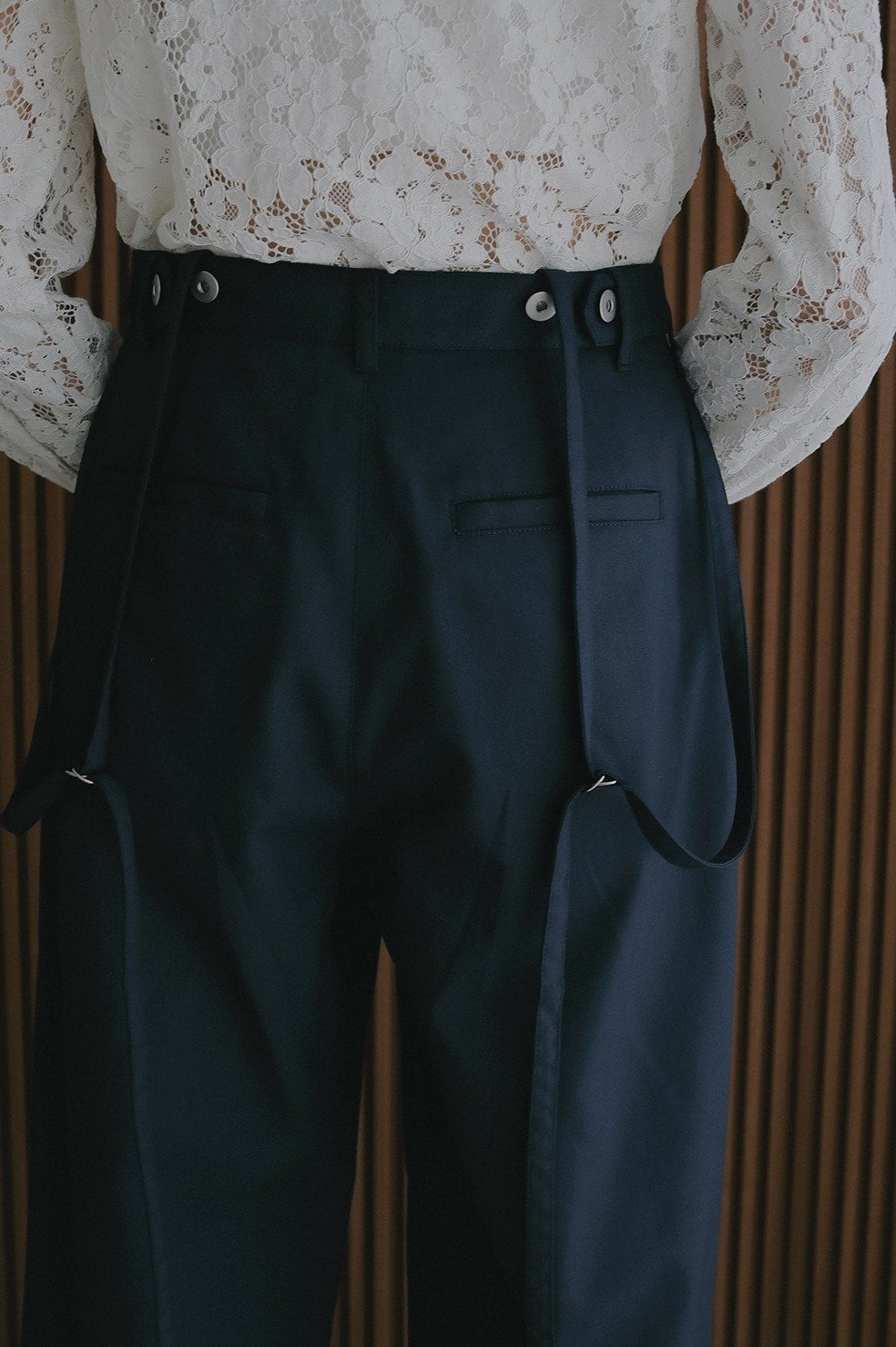 ポリエステルコットンのツイル素材を使用したサスペンダーパンツ。