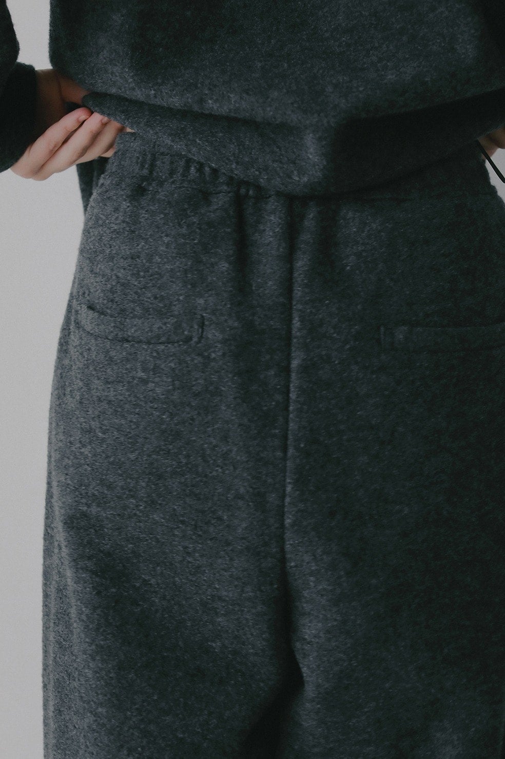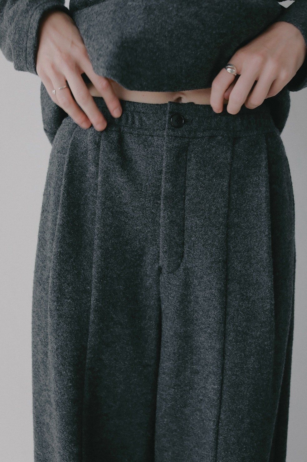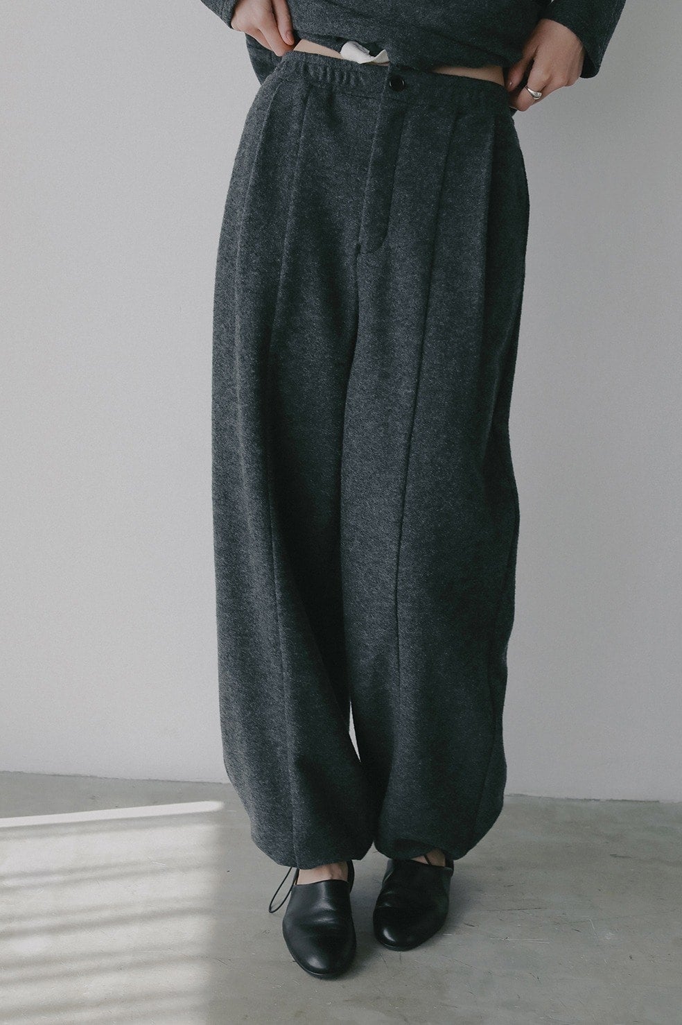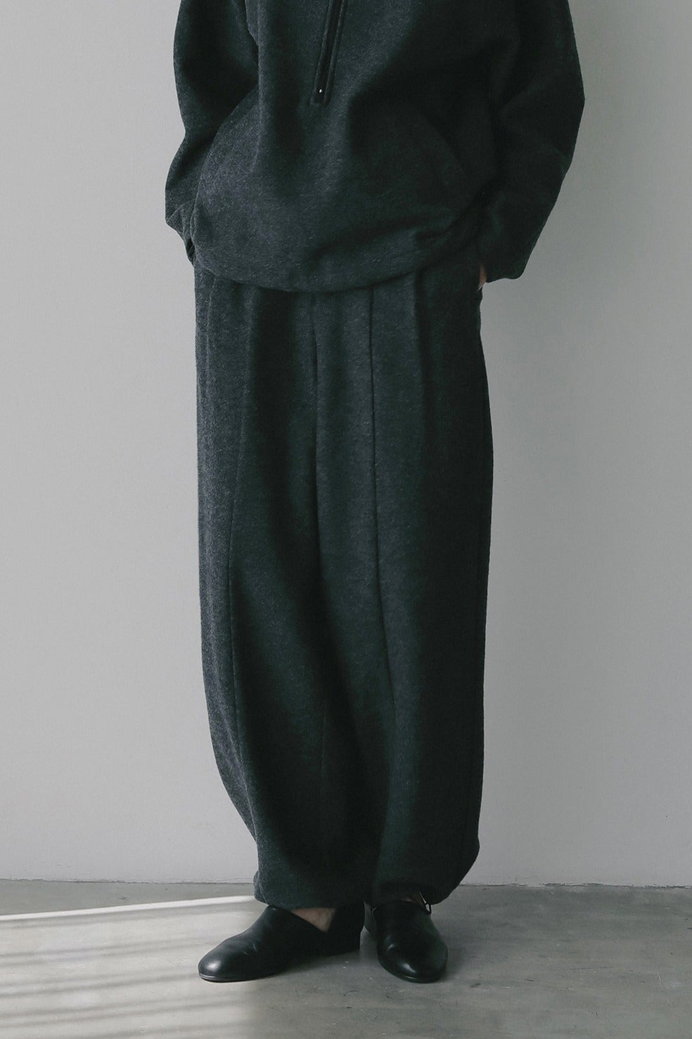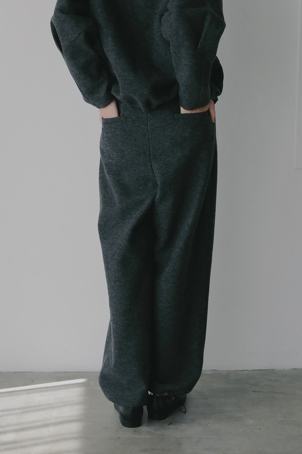 ウールリングの生地に圧縮をかけた独特な表情の生地を使ったパンツ。