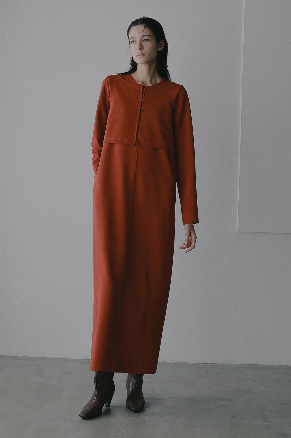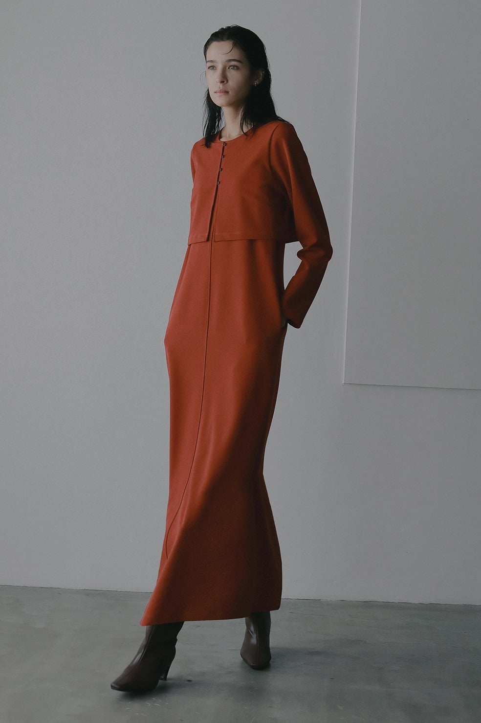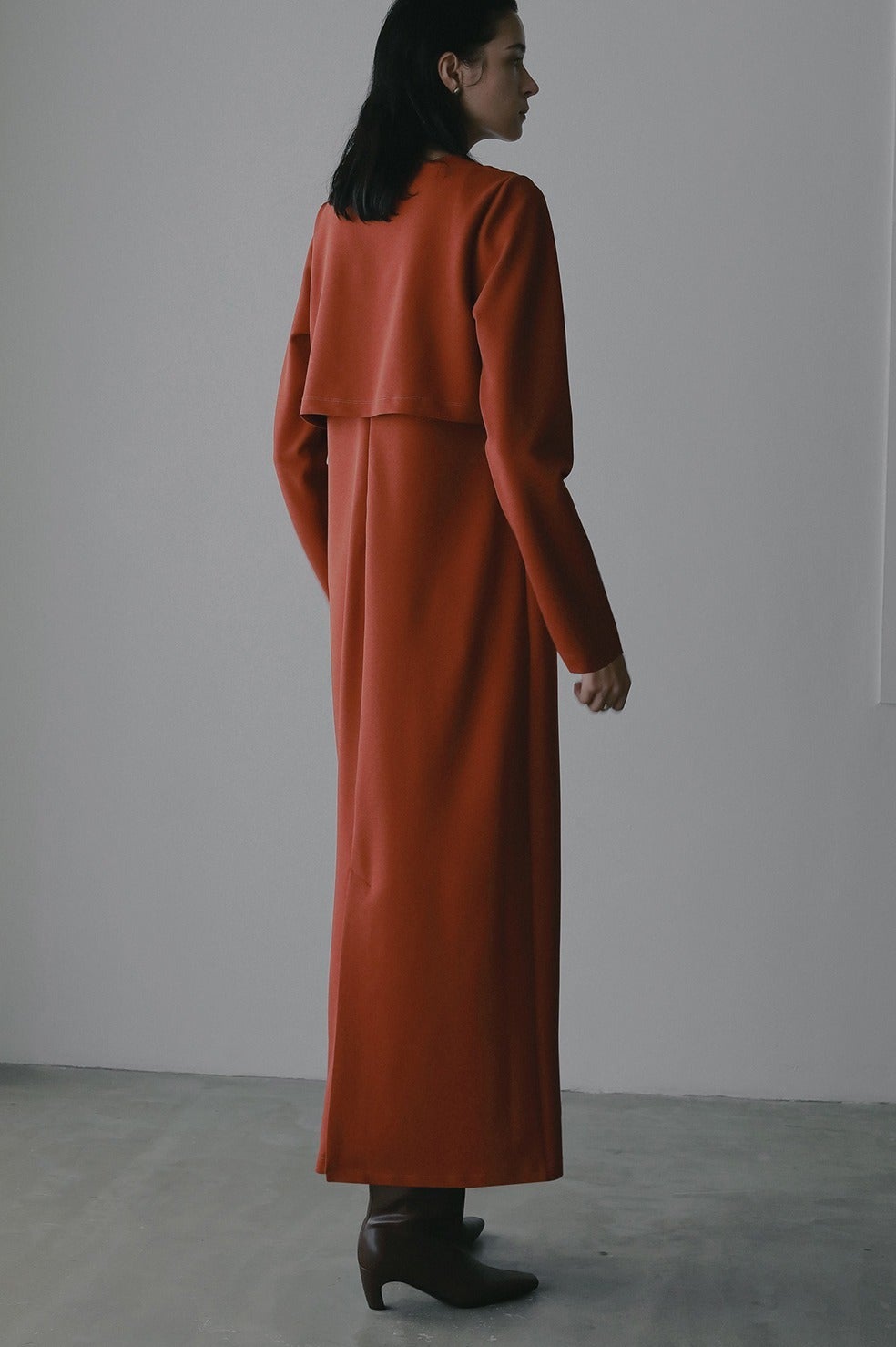 アメリカンスリーブのすっきりとしたIラインワンピースにショート丈のブラウスをレイヤードし、スタイルアップ見えするバランスに。