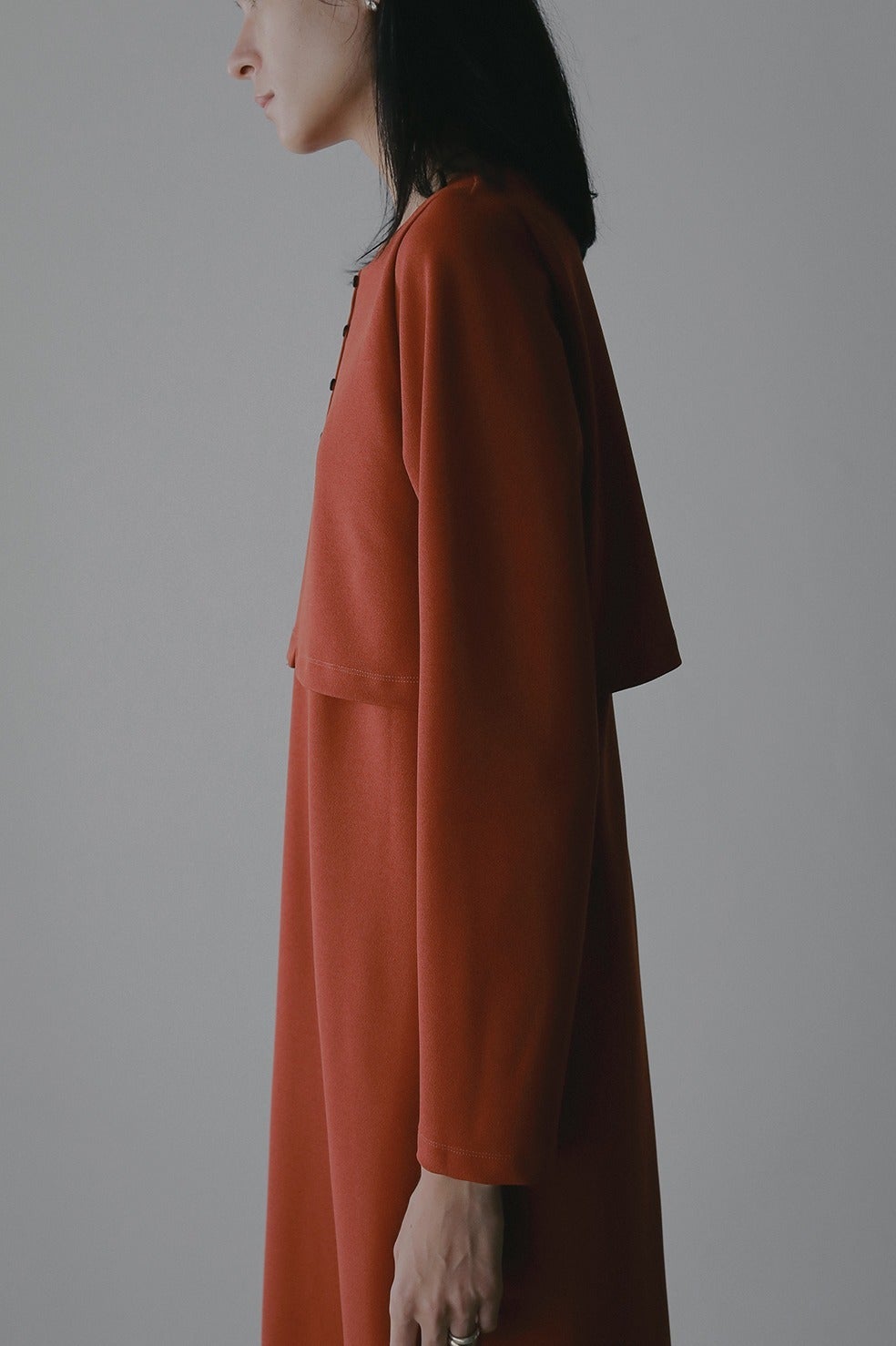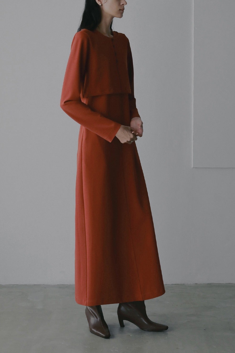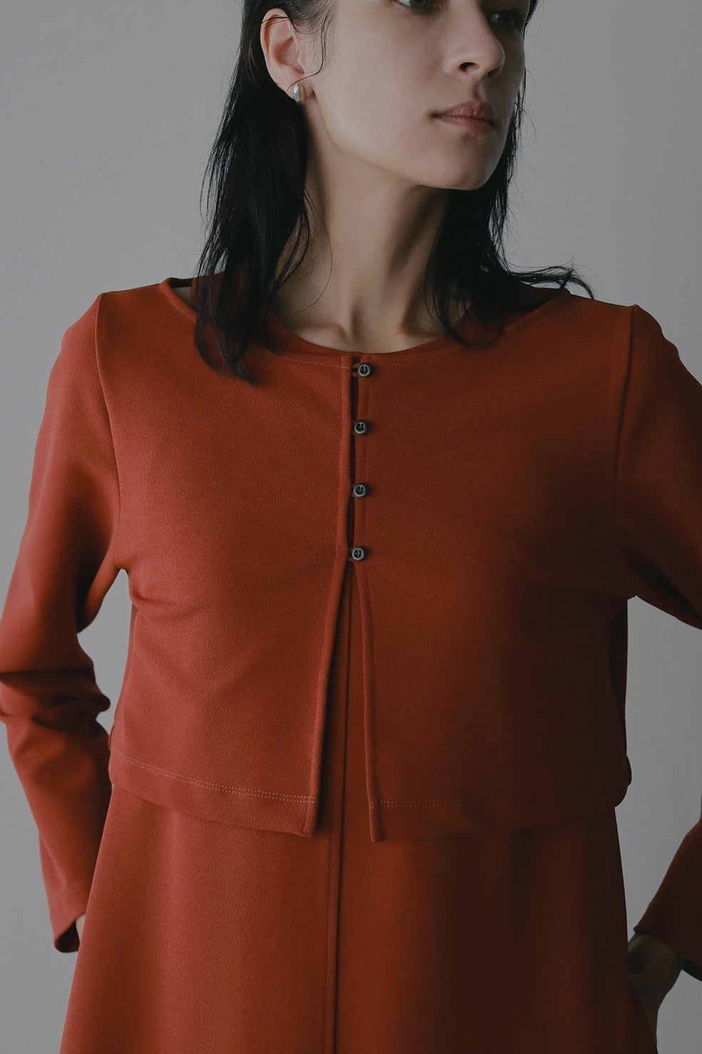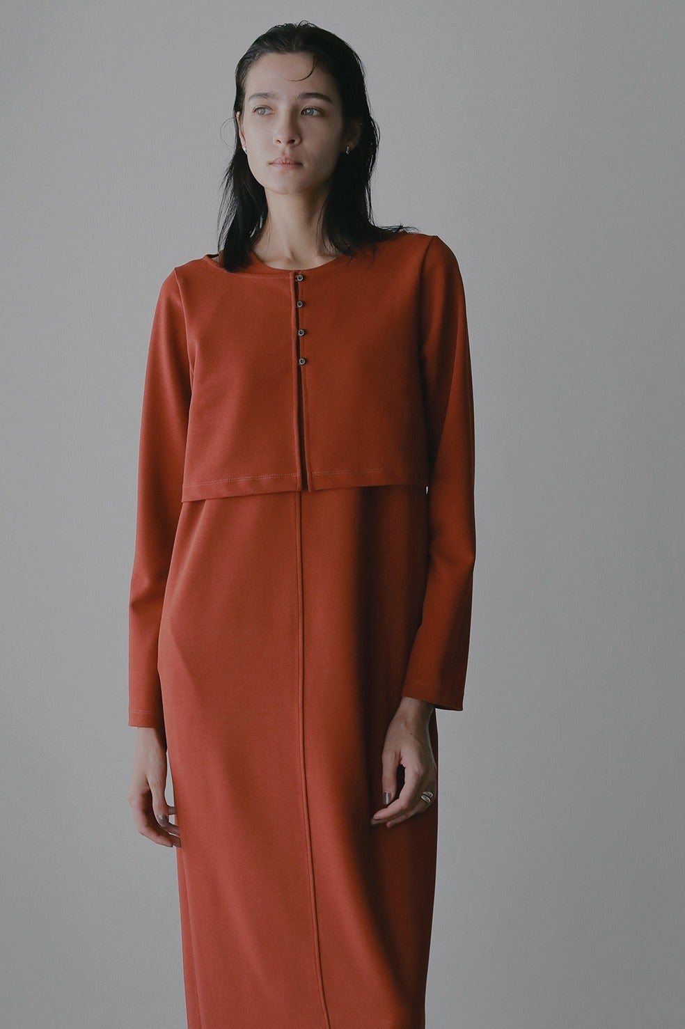 アメリカンスリーブのすっきりとしたIラインワンピースにショート丈のブラウスをレイヤードし、スタイルアップ見えするバランスに。