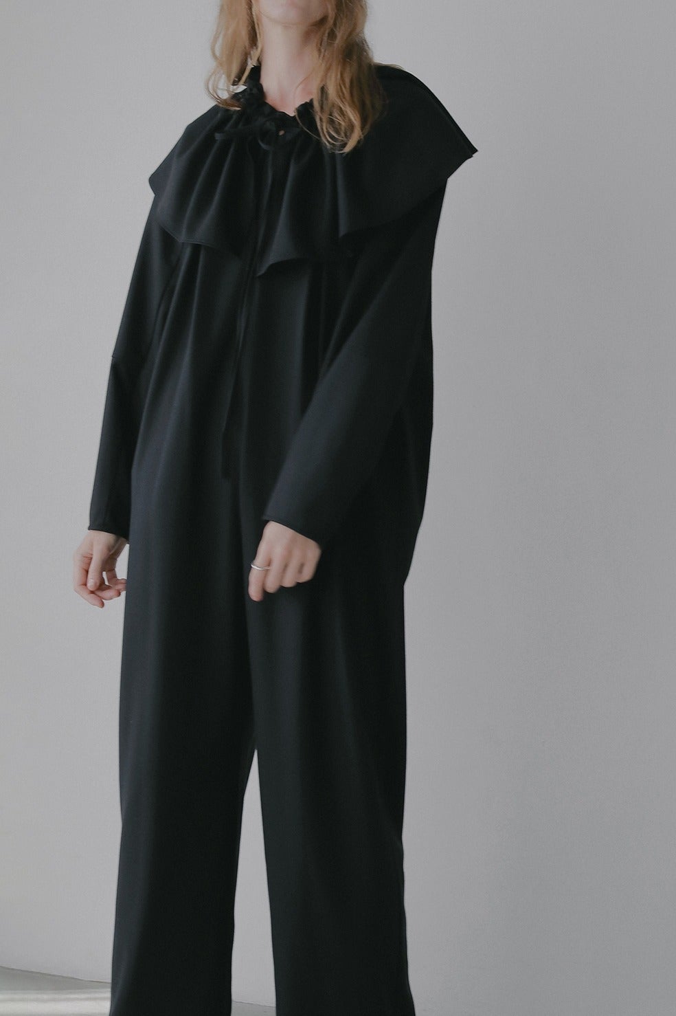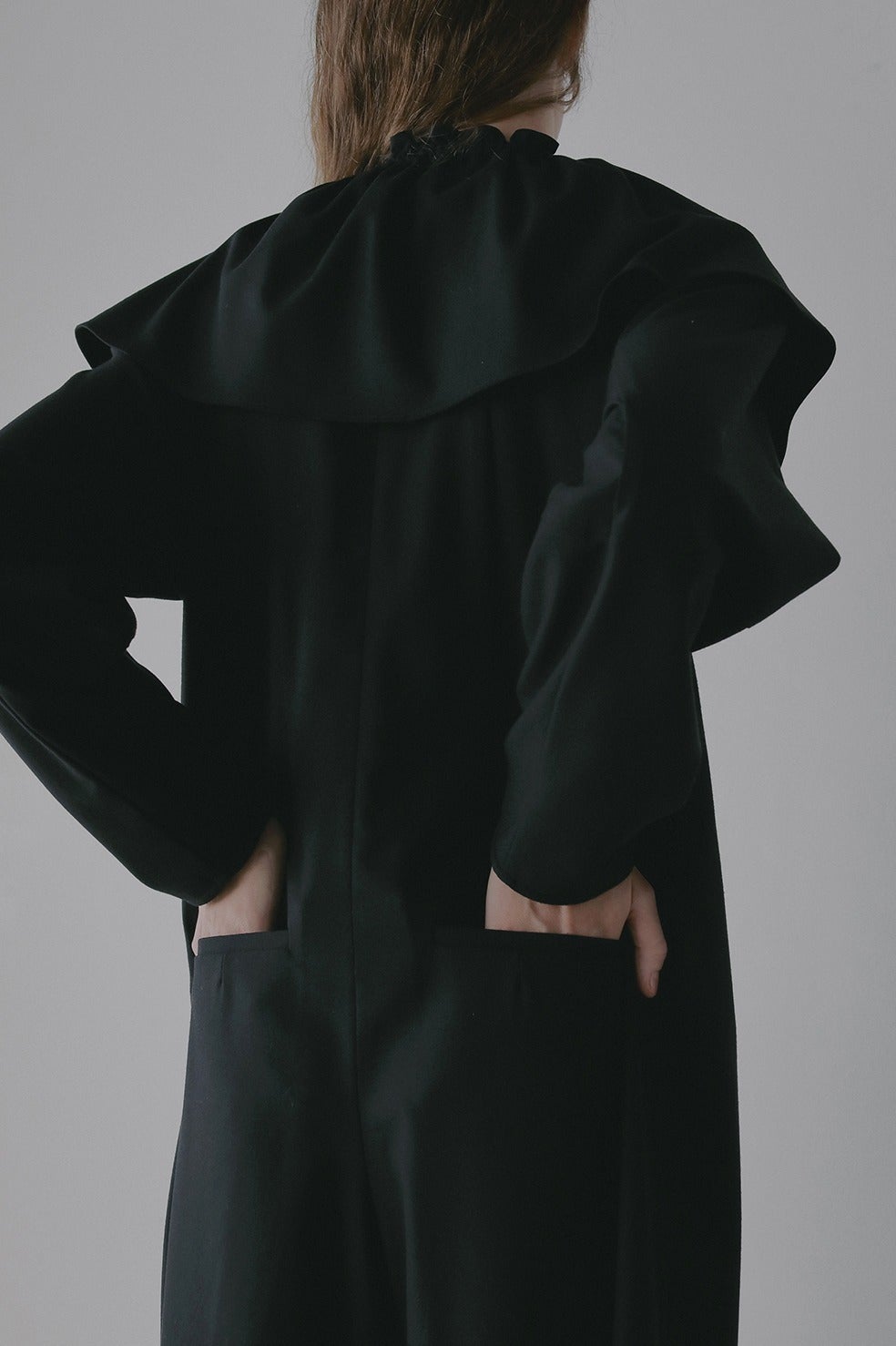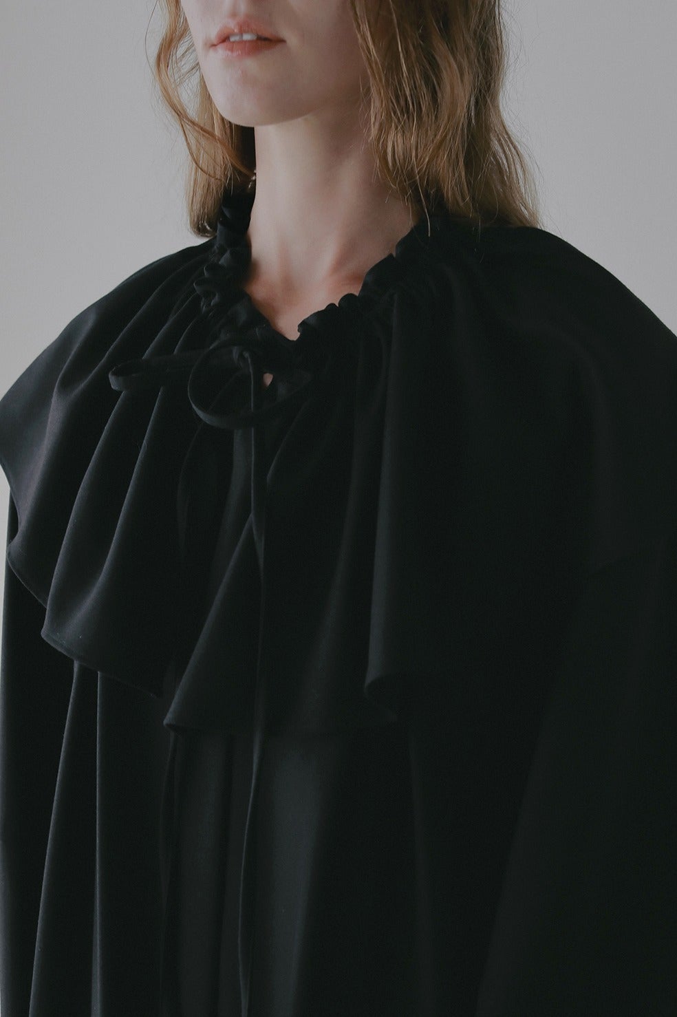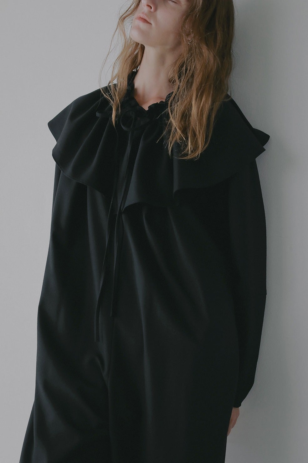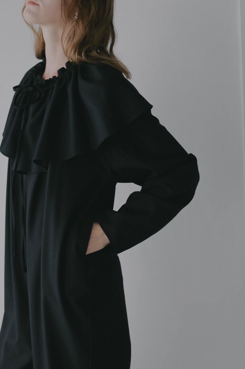 取り外し出来るフリル衿は紐で調整可能なのでお好みのボリュームに調整していただけます。少しオフショル気味に衿を抜いてつけたり、たすき掛けのようにつけたり、ウエストに巻いたりと様々にアレンジしてお使いいただけます。