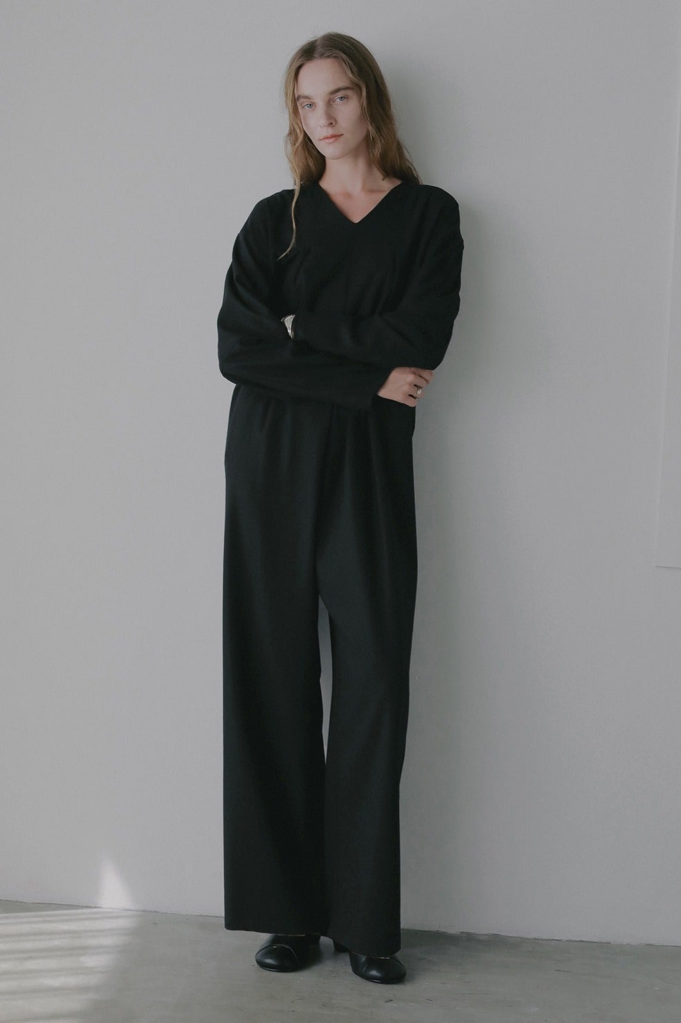 体のラインを拾わないゆったりしたワイドシルエットと、丸みをもたせた袖のシルエットがMANOFらしい1着。