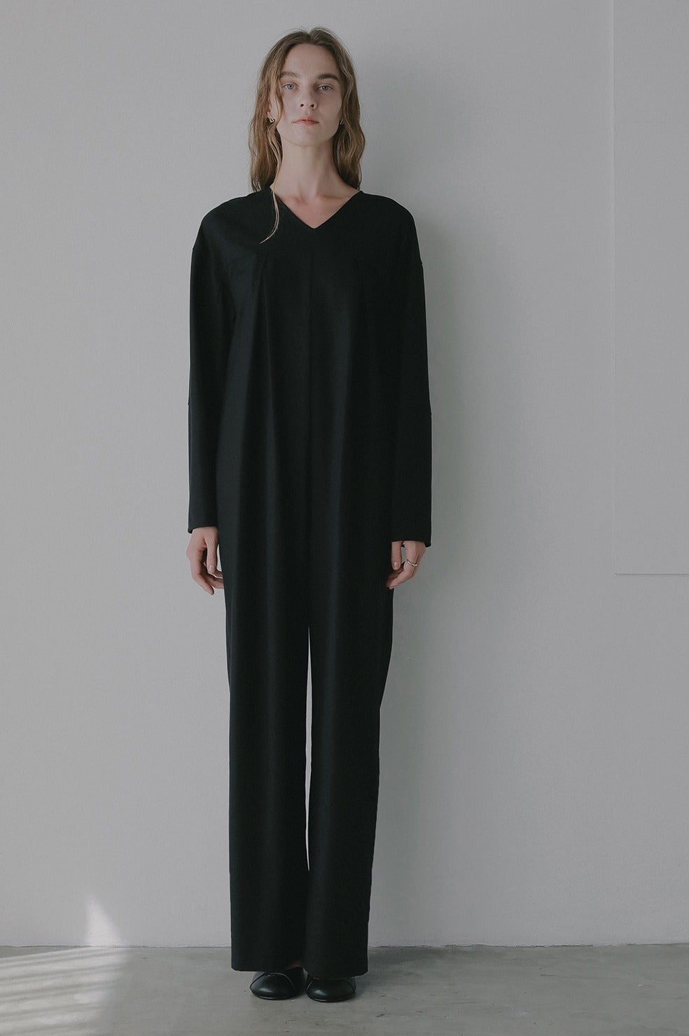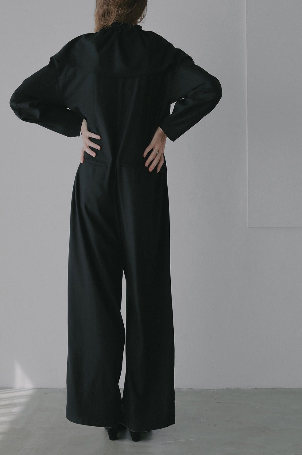 襟を外したオールインワンは浅めのVネックなのでインナーを入れなくても1枚で安心。大人っぽい印象で着ていただけます。