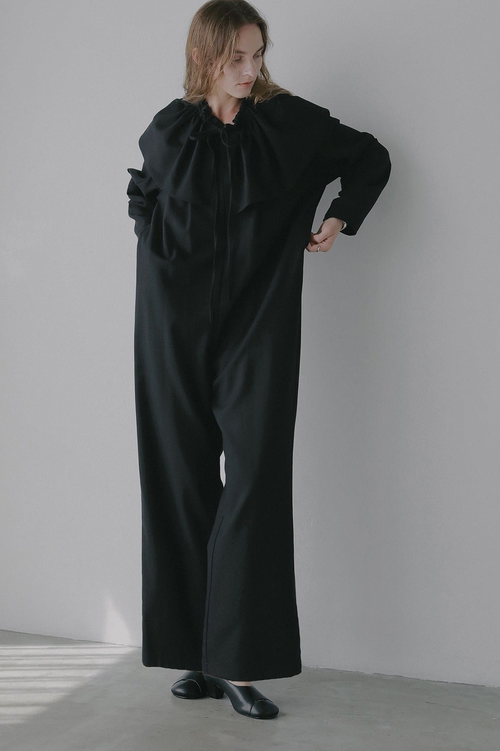 取り外し可能なフリル衿がポイントのオールインワン。