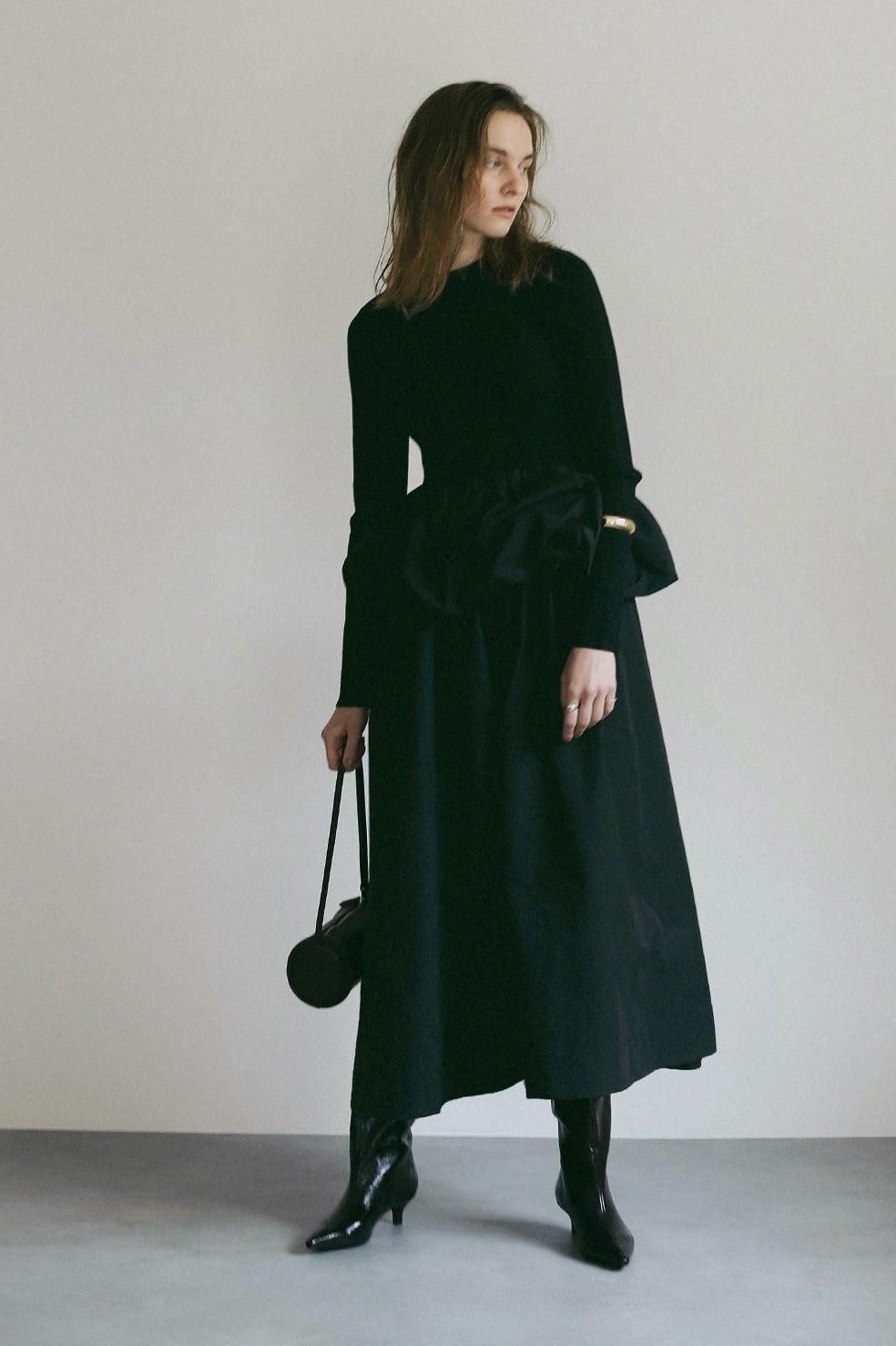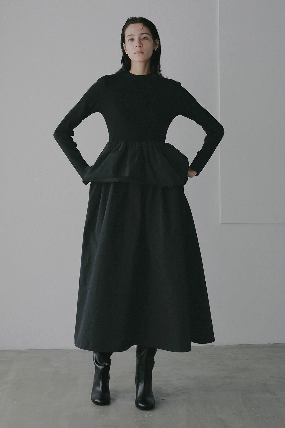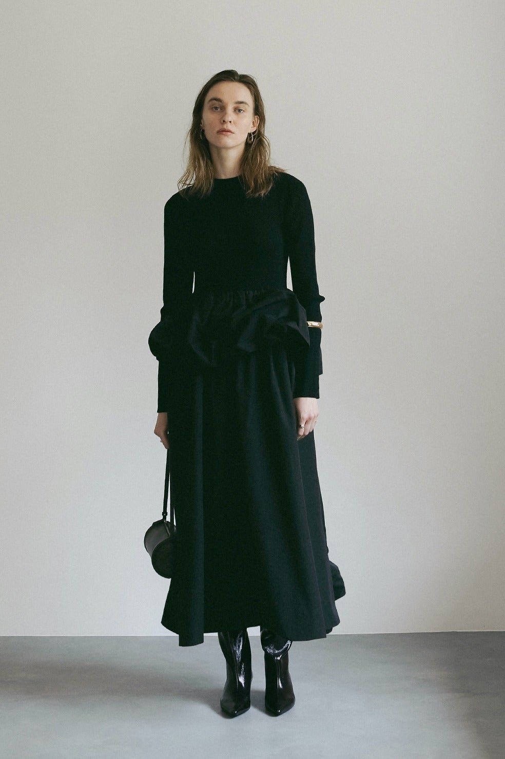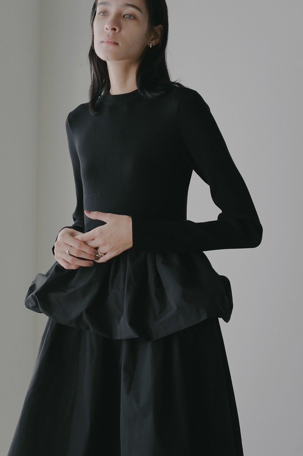 身頃はフィット感としっとりとした肌触りの良いニット素材で女性らしいラインを引き立てつつ、スカート部分はふんわりと広がるハリのある布帛生地を使用。