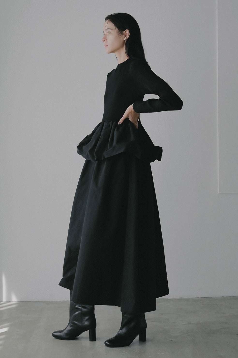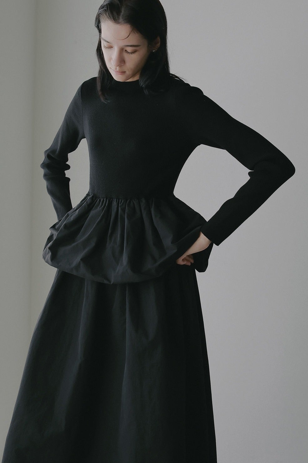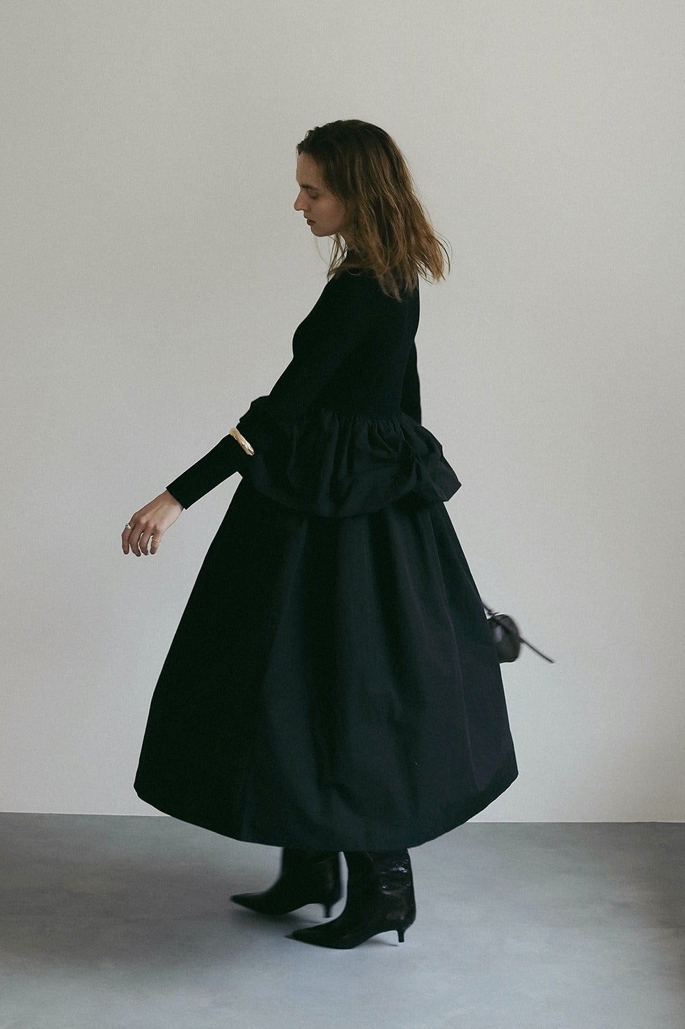 身頃はフィット感としっとりとした肌触りの良いニット素材で女性らしいラインを引き立てつつ、スカート部分はふんわりと広がるハリのある布帛生地を使用。