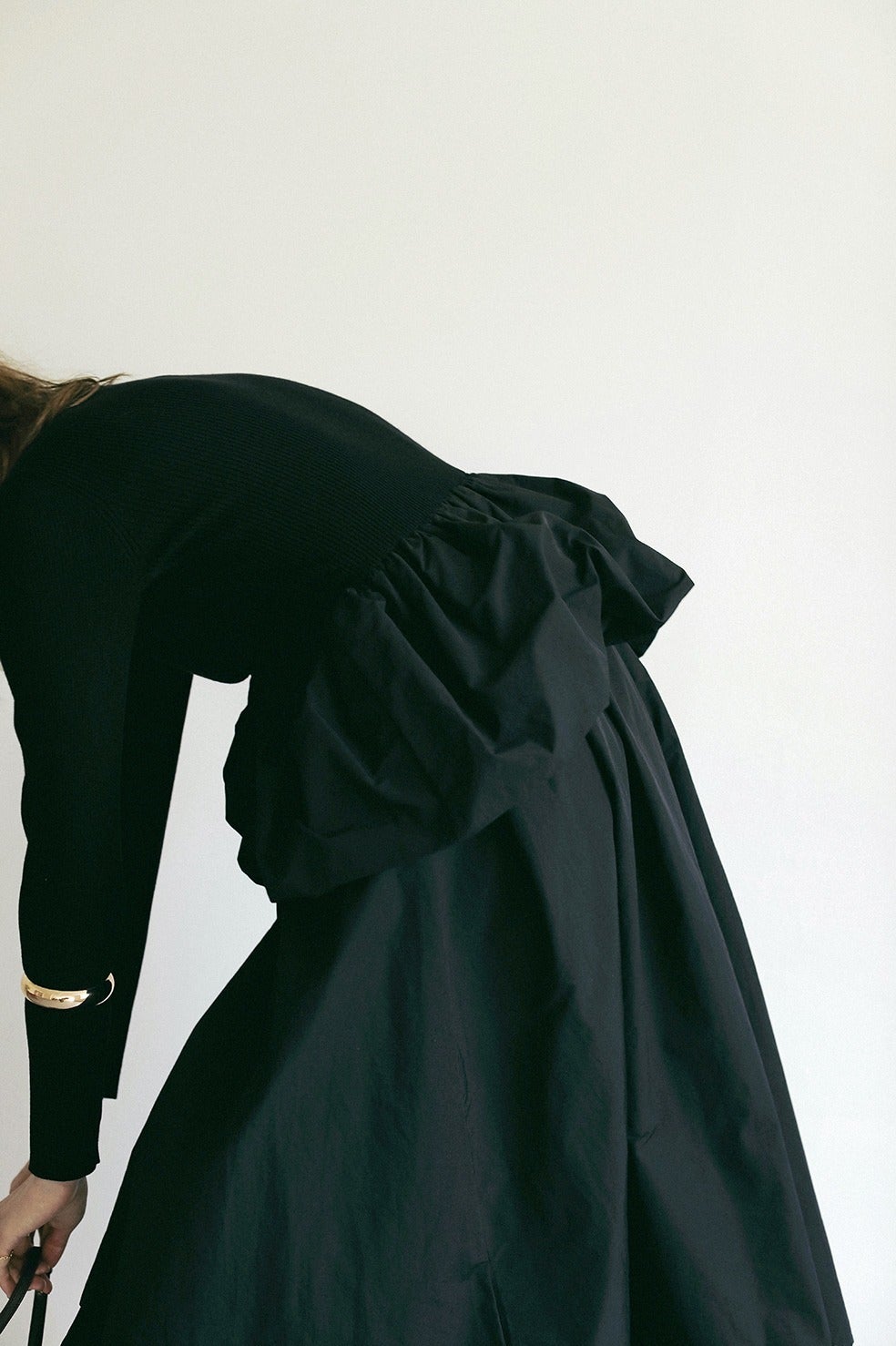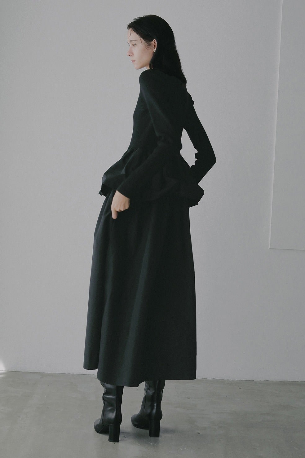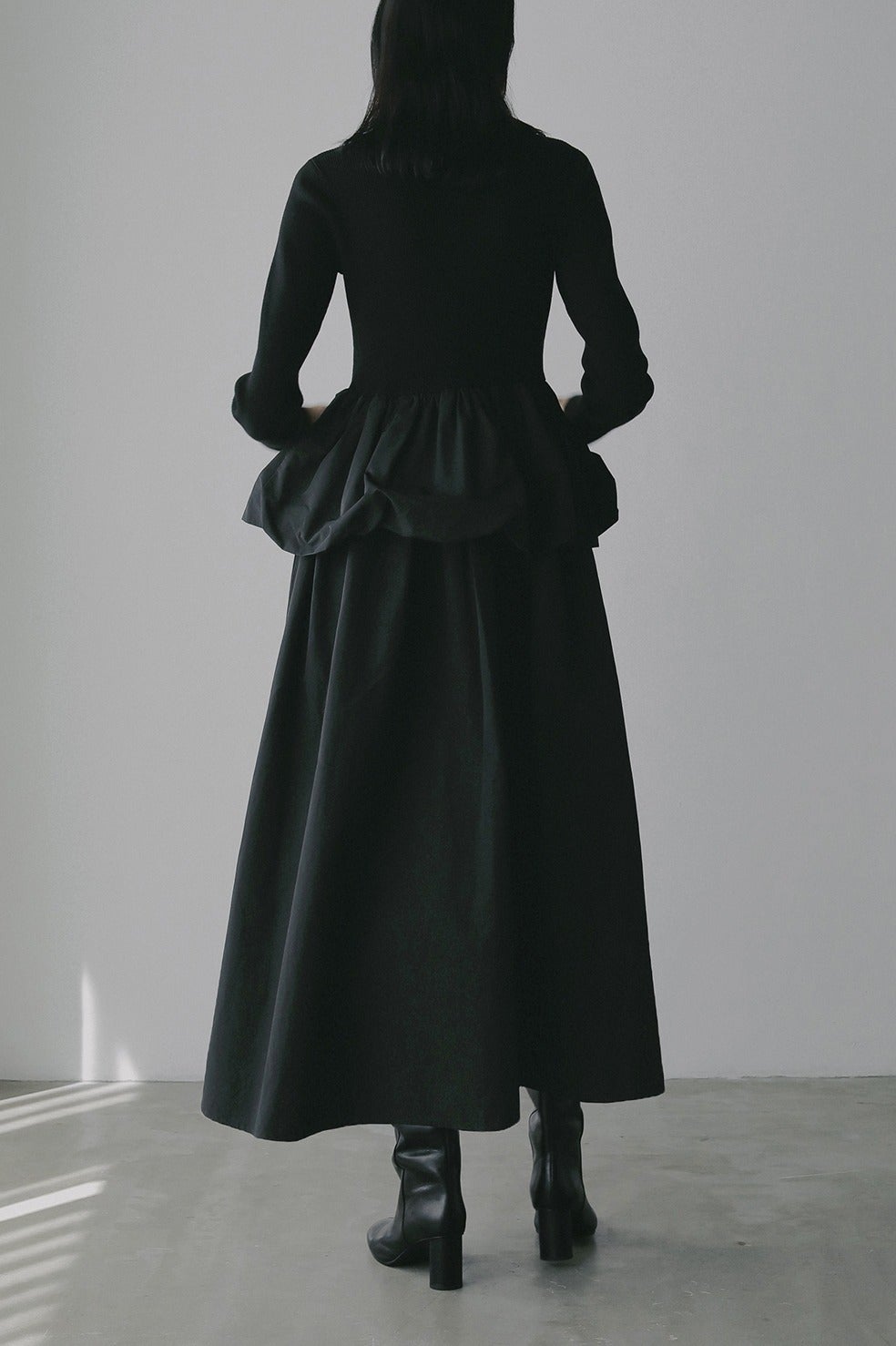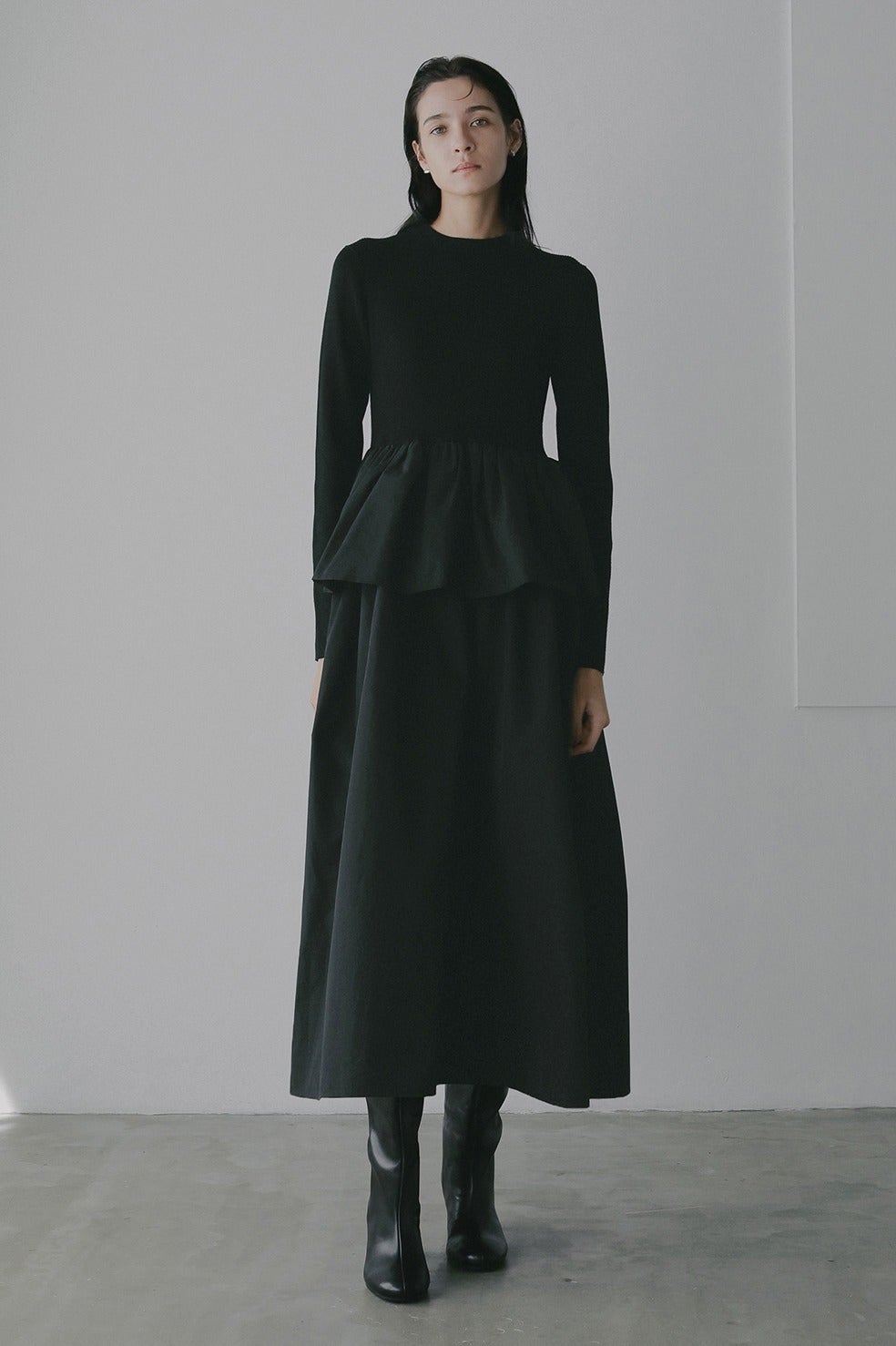 身頃はフィット感としっとりとした肌触りの良いニット素材で女性らしいラインを引き立てつつ、スカート部分はふんわりと広がるハリのある布帛生地を使用。