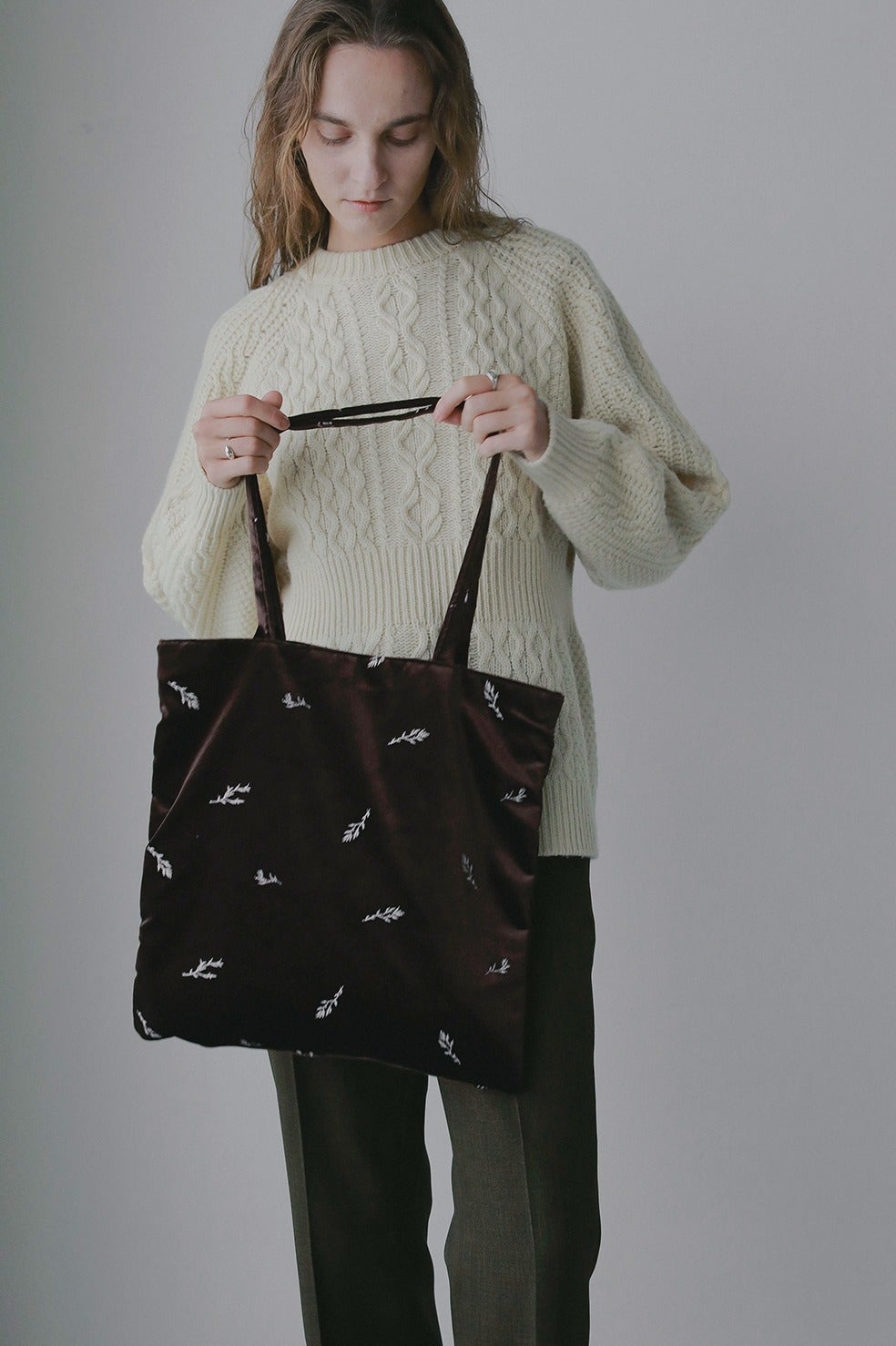 リーフモチーフのオリジナル柄を刺繍加工したベロア生地のオリジナルトート。