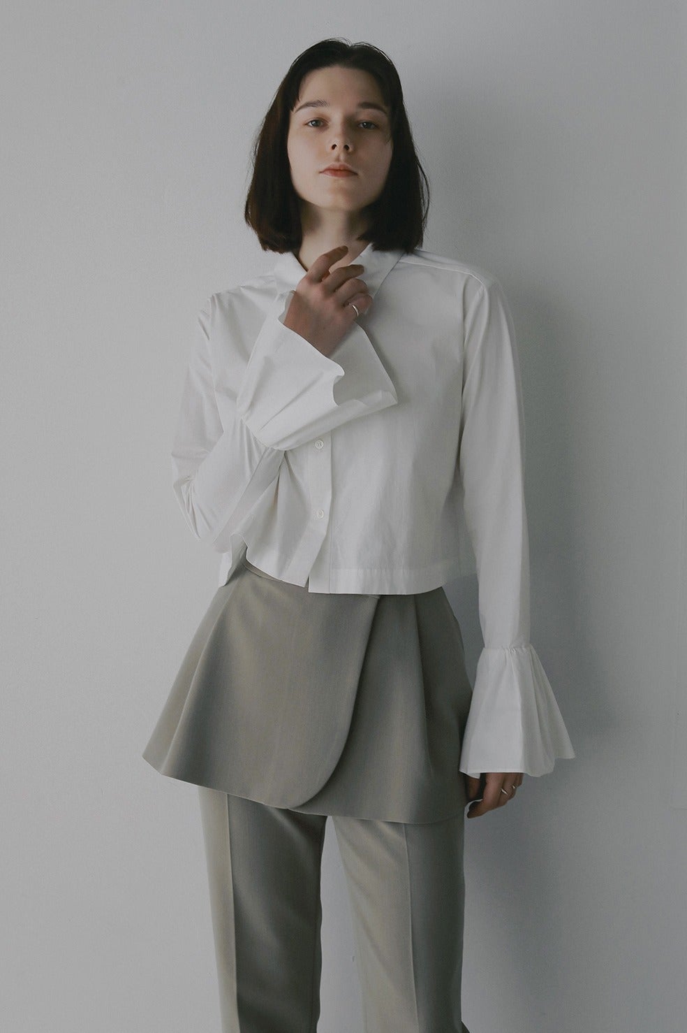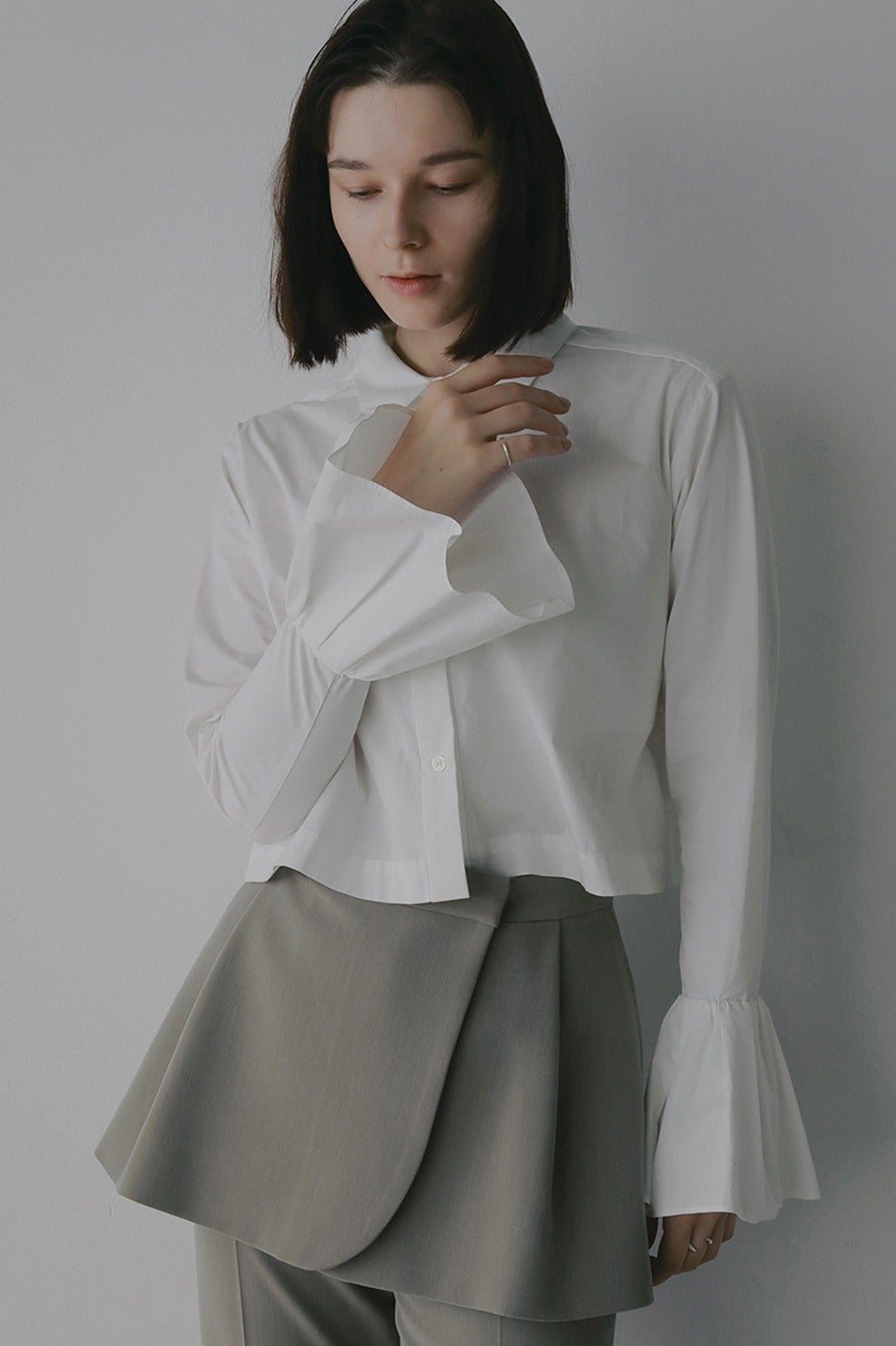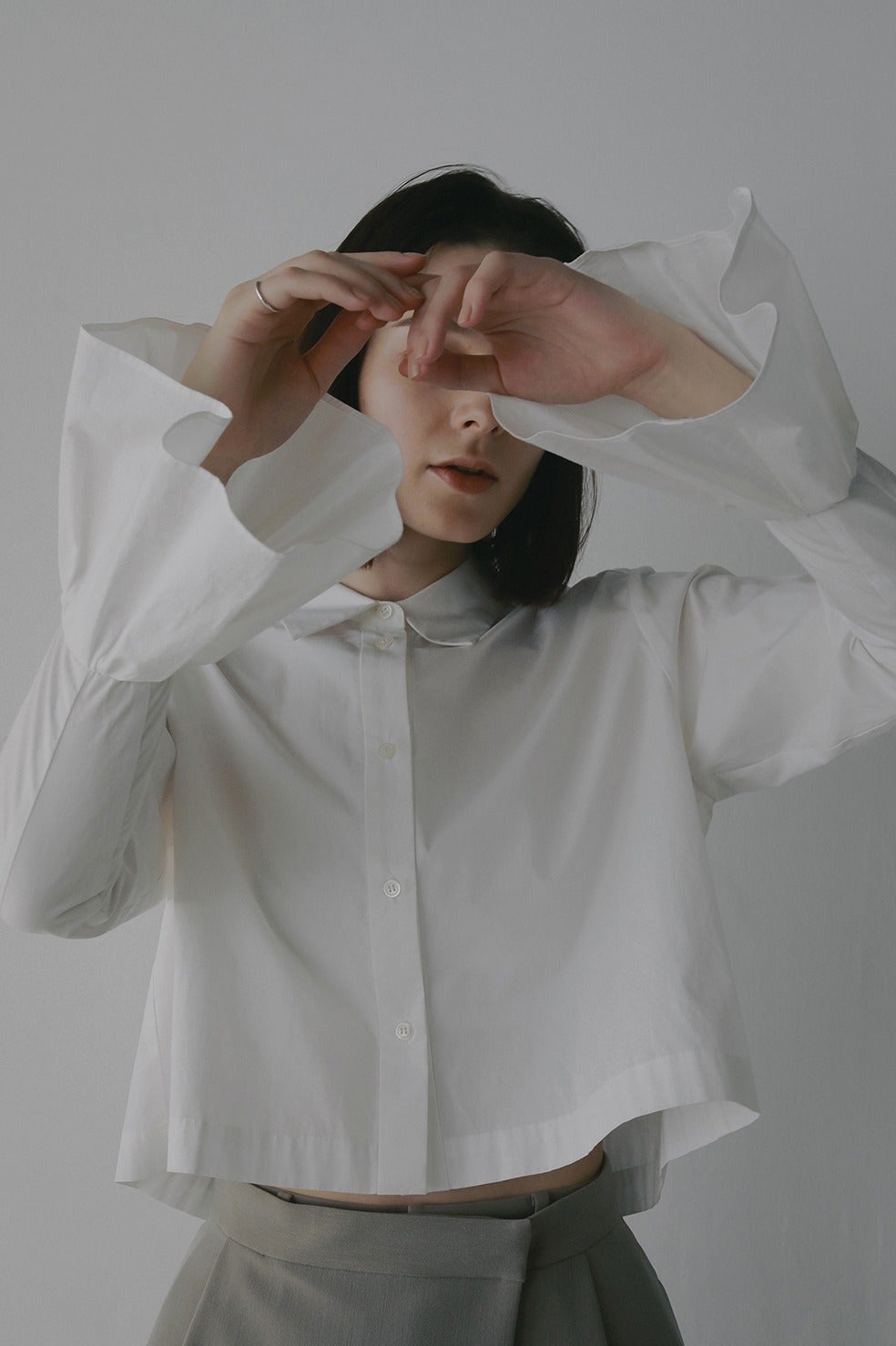 ショート丈と袖のフリルデザインがポイントのシャツ。