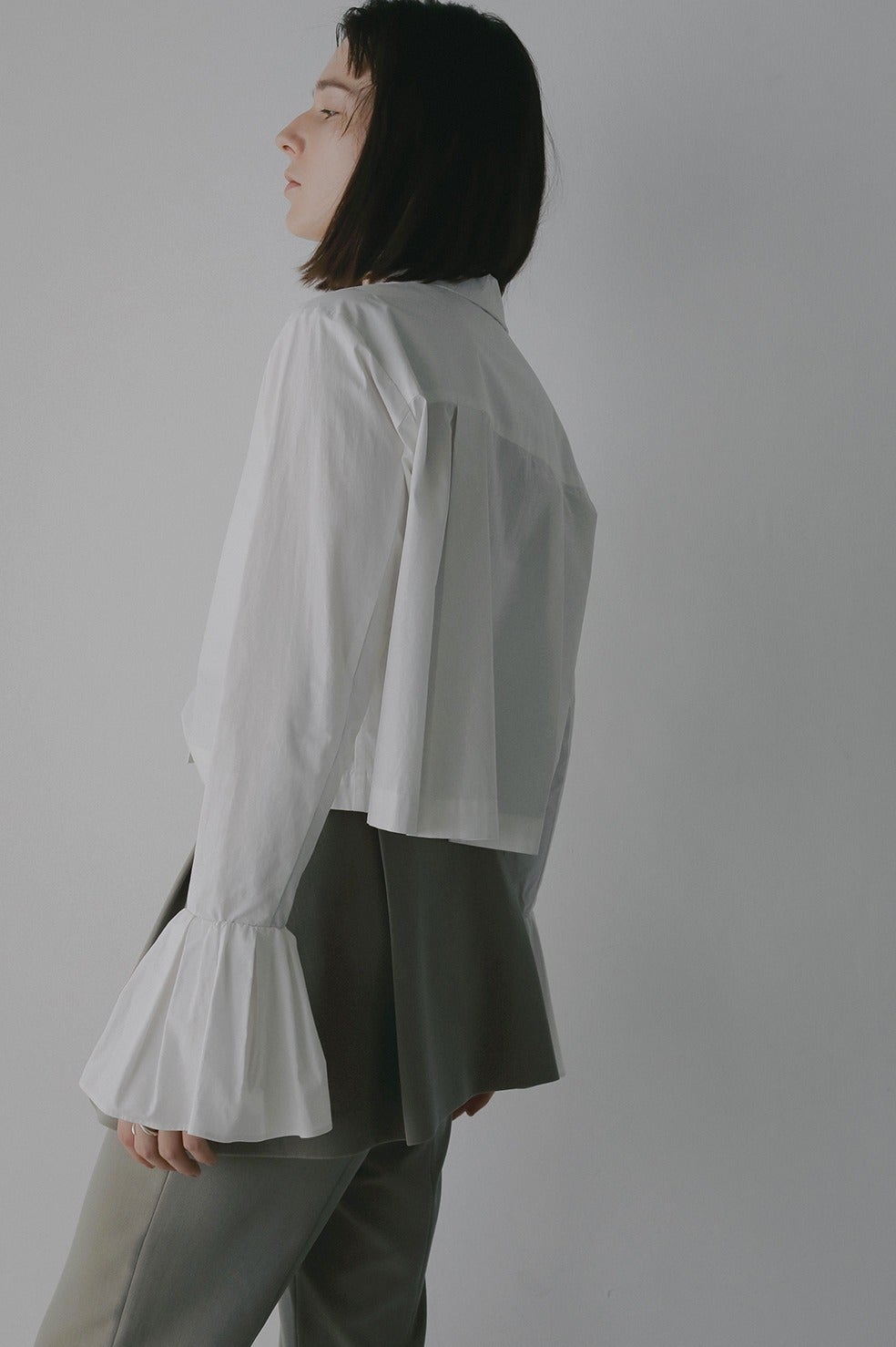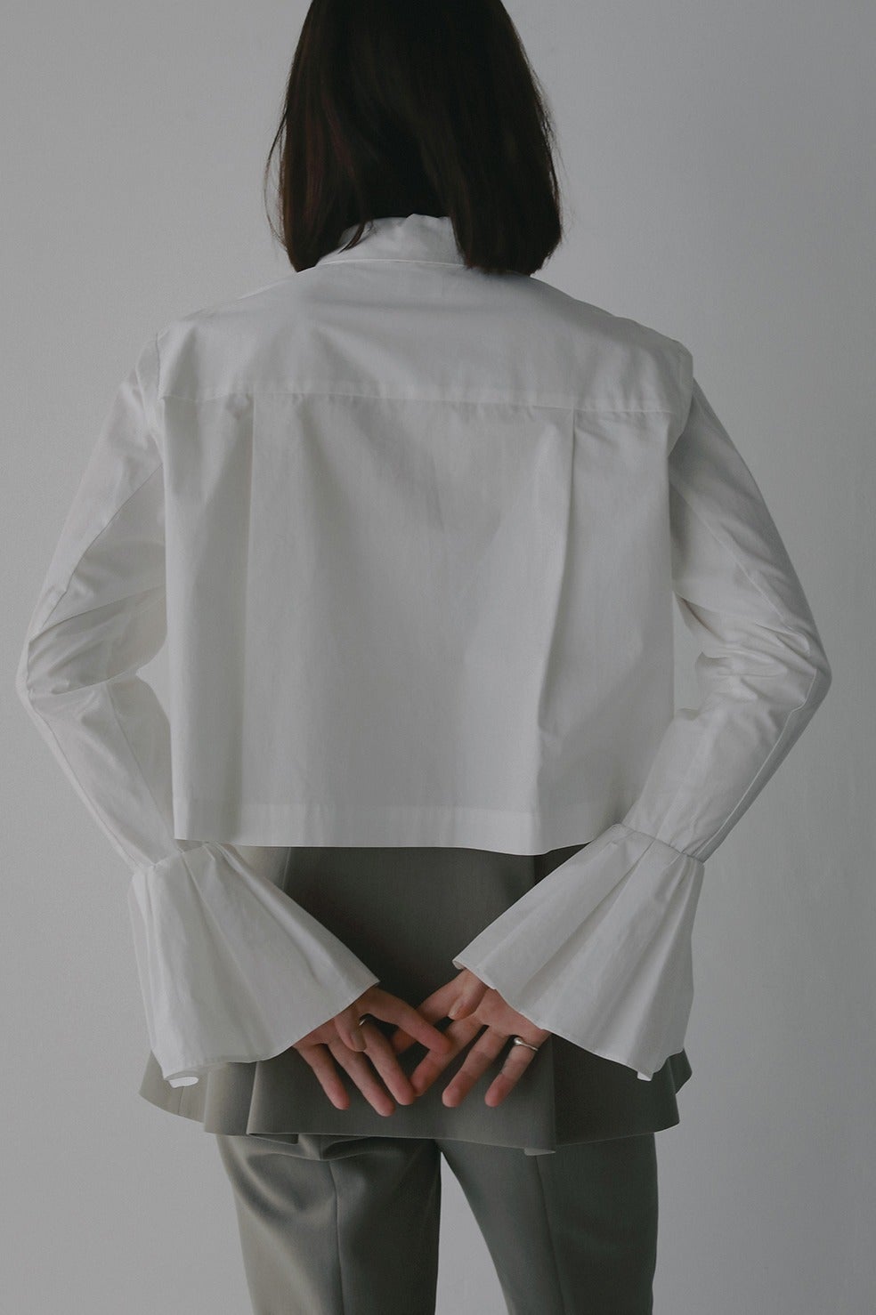 ボトムスとのバランスが取りやすいショート丈と、袖のフリルデザインが引き立つコンパクトな襟のバランスが絶妙な一着です。