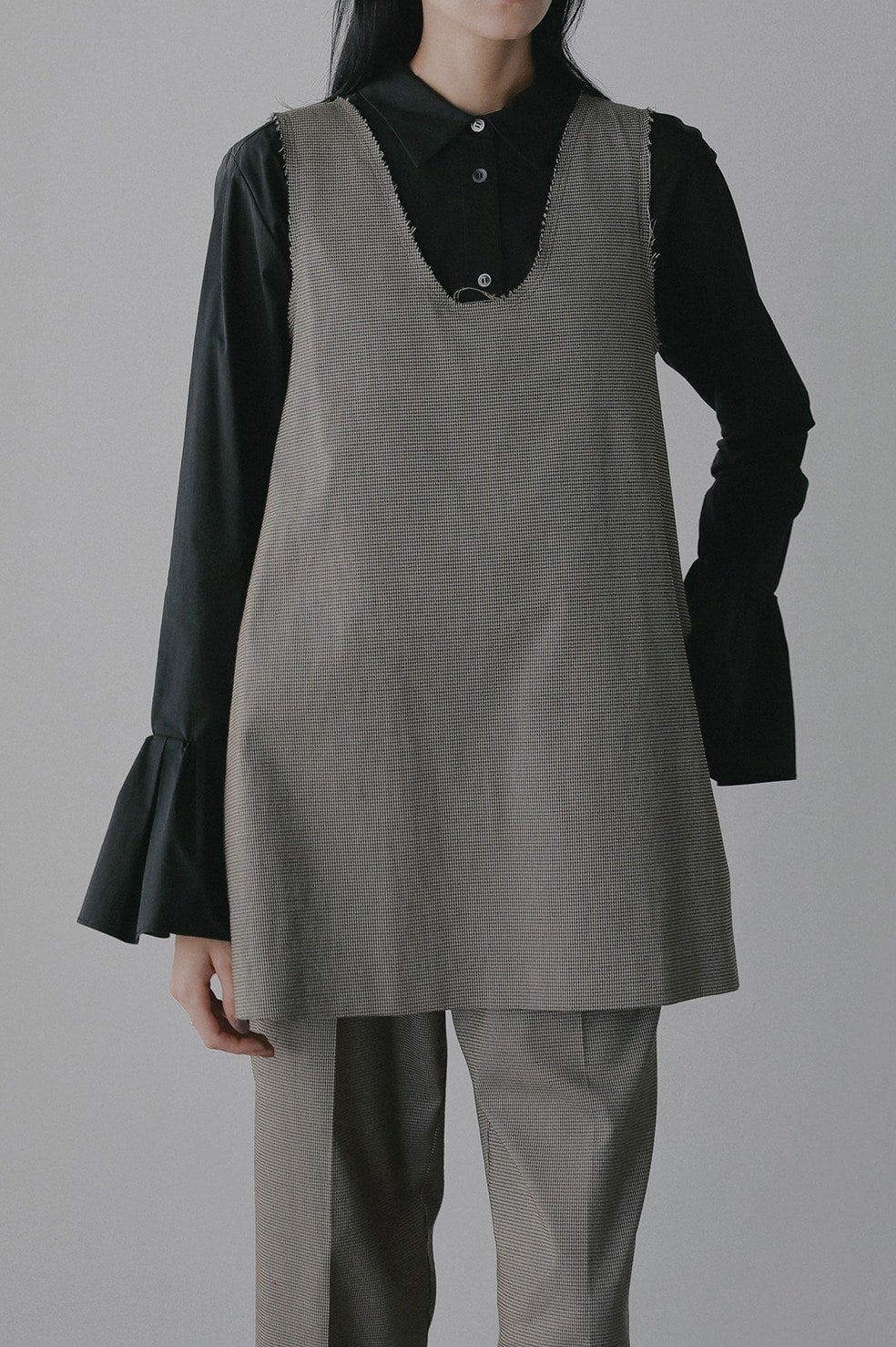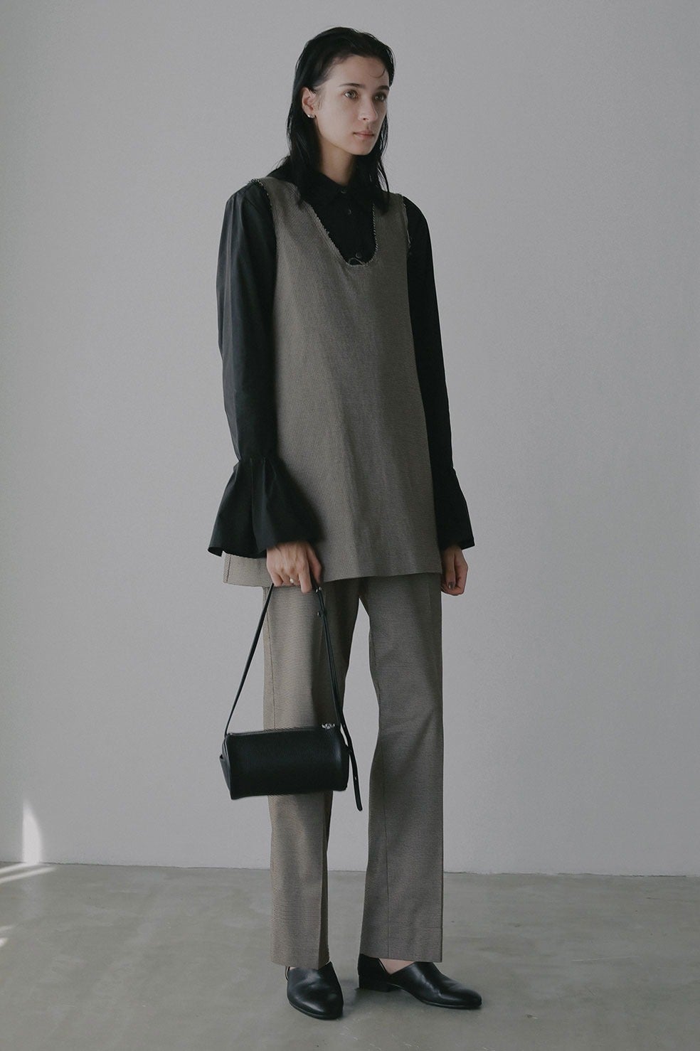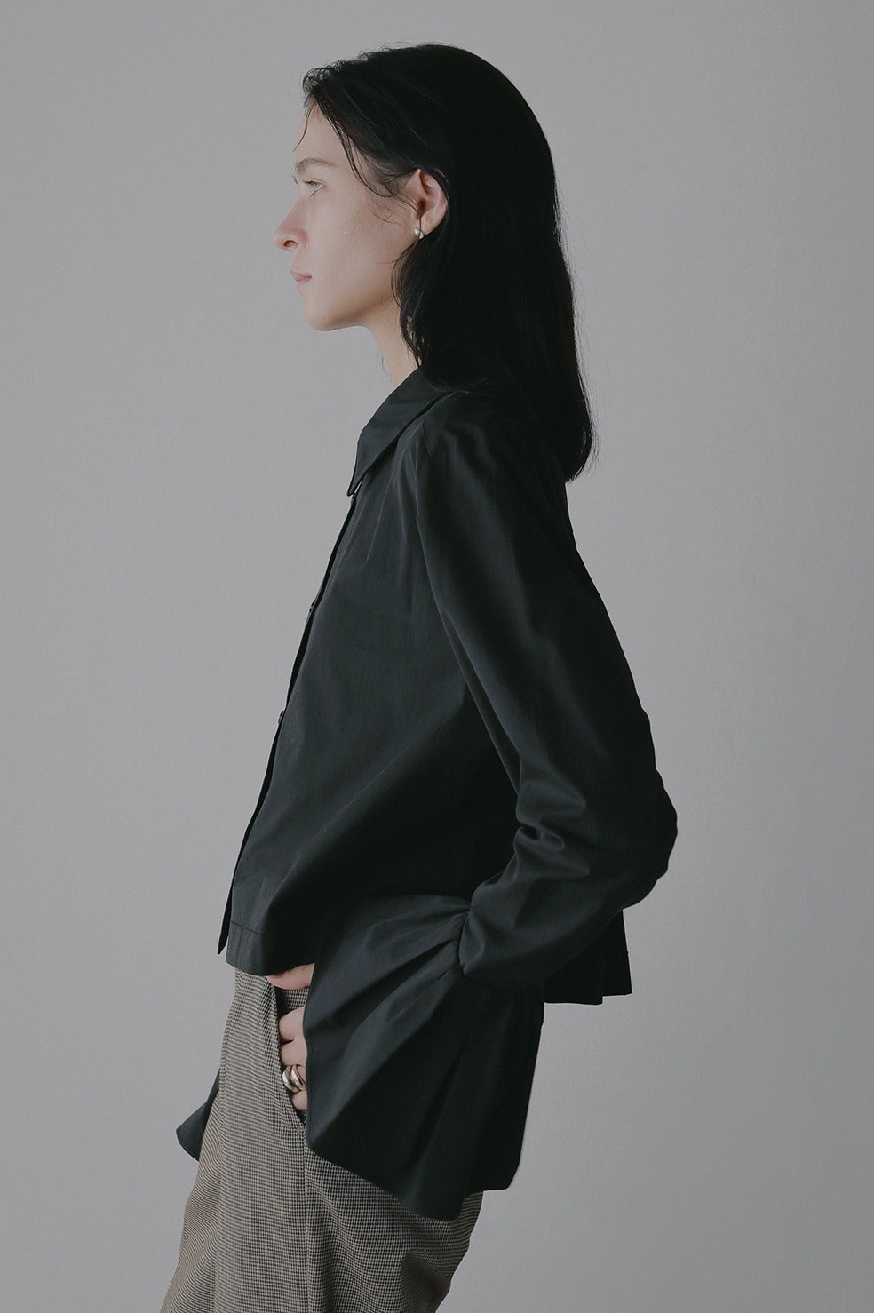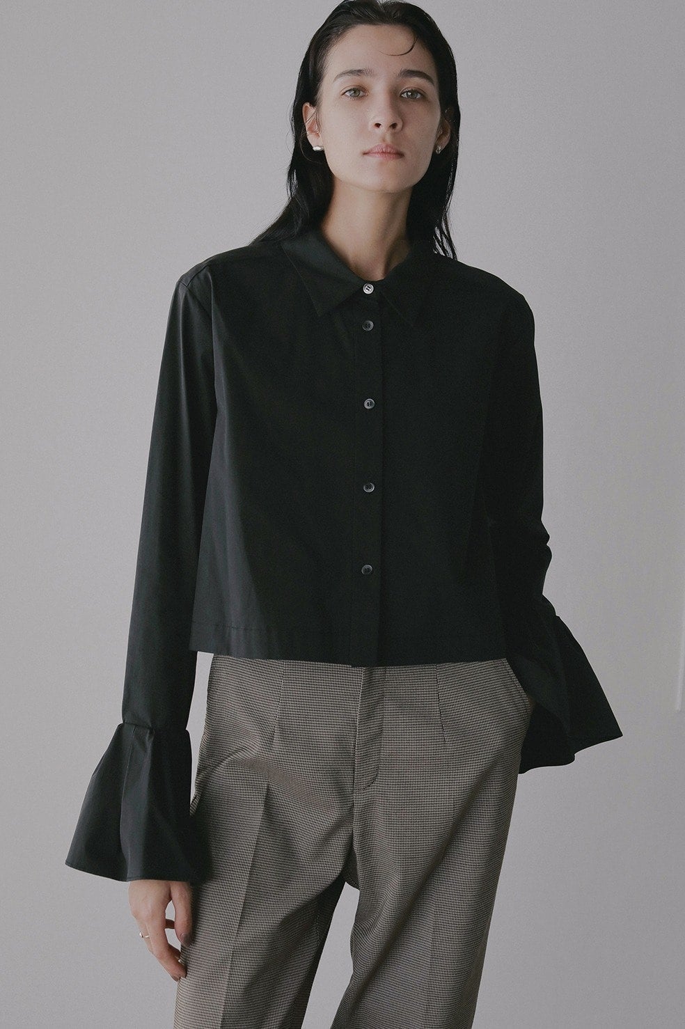 ボトムスとのバランスが取りやすいショート丈と、袖のフリルデザインが引き立つコンパクトな襟のバランスが絶妙な一着です。