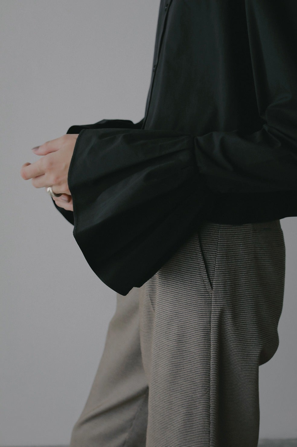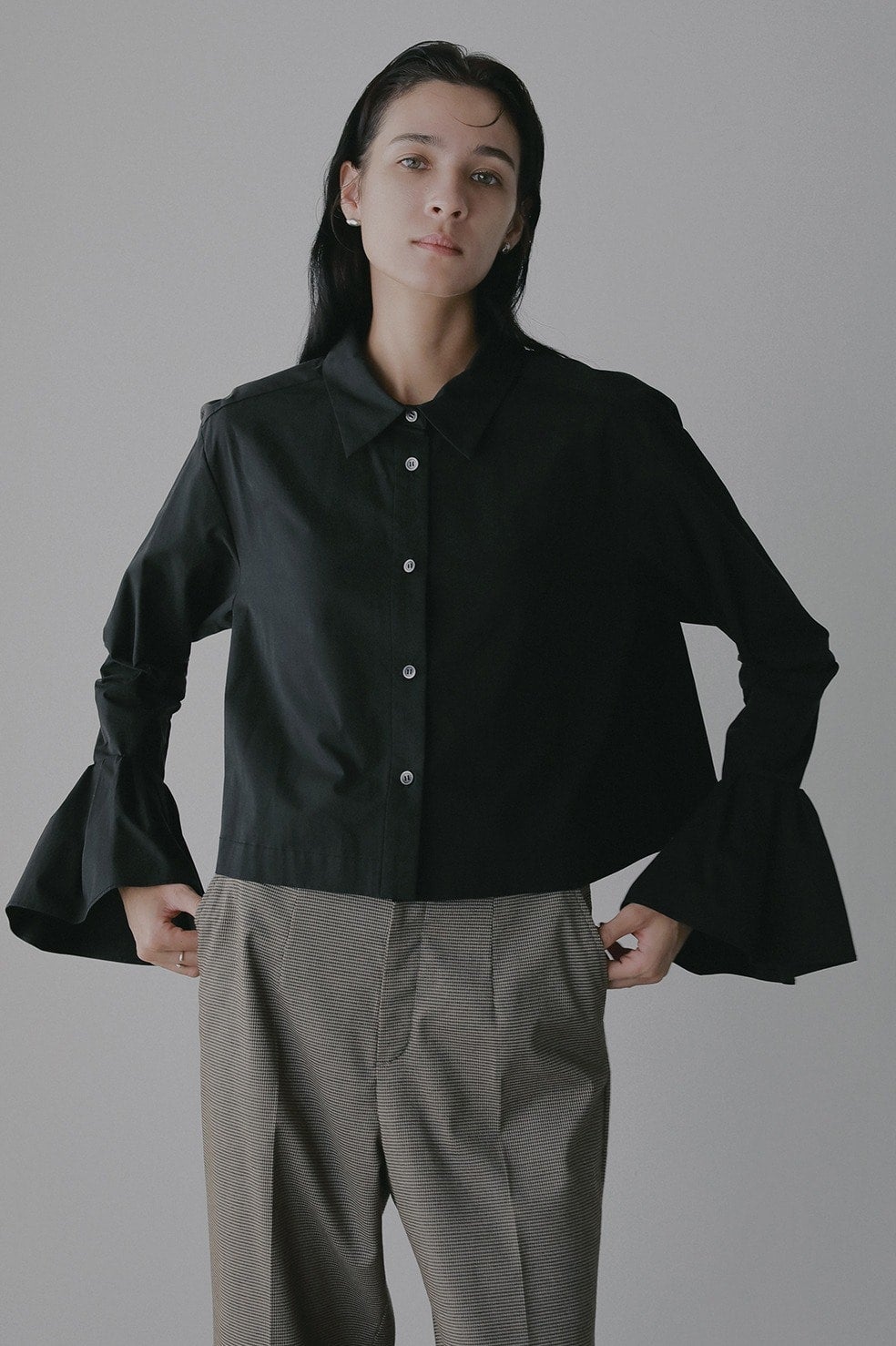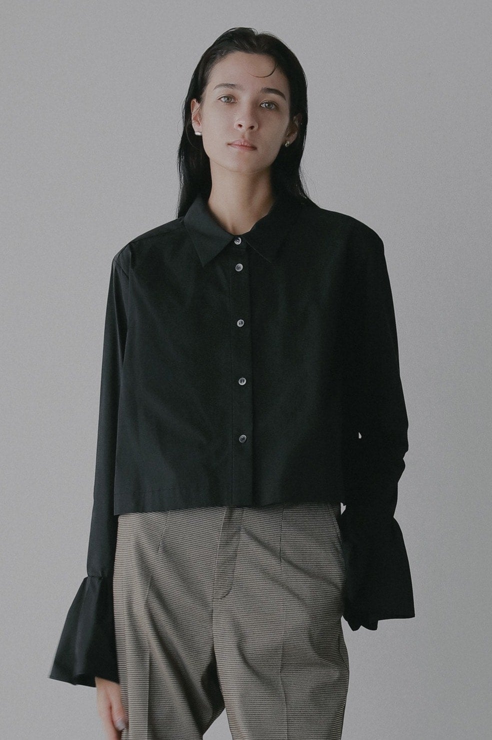 ショート丈と袖のフリルデザインがポイントのシャツ。