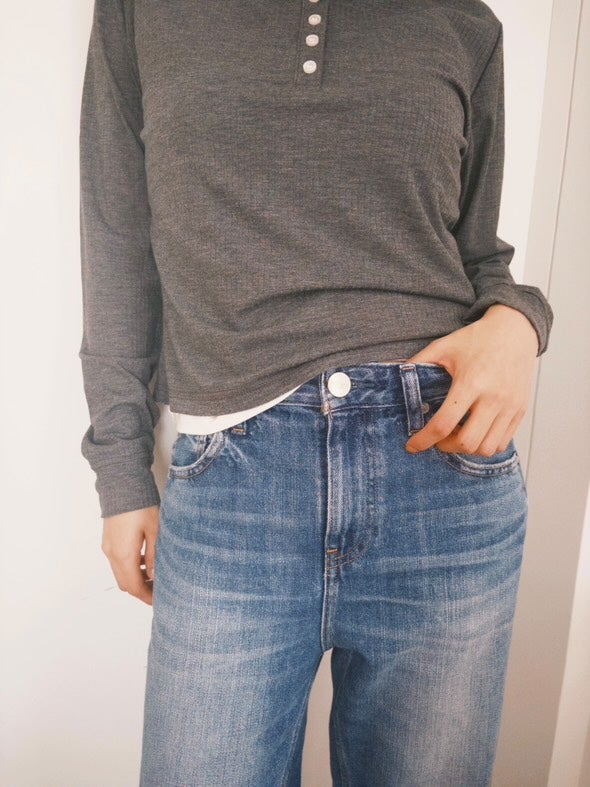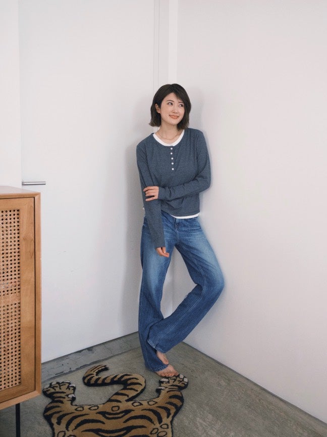 ストレートで美しい形のデニムにレイヤートップスを合わせて、